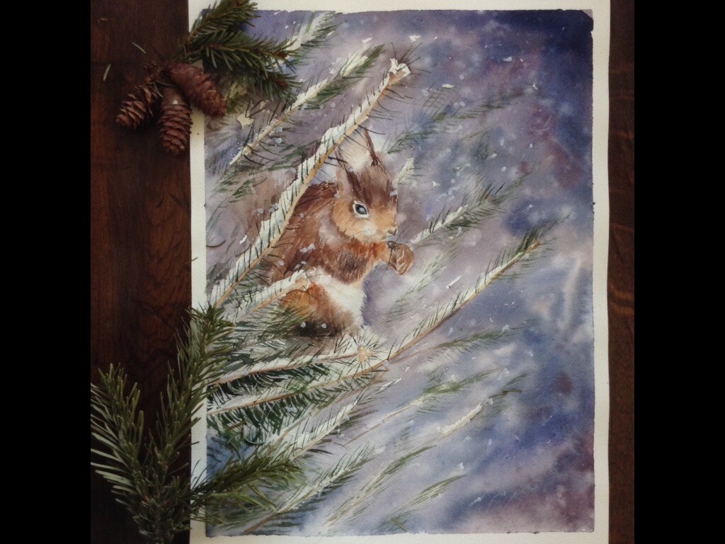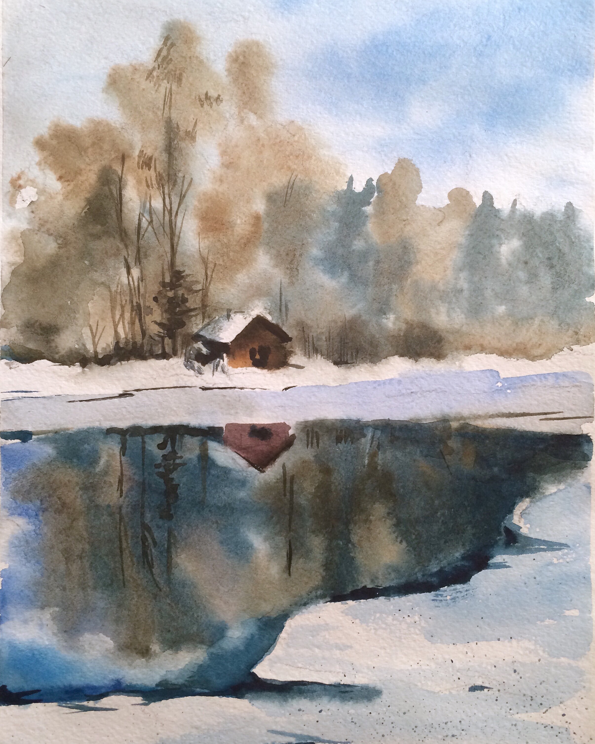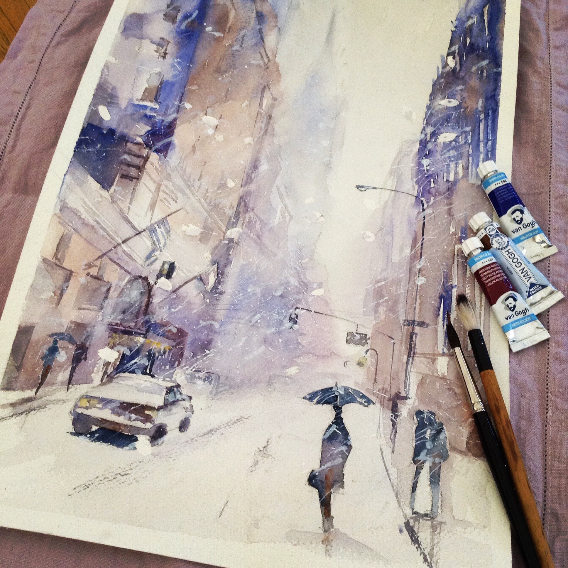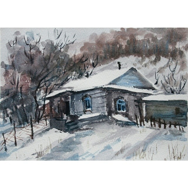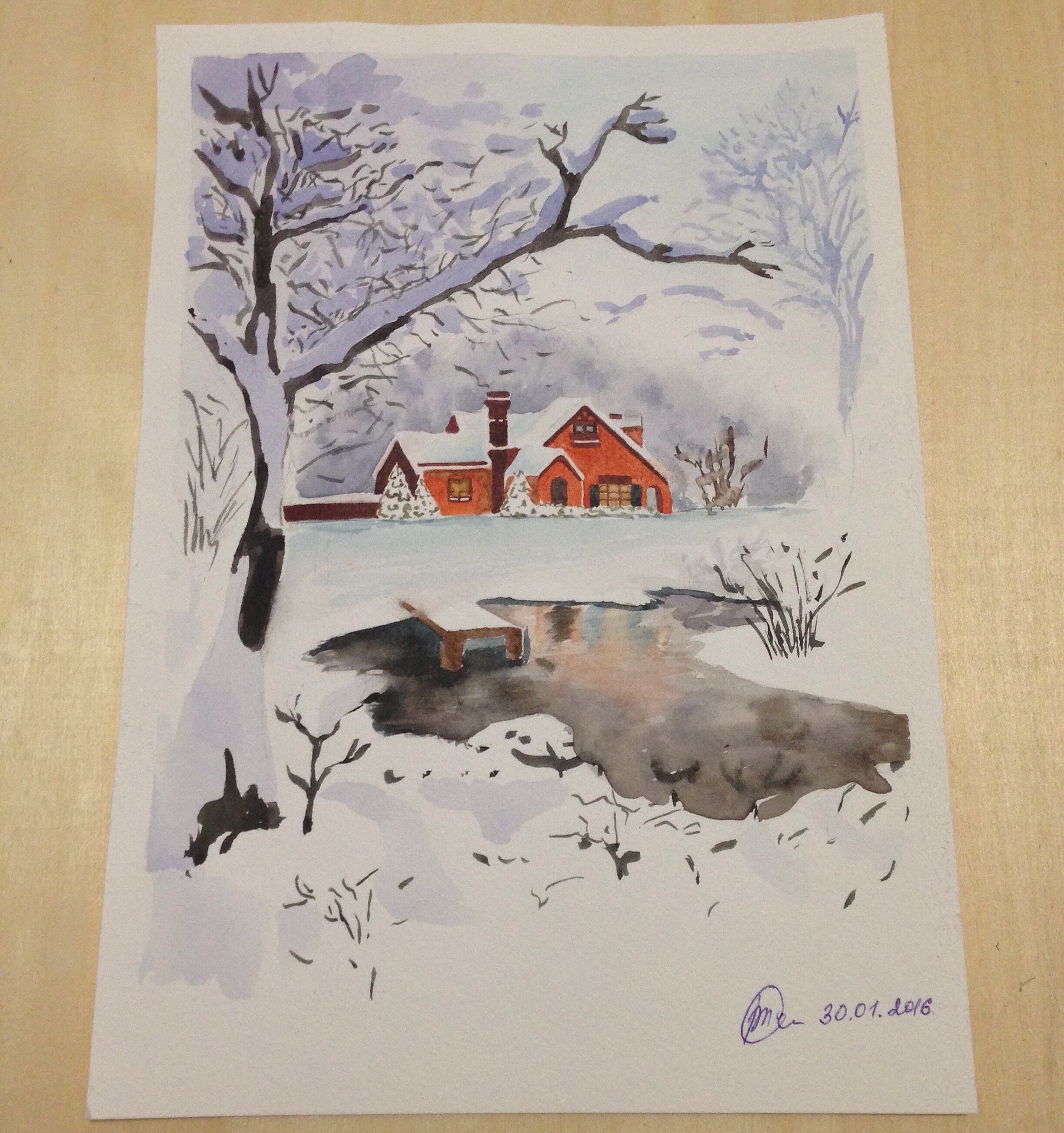 Акварель при нормальных условиях можно немного исправить, при морозе исправить уже ничего нельзя. Убрал кисть от бумаги-считай всё, ни размыть, ни добавить...