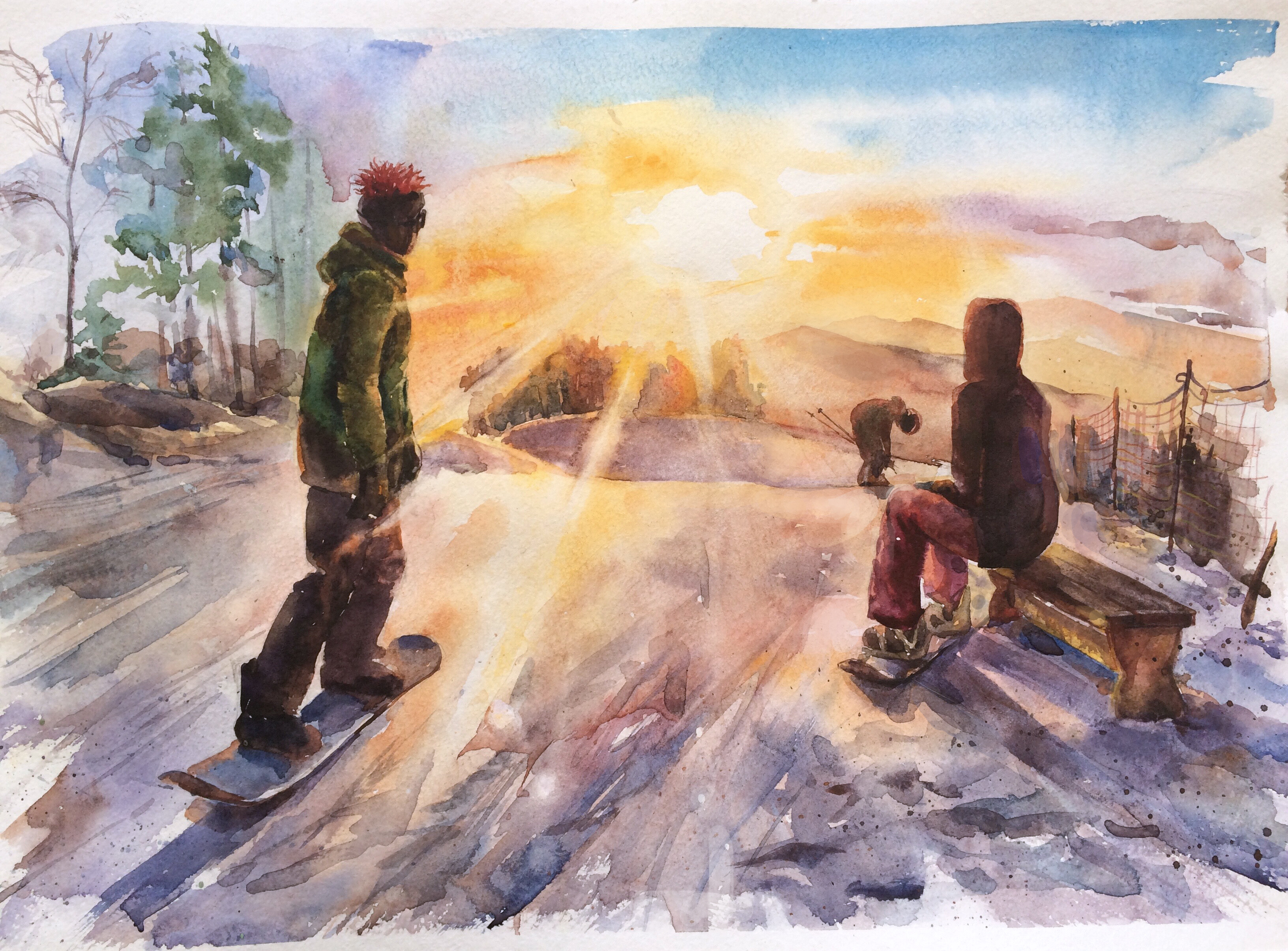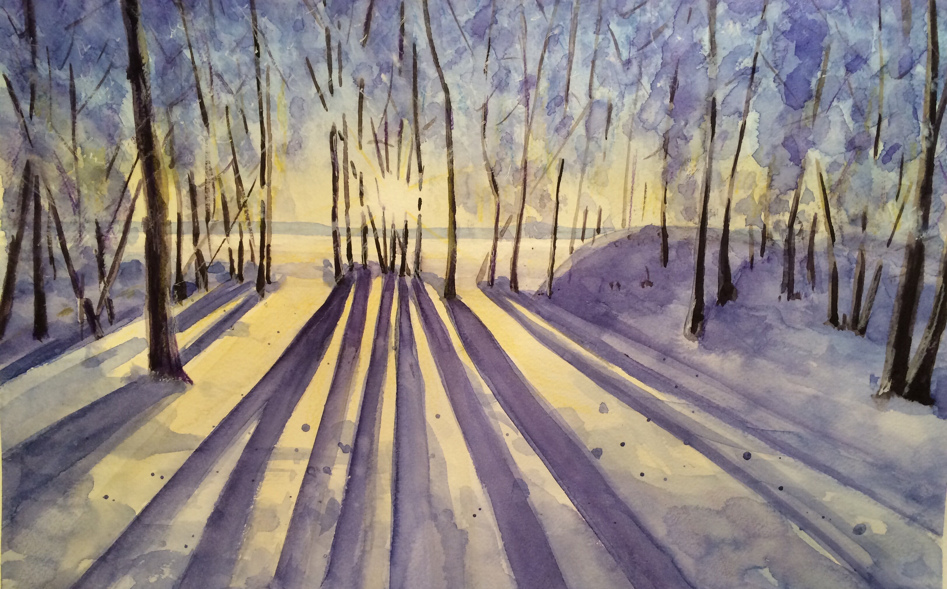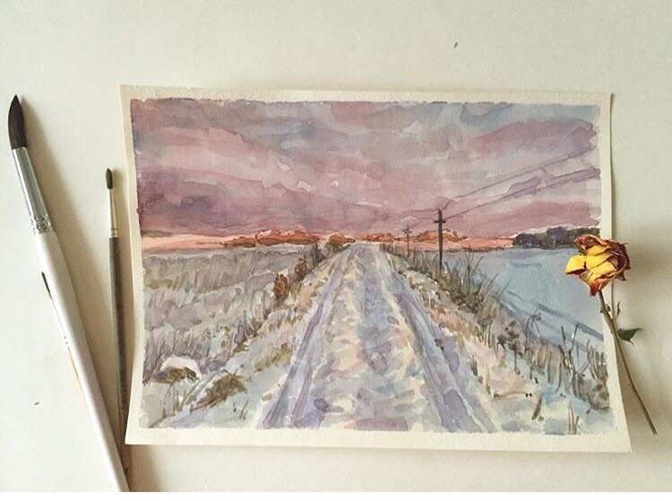 Читать дальшеДля того, чтобы нарисовать этот пейзаж, я уехала за 200 км в заснеженное Ширяево на другом берегу Волги. В минус 17 градусов я ставила акварельный эксперимент: пленер в мороз под снегом. Руки замерзли быстро, еще быстрее замерзла акварель. Некоторые участки так и высохли-со следами ледяных узоров, которыми покрылась краска. Кипяток из термоса спасал ситуацию на 2 минуты, после этого акварель снова становилась льдом. Но ощущения прекрасные, зимний пейзаж и акварель созданы друг для друга!
