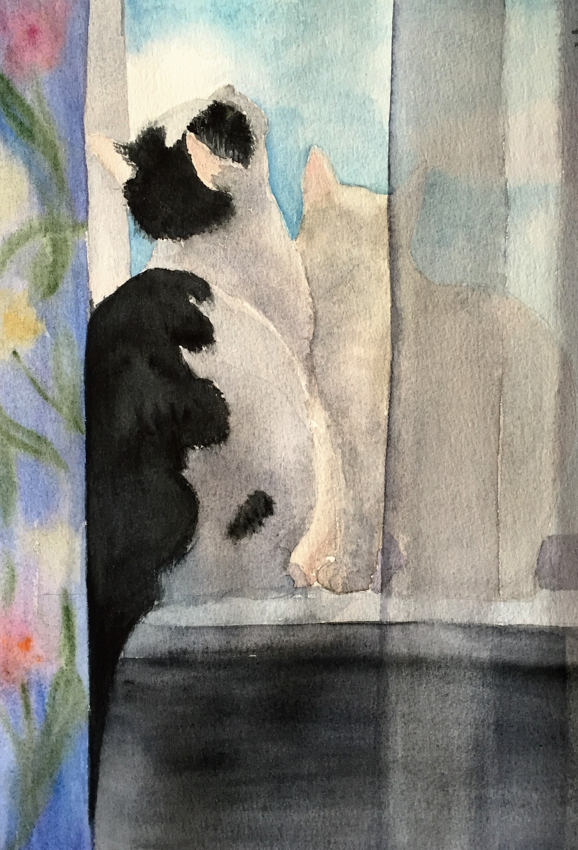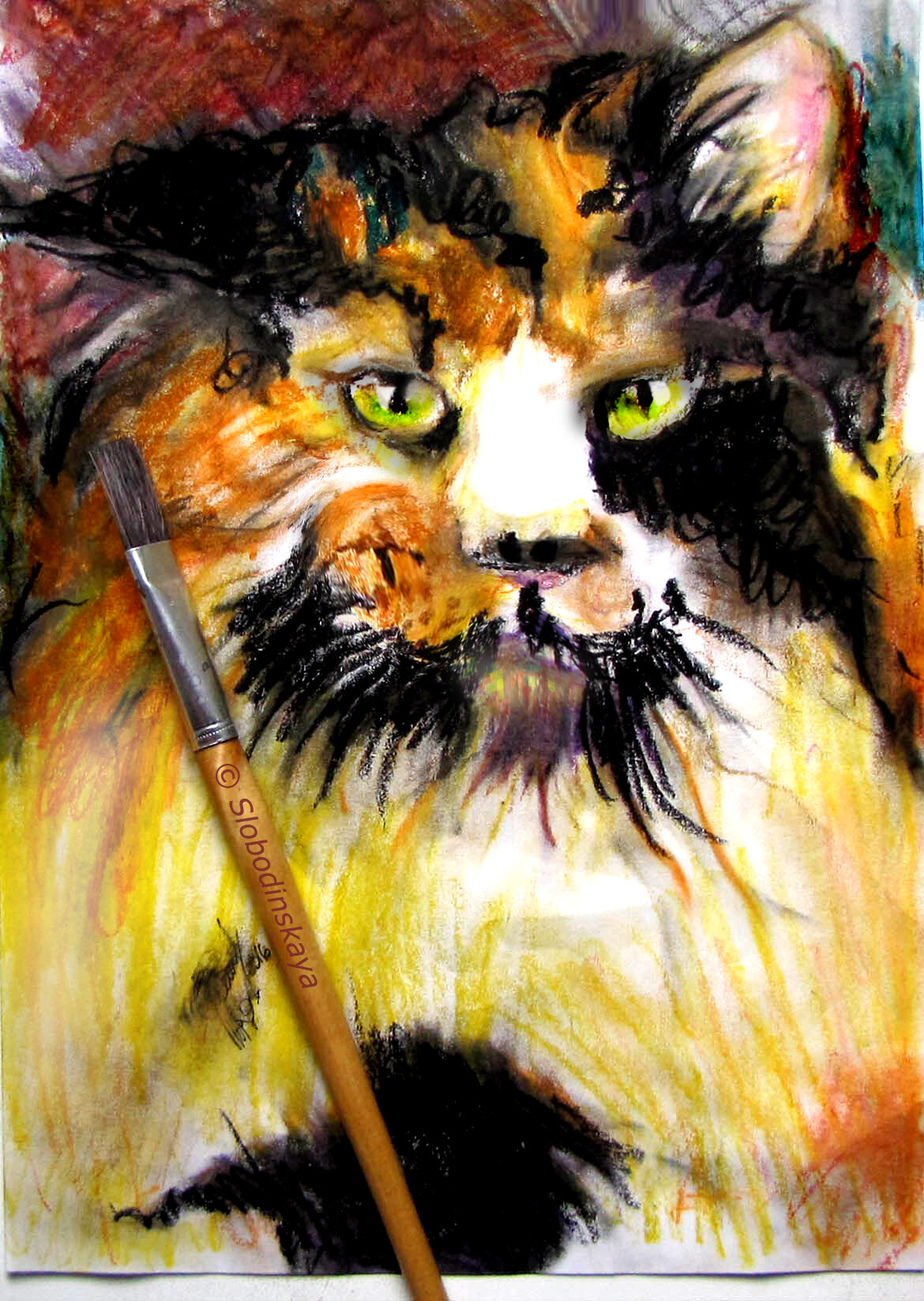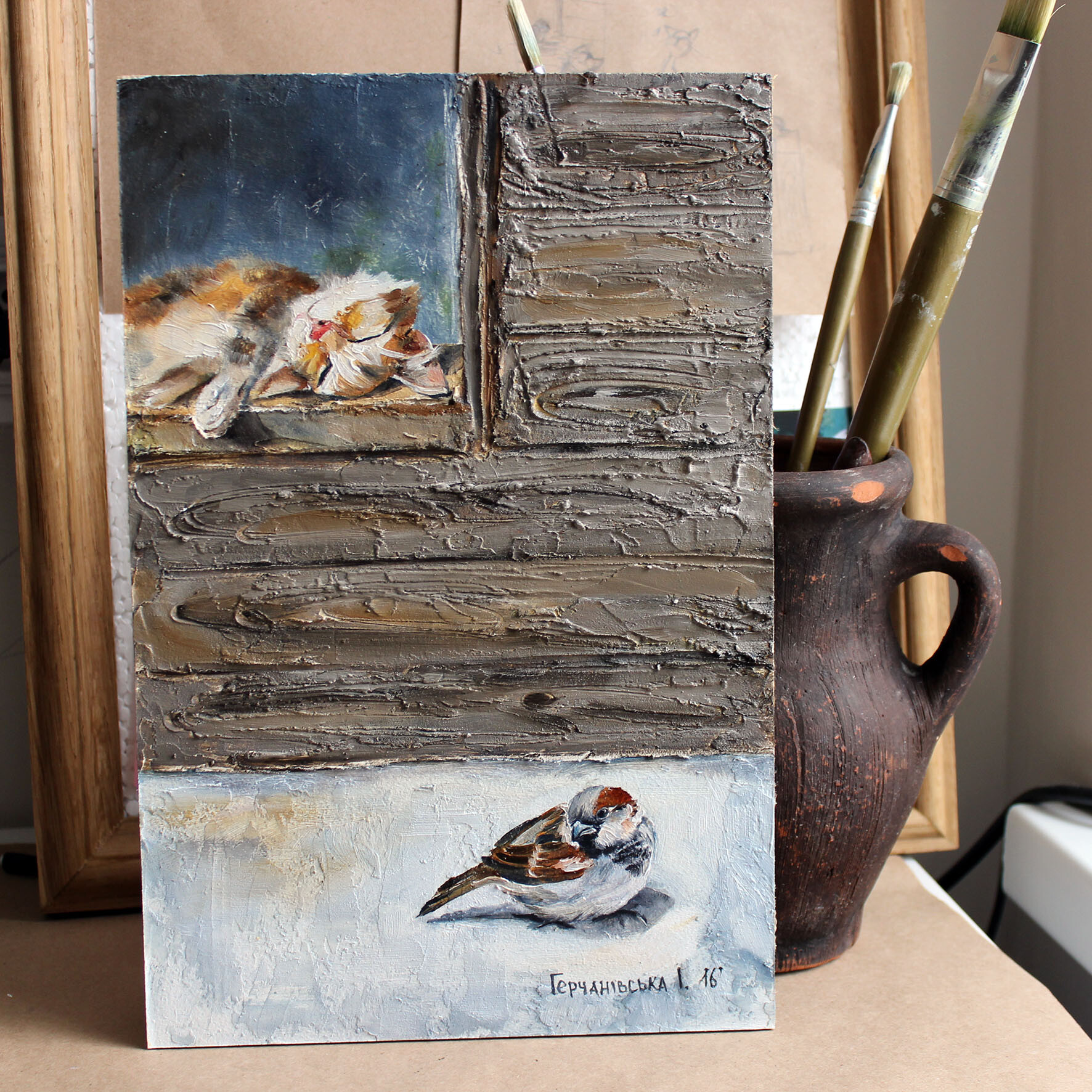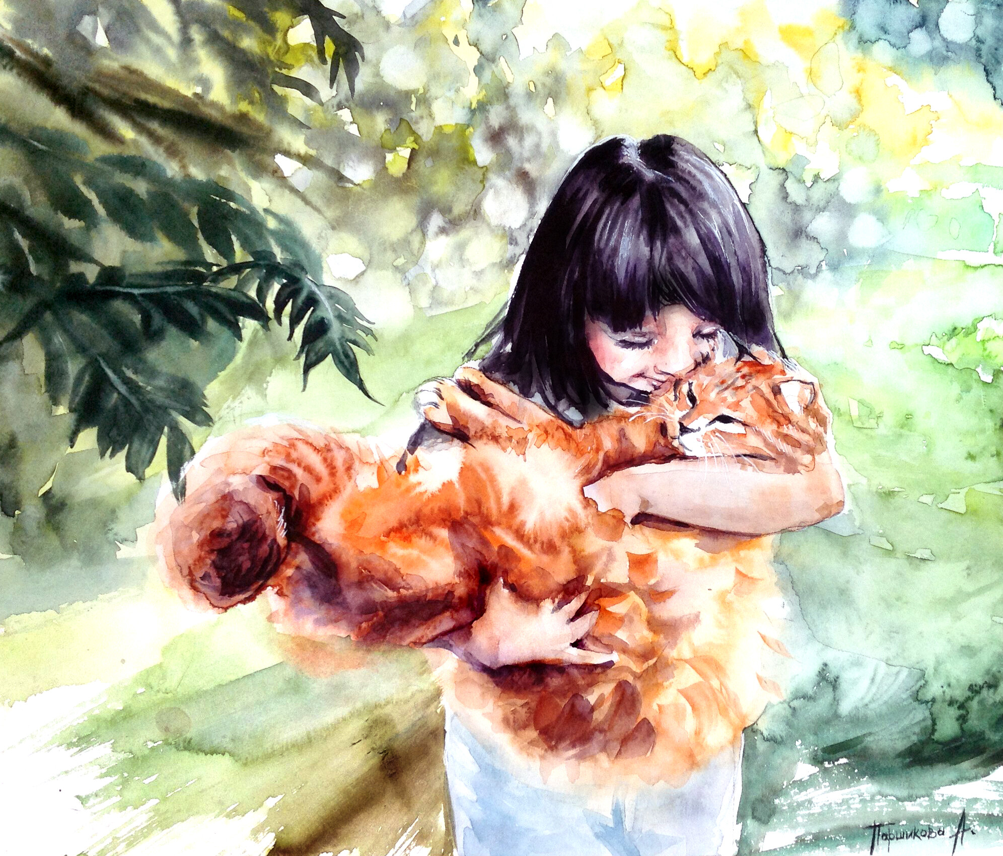Мы выбрали две работы, на которых есть не только кот, но и настроение, эмоции, особая атмосфера, которая живо переносит нас в тот самый миг с картинки: