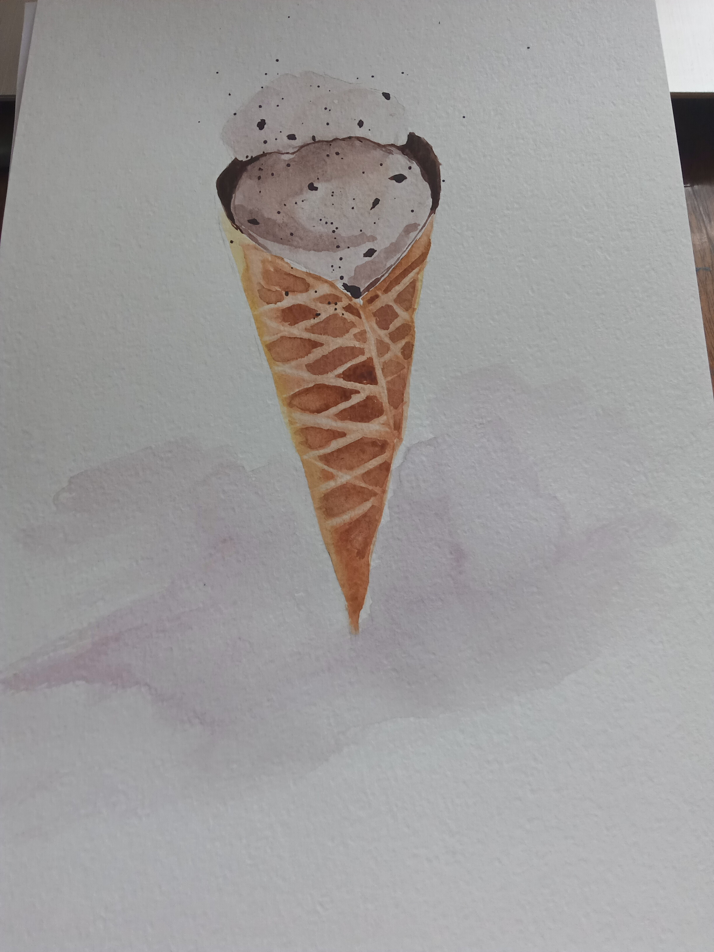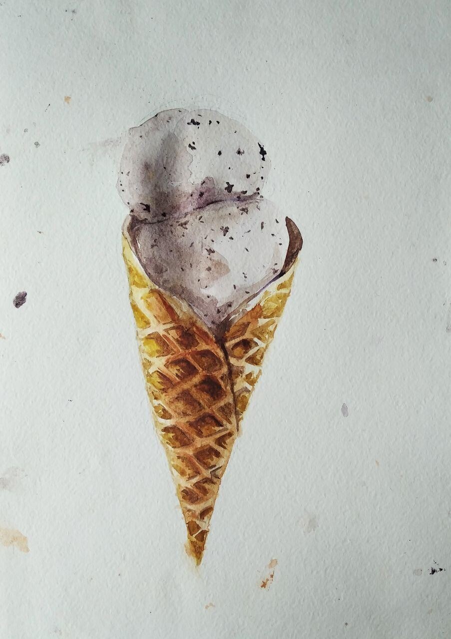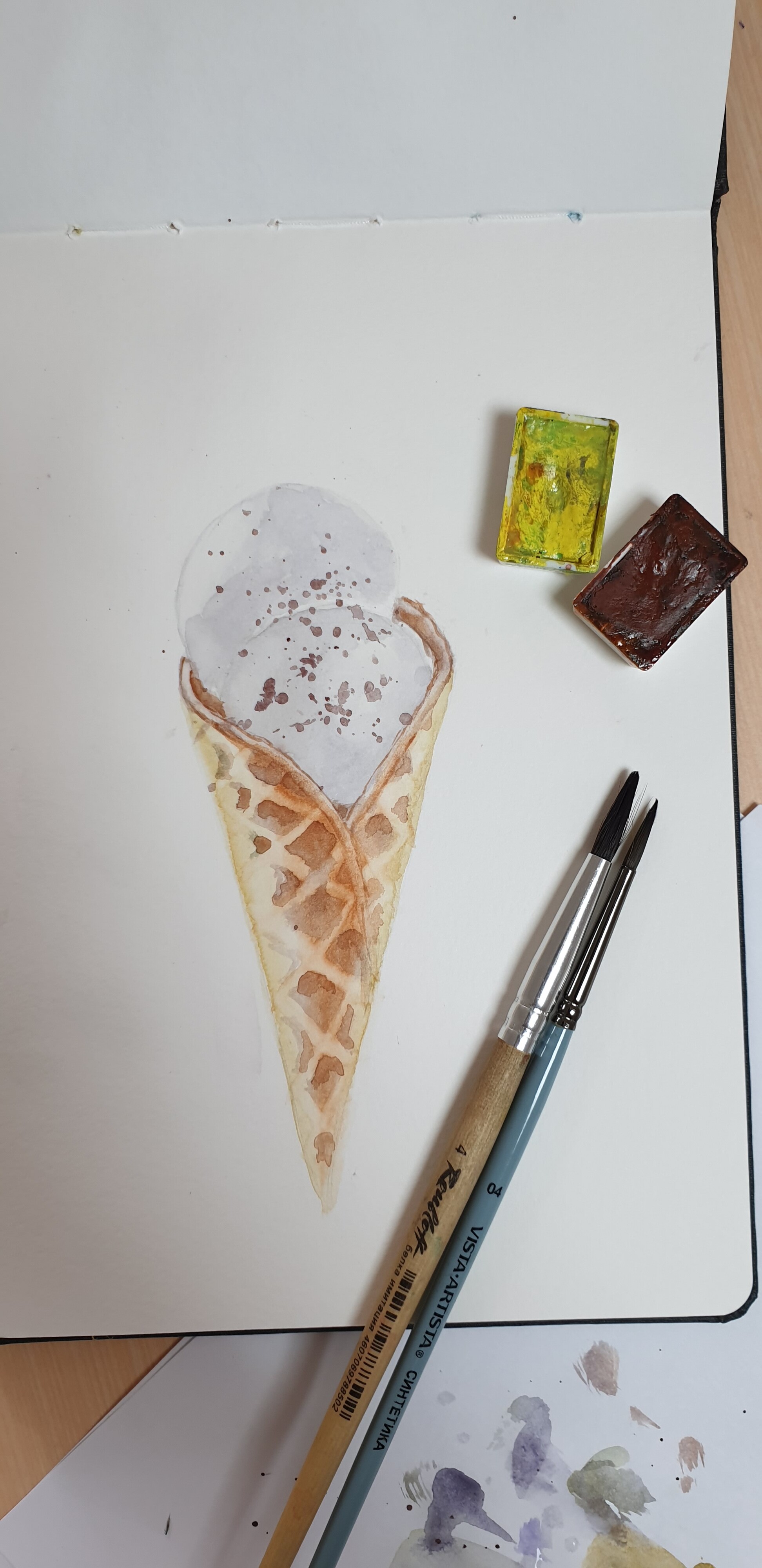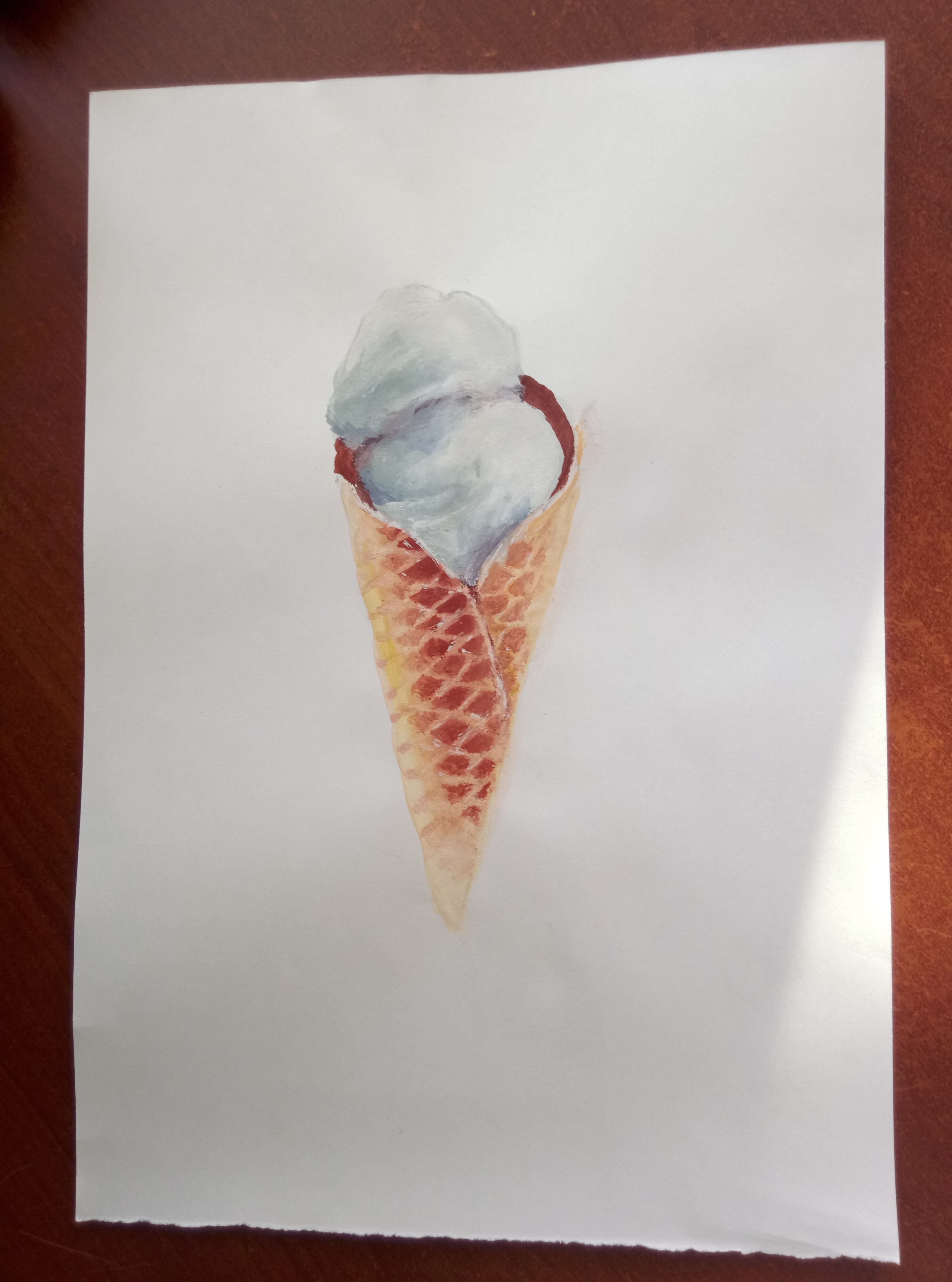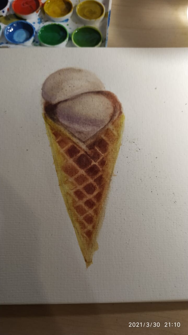 Тени мороженого подчеркиваем холодным тоном коричневого с фиолетовой. Выбираем салфеткой и чистой влажной кистью осветленные места пока слой еще мокрый.