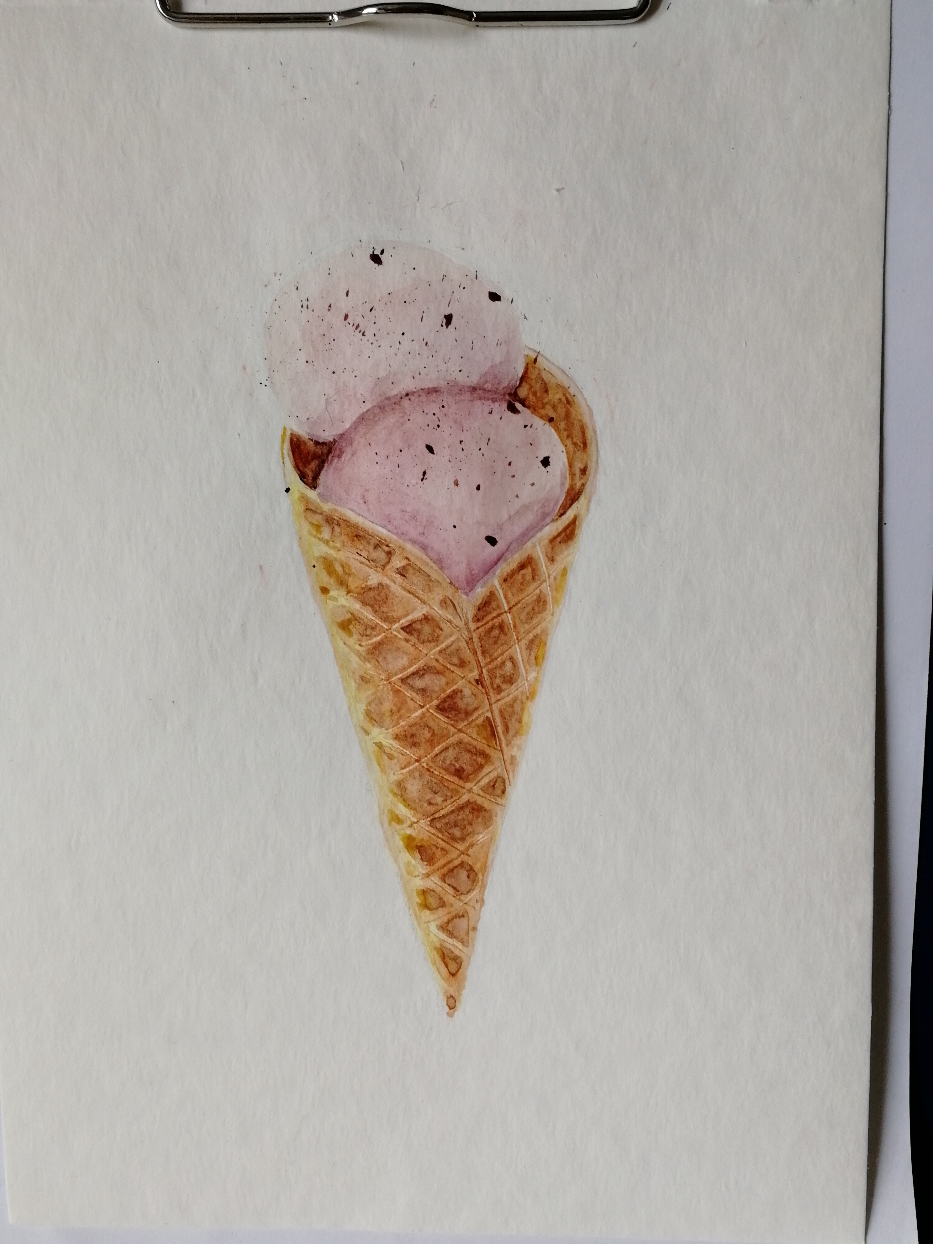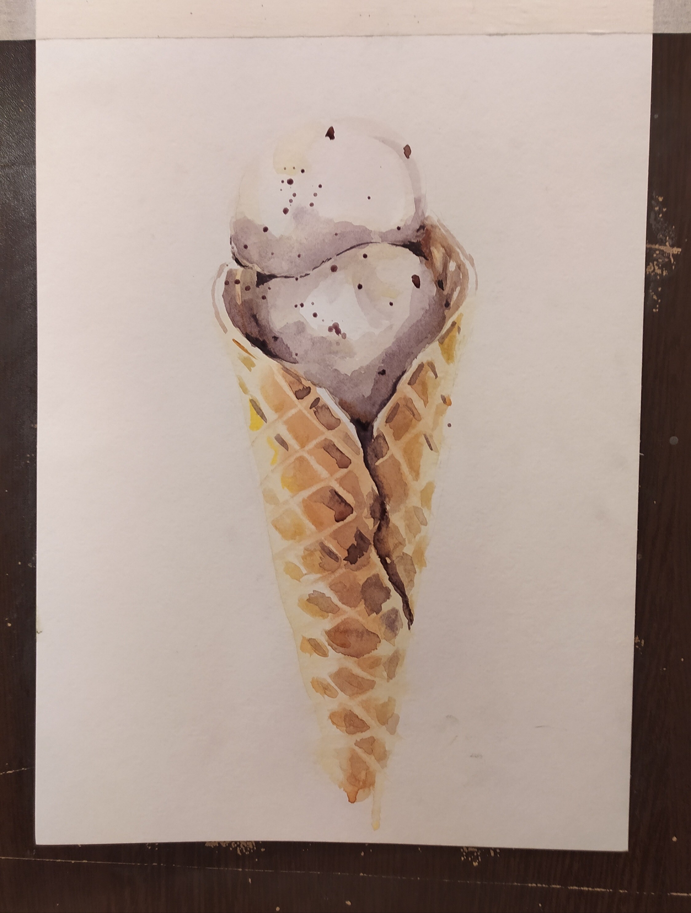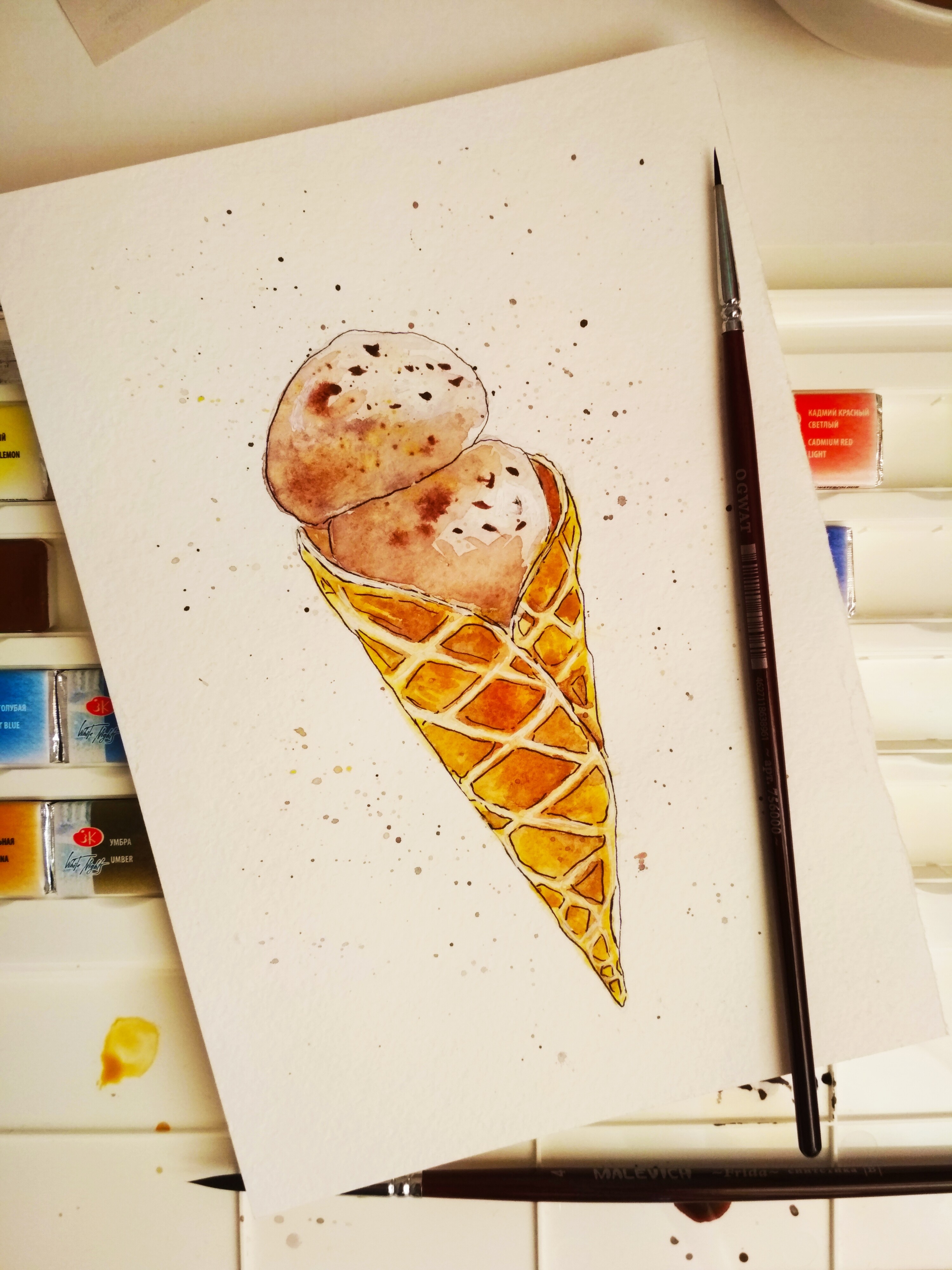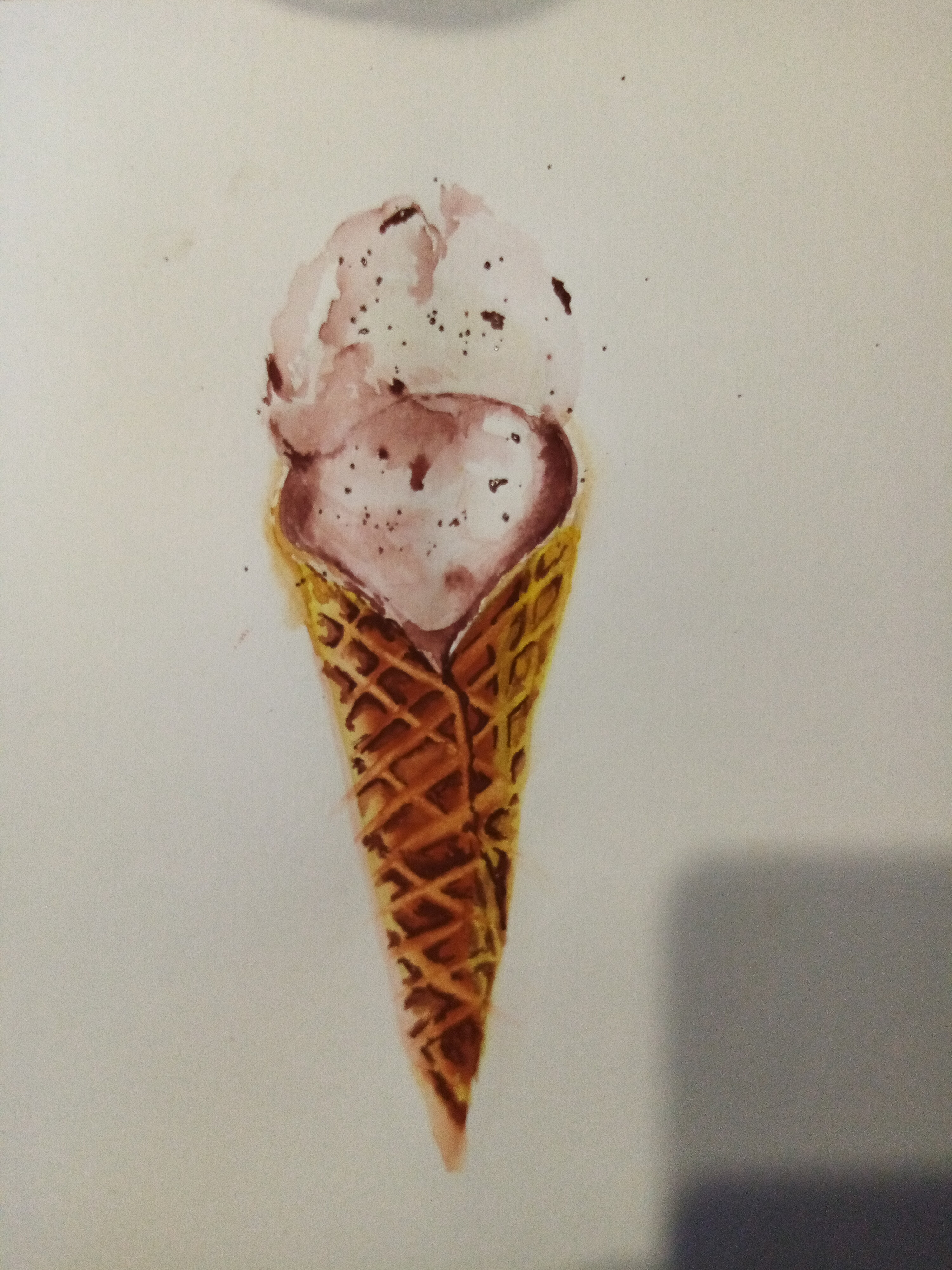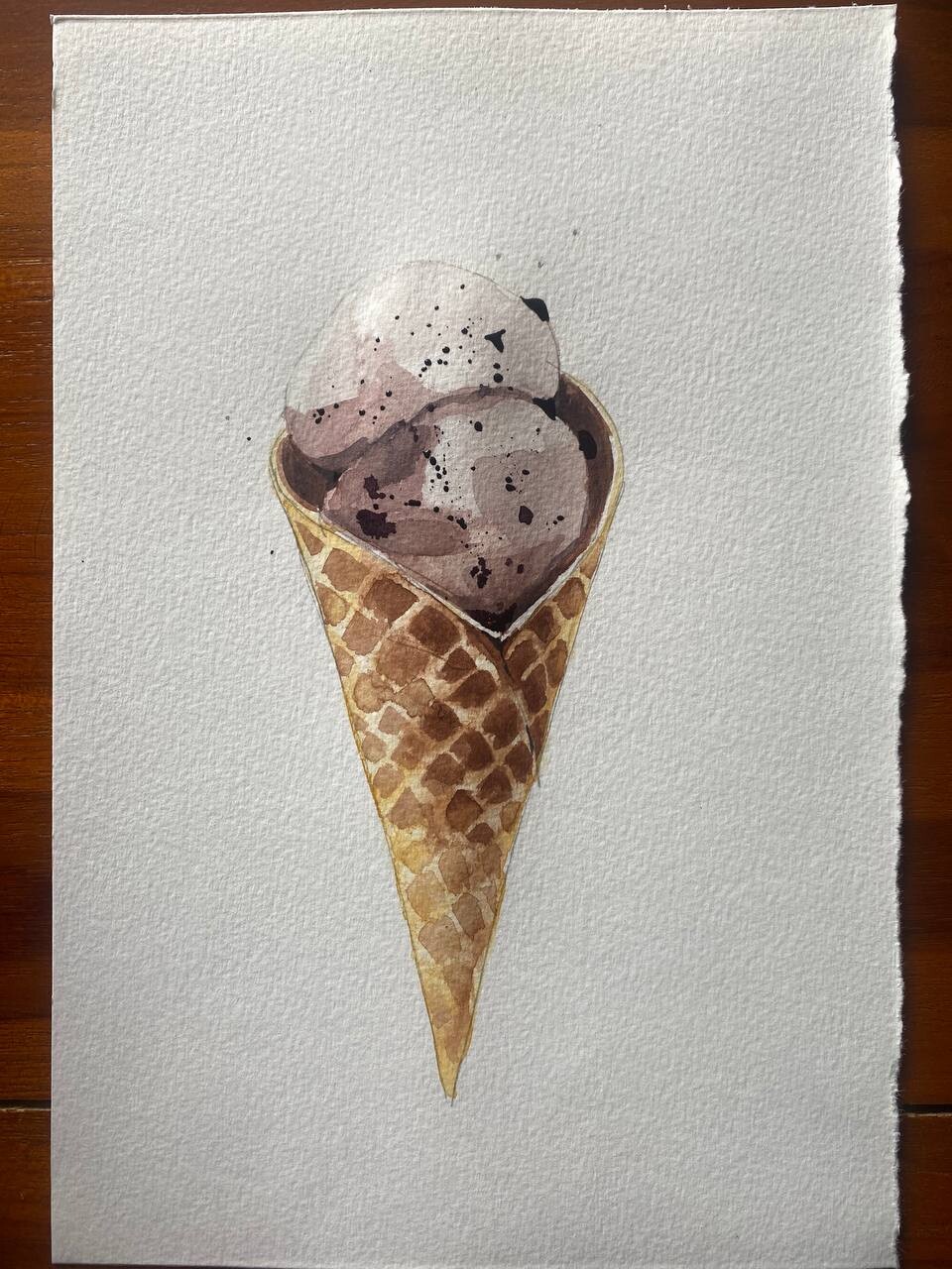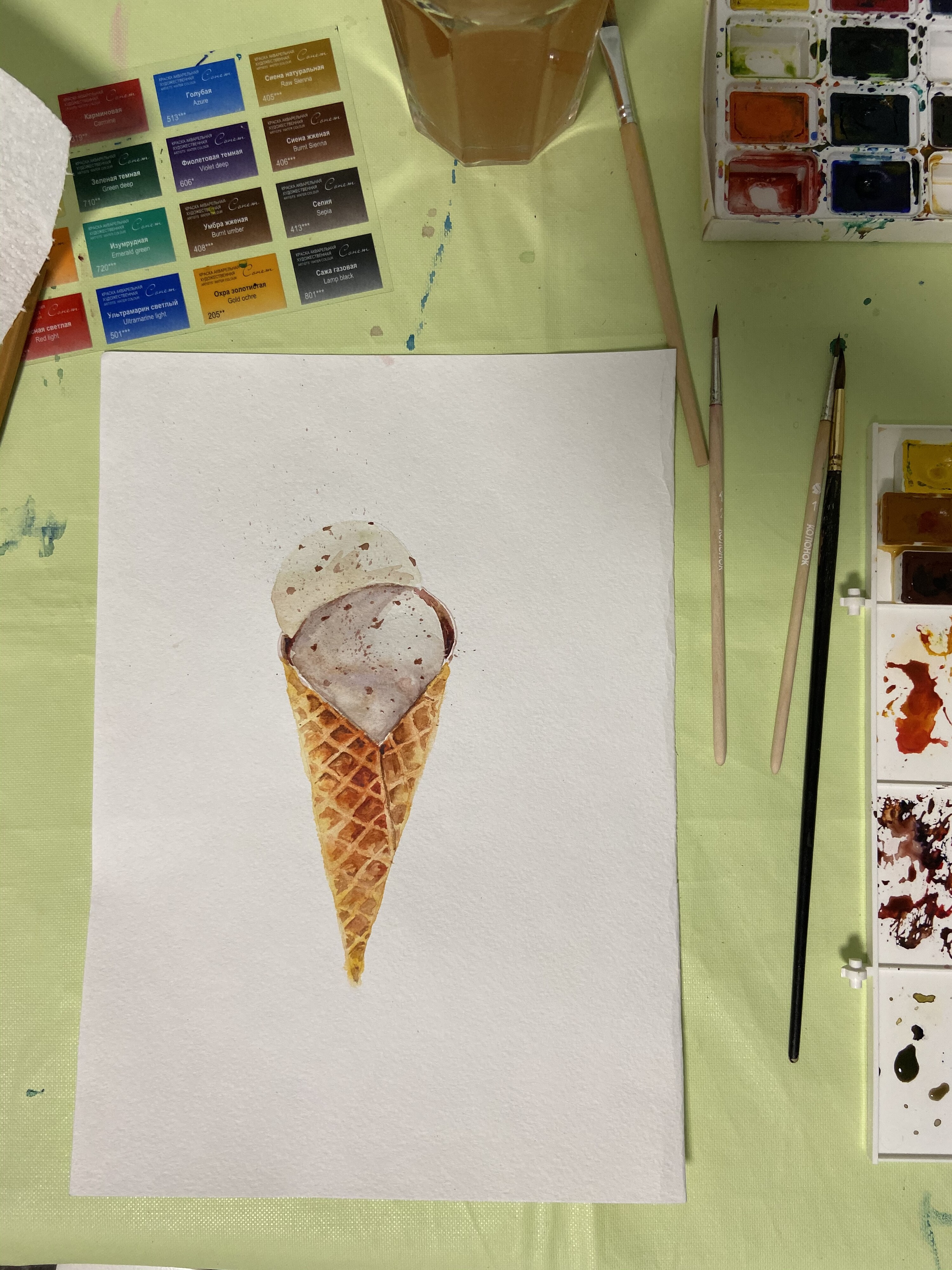 Тени мороженого подчеркиваем холодным тоном коричневого с фиолетовой. Выбираем салфеткой и чистой влажной кистью осветленные места пока слой еще мокрый.