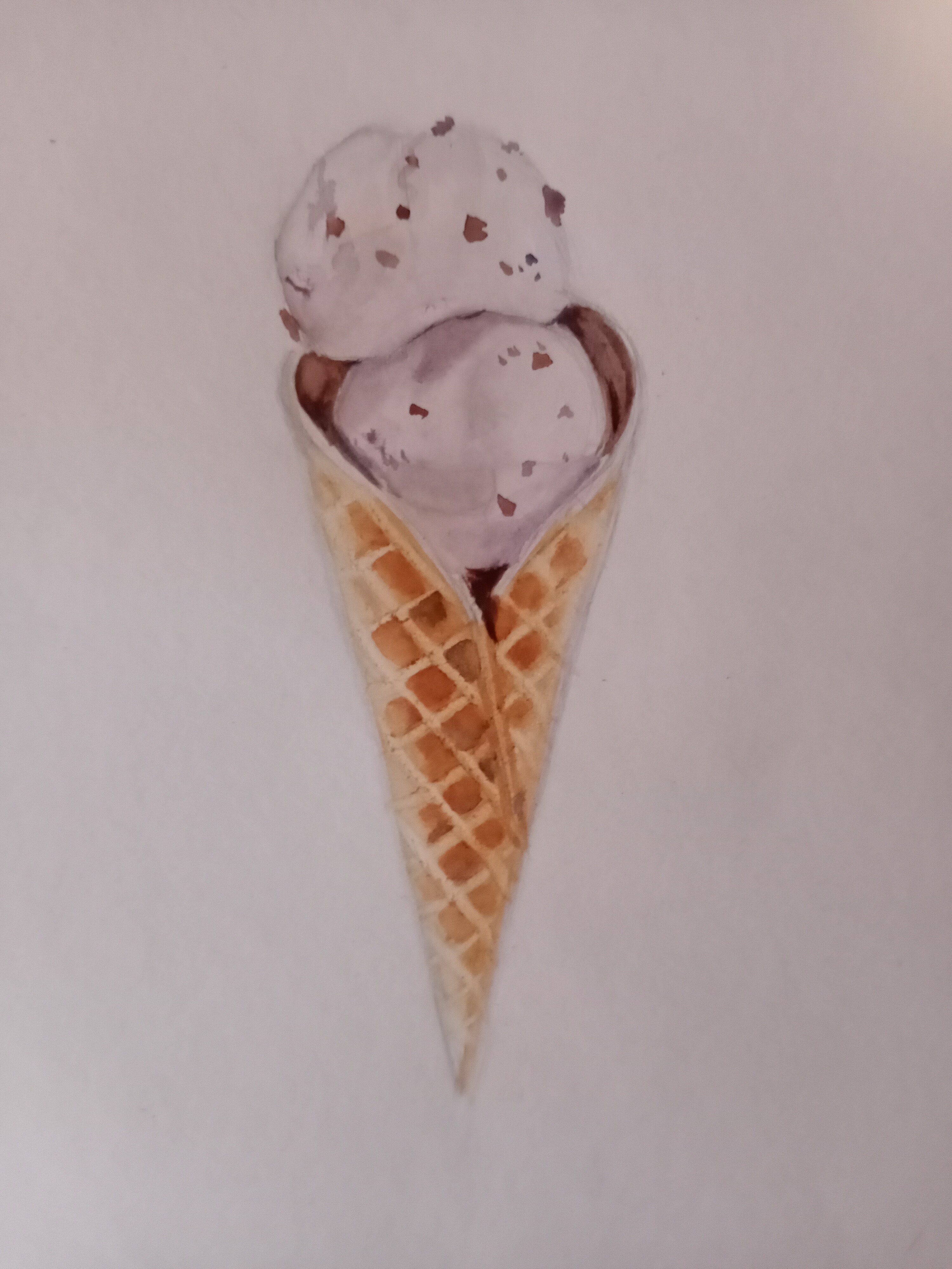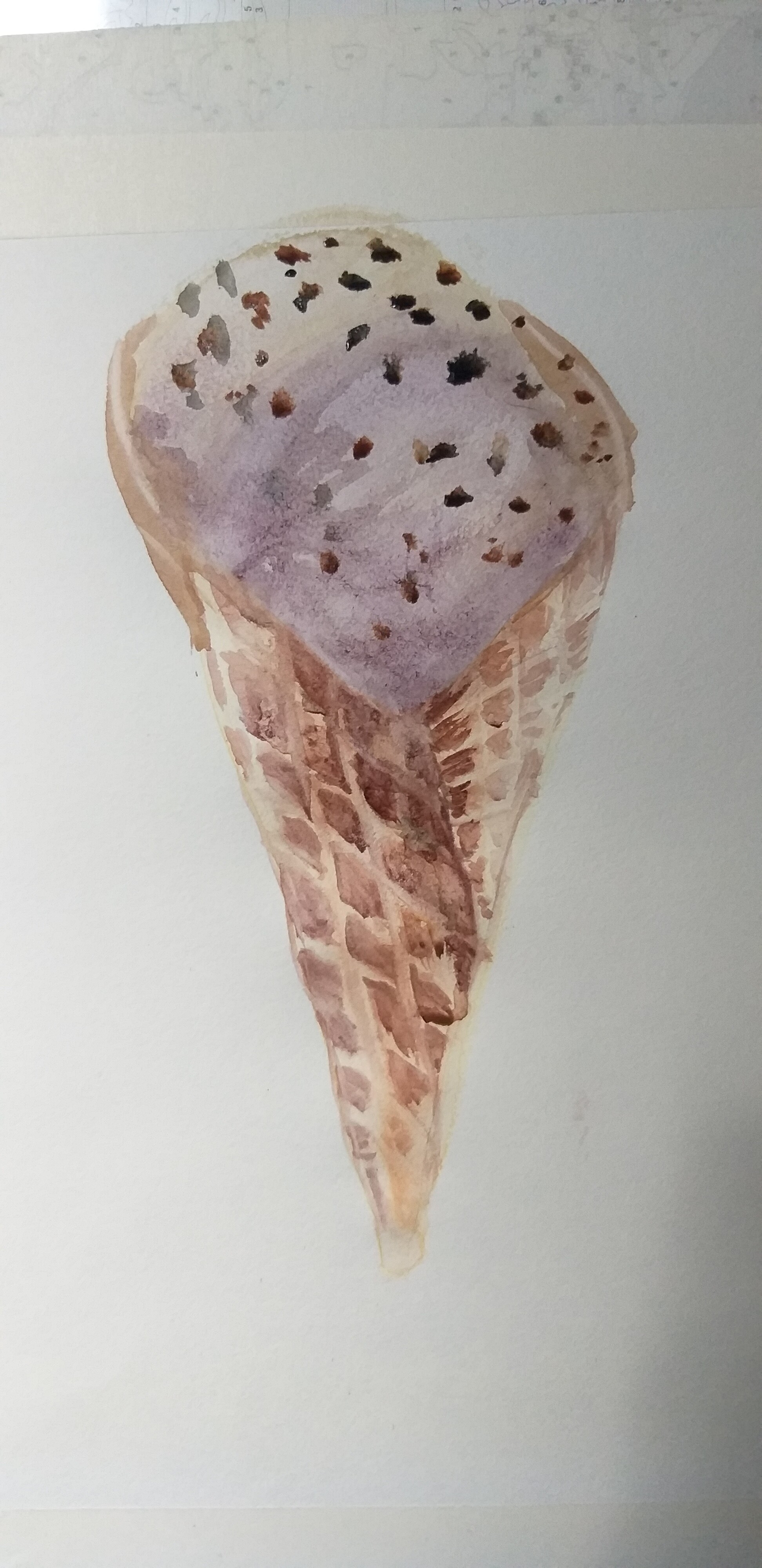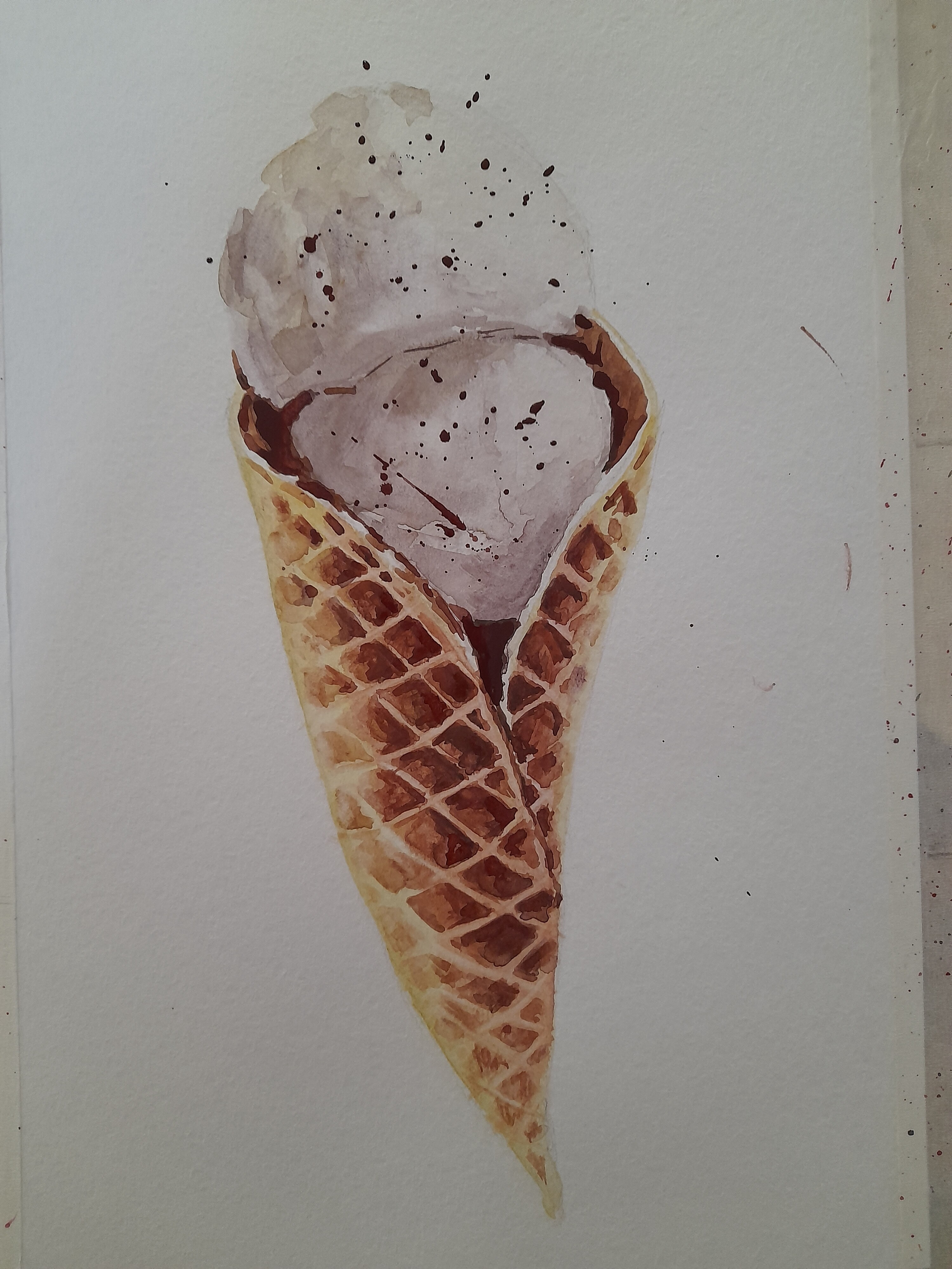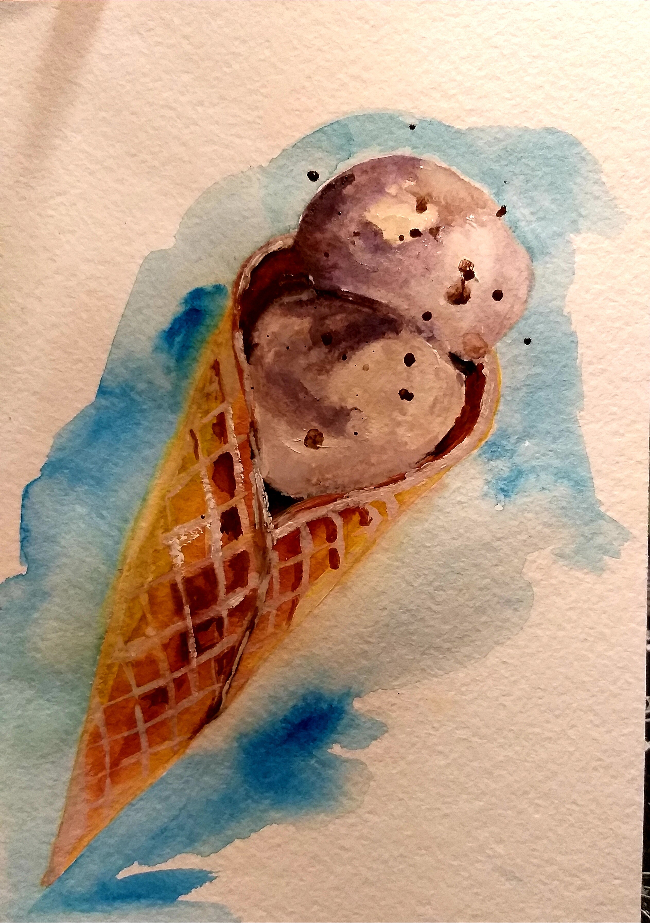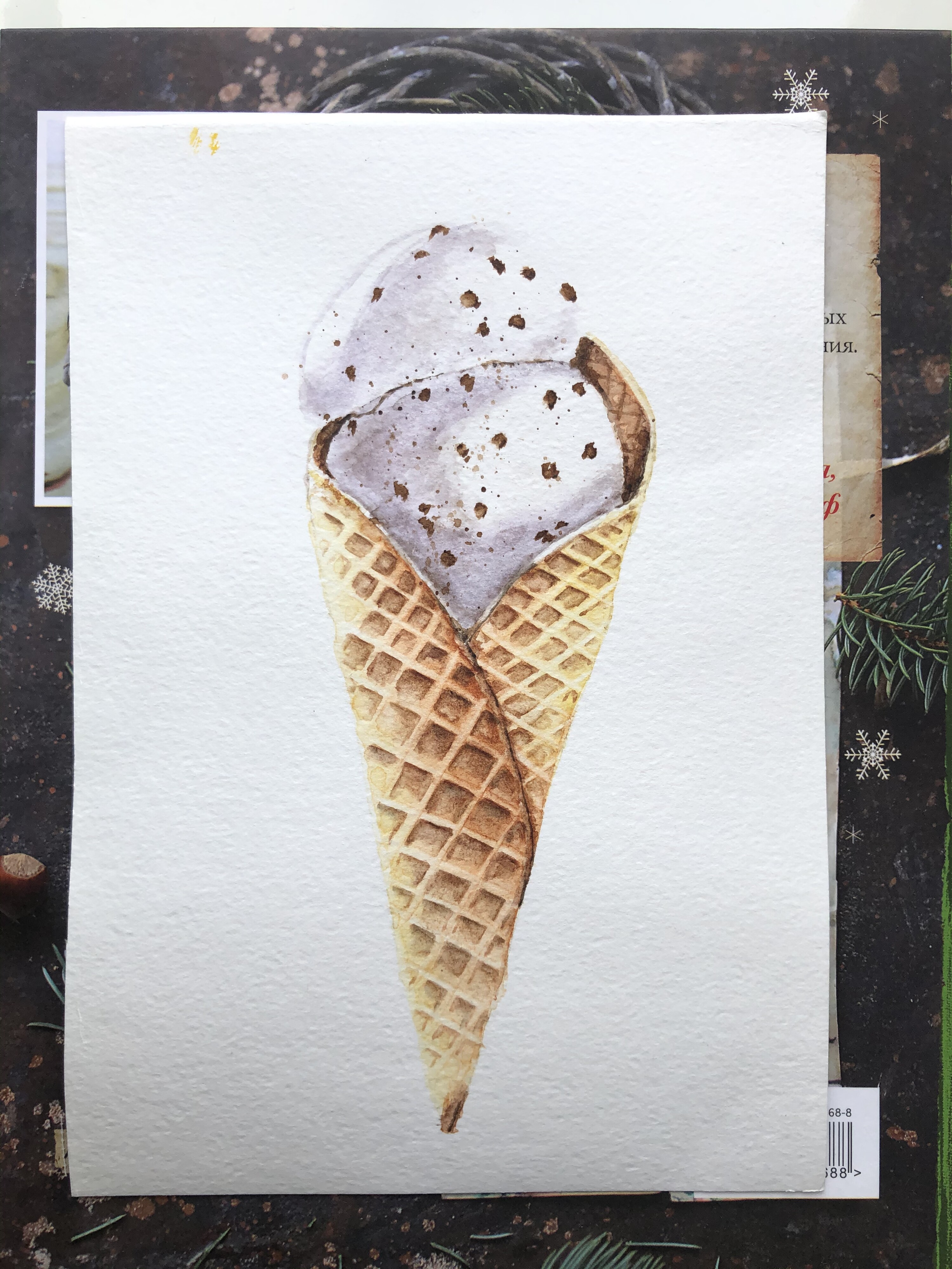 Тени мороженого подчеркиваем холодным тоном коричневого с фиолетовой. Выбираем салфеткой и чистой влажной кистью осветленные места пока слой еще мокрый.