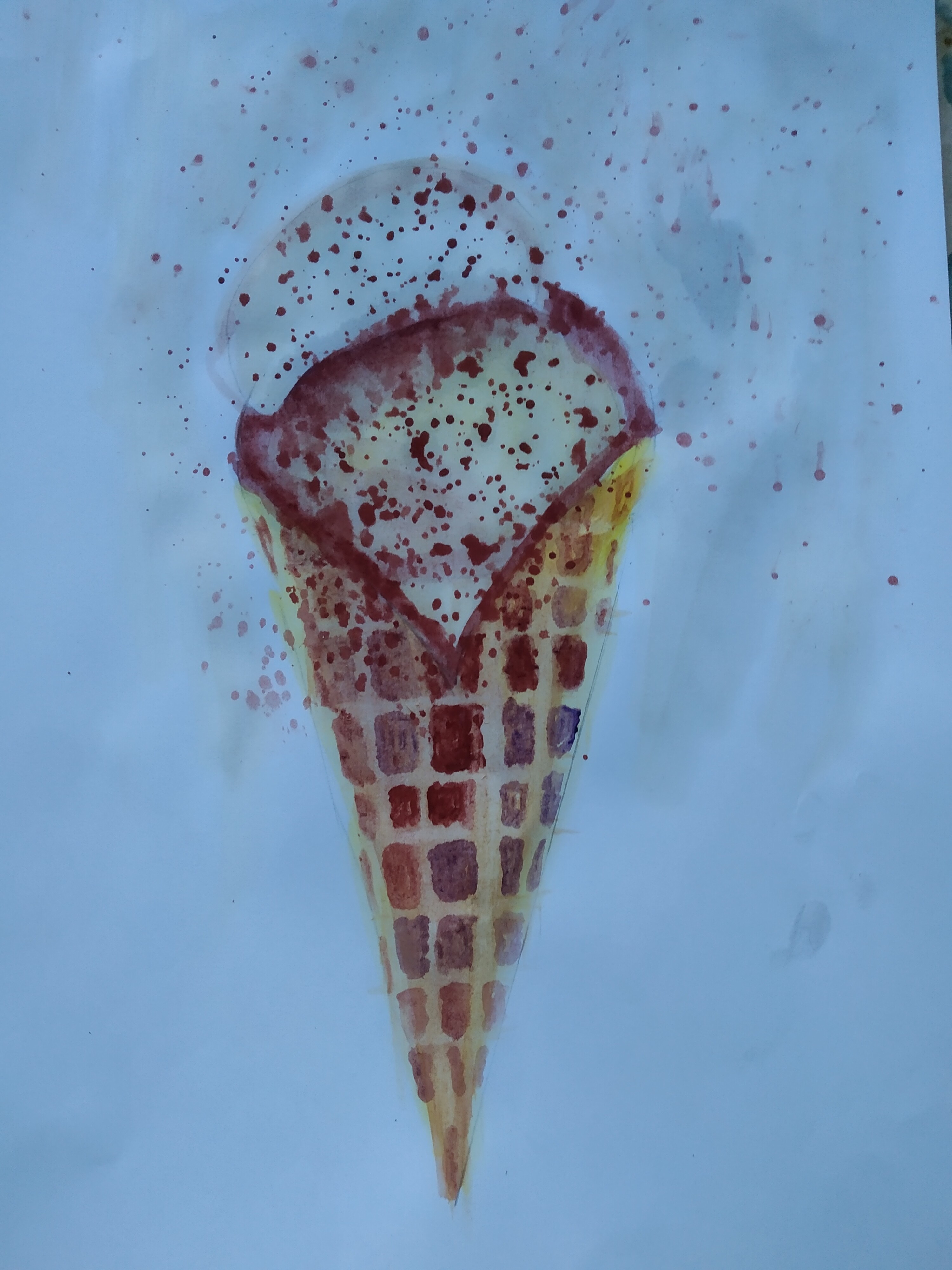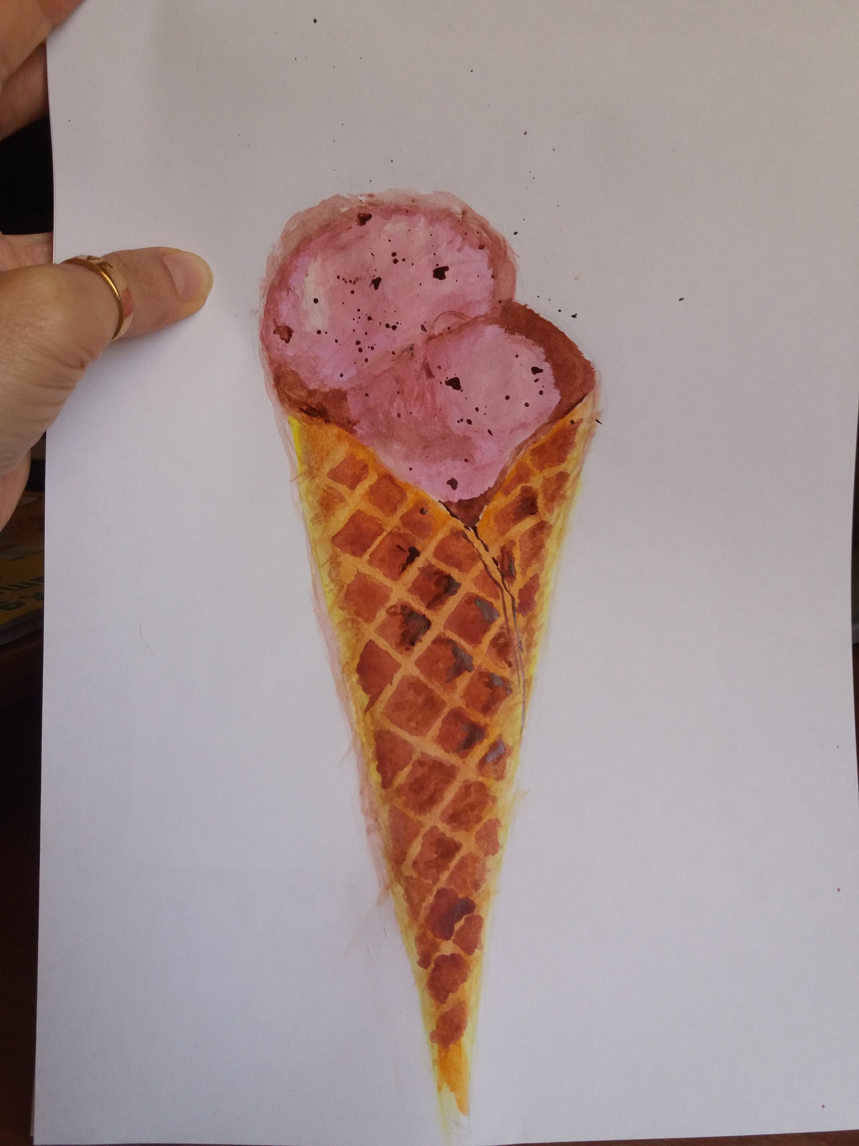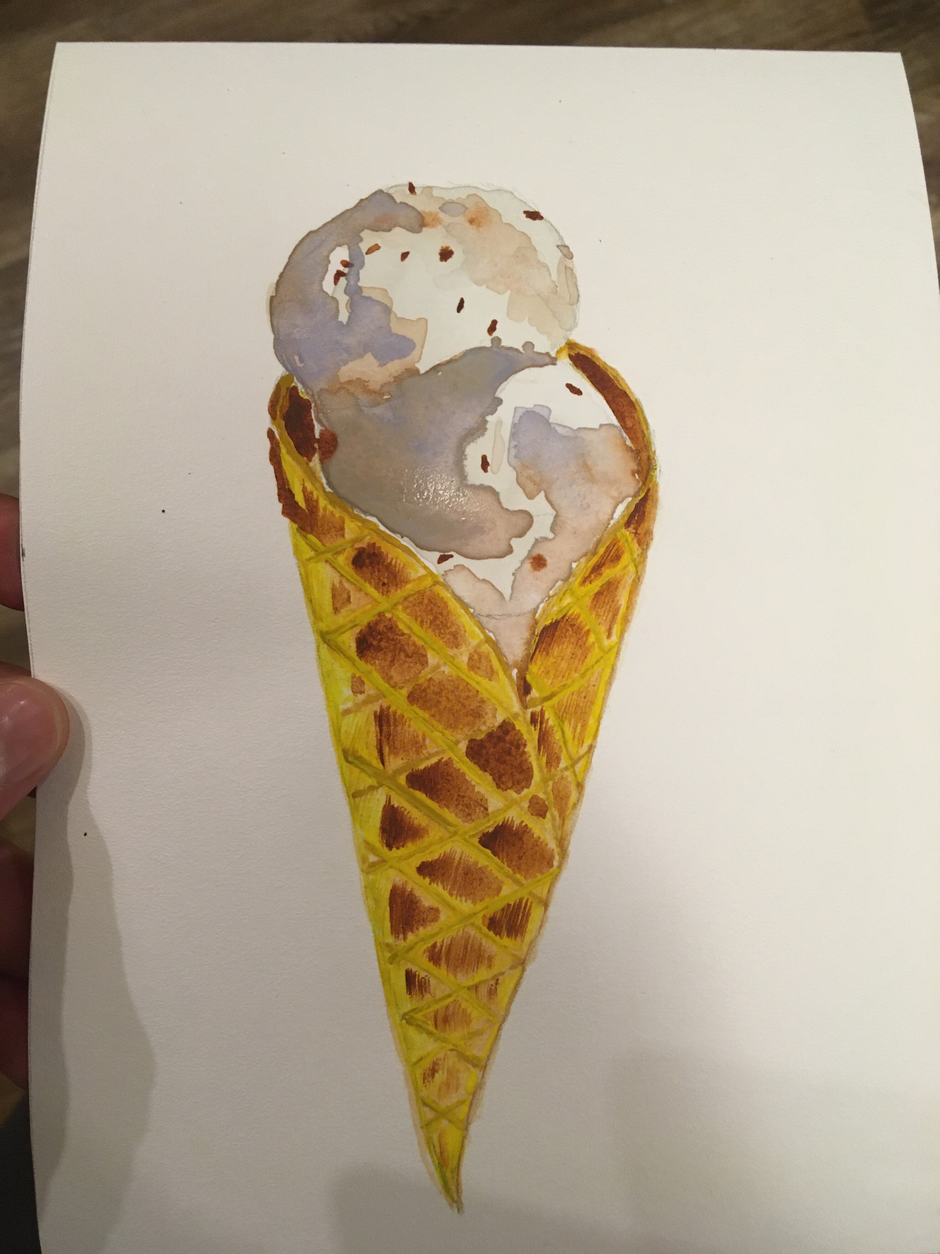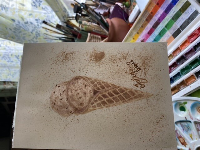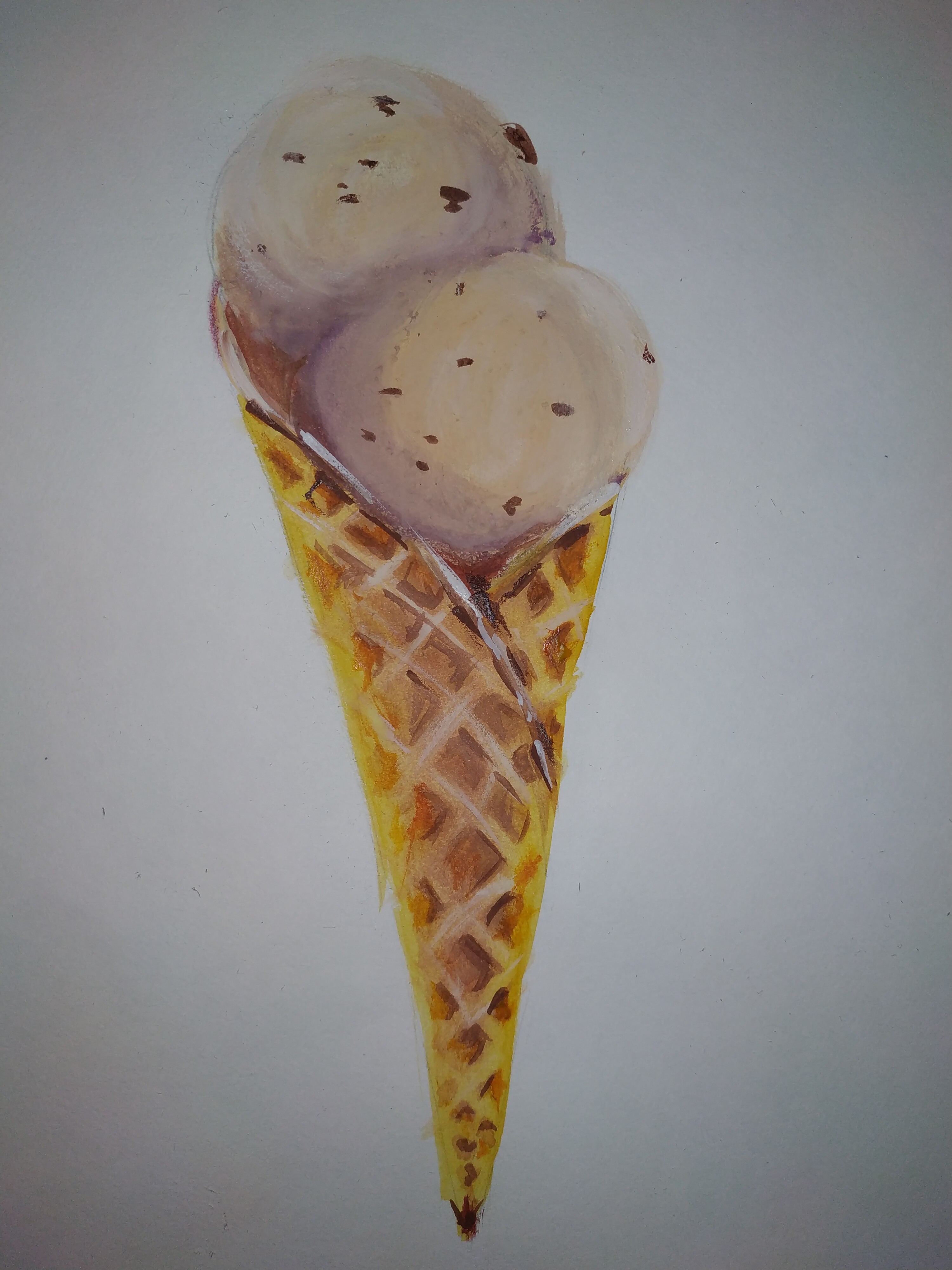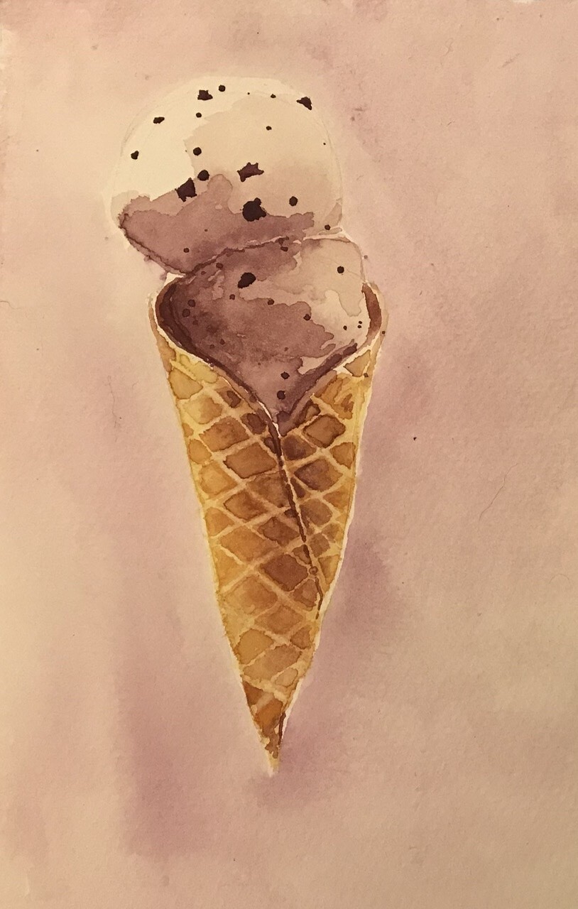 Тени мороженого подчеркиваем холодным тоном коричневого с фиолетовой. Выбираем салфеткой и чистой влажной кистью осветленные места пока слой еще мокрый.