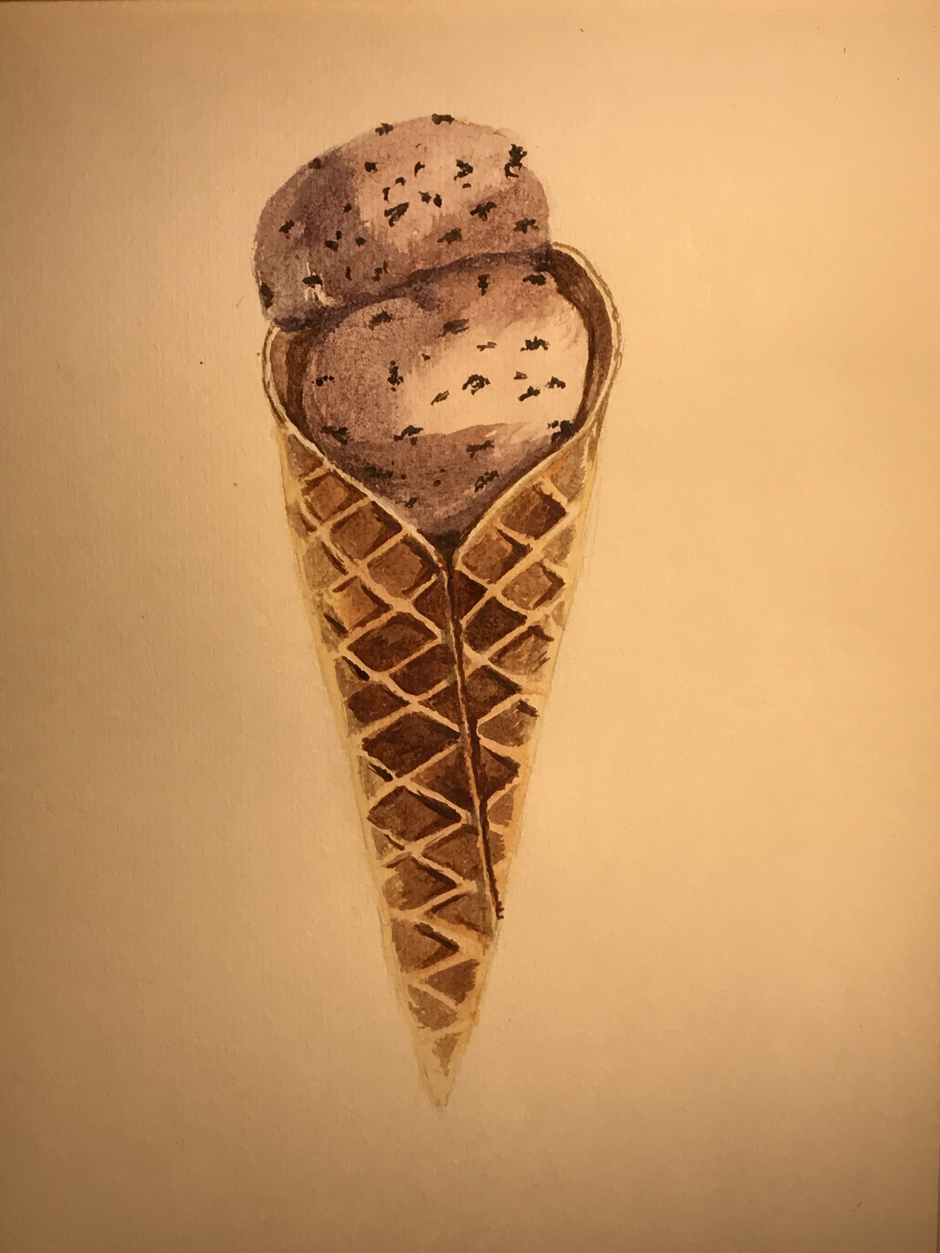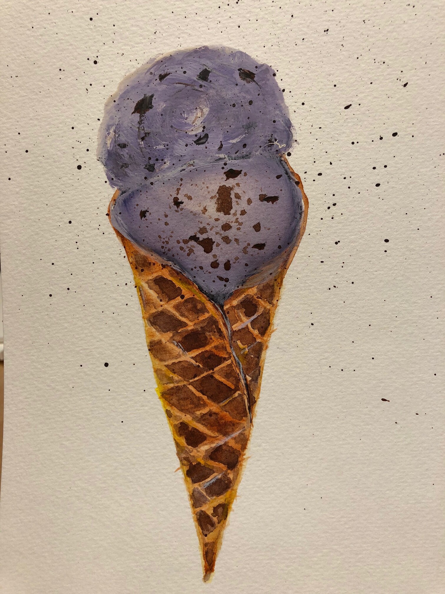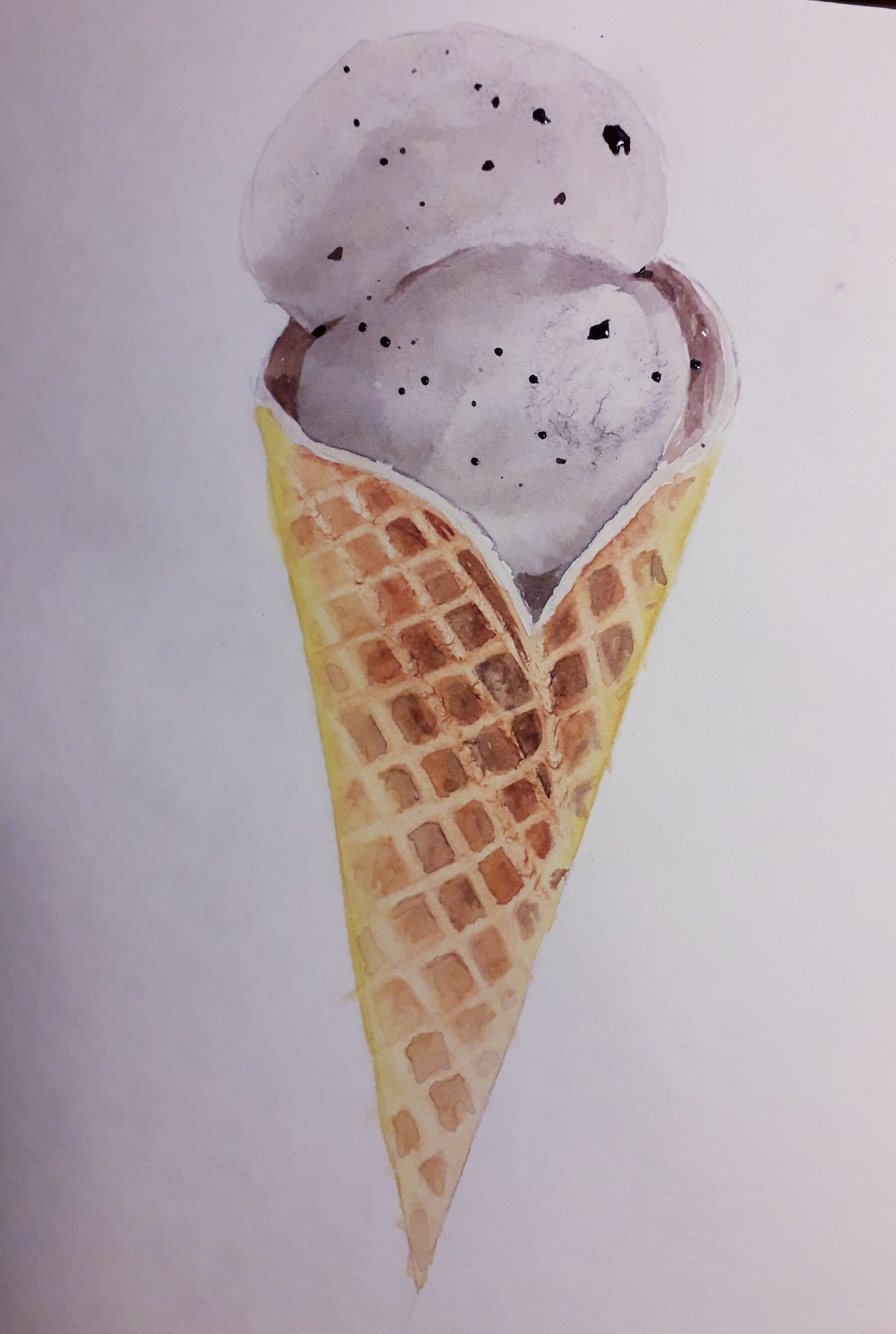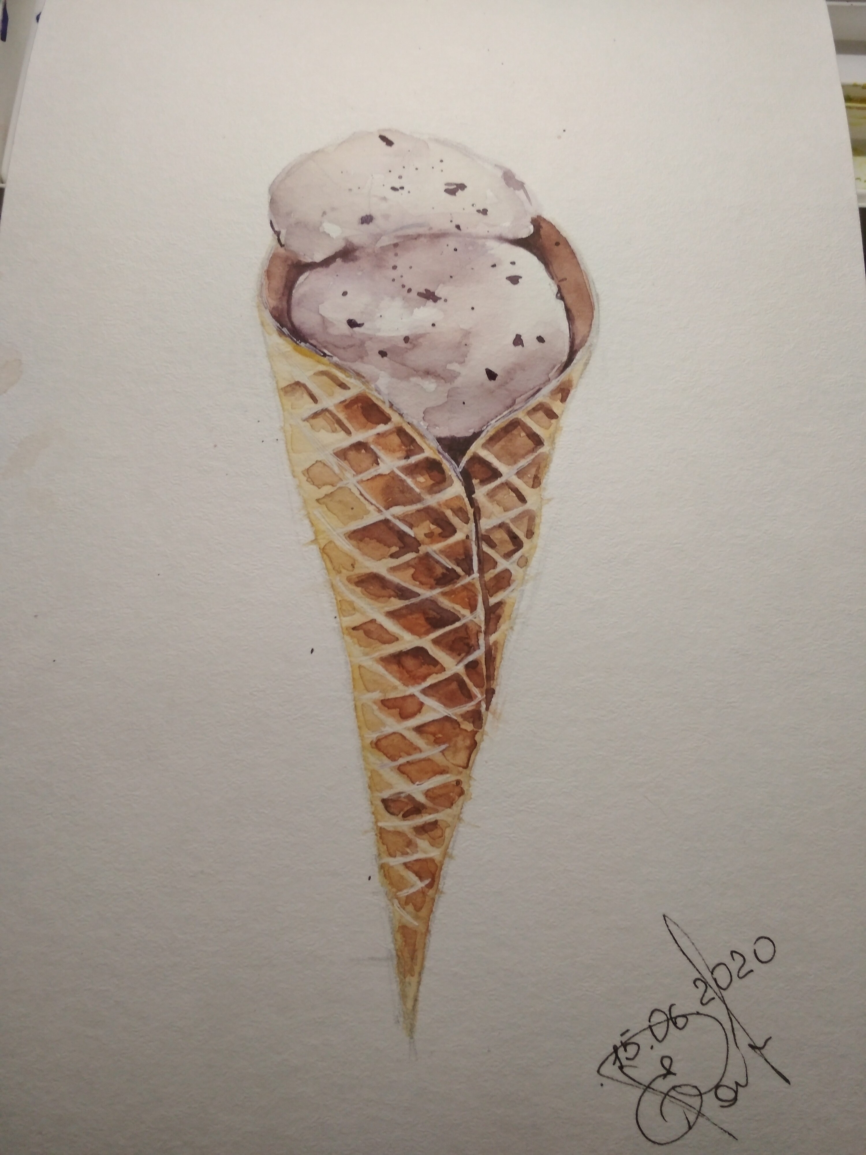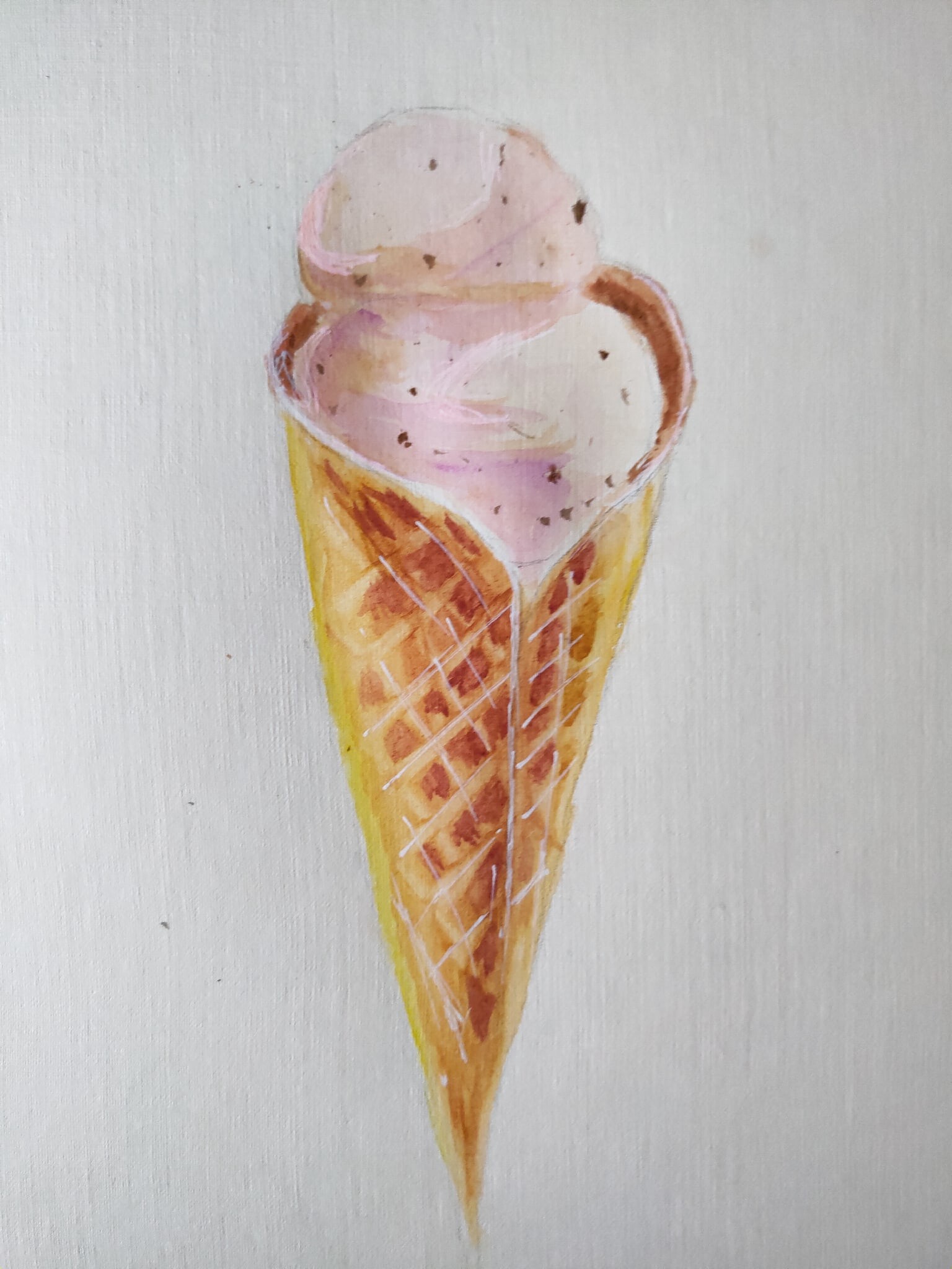 Тени мороженого подчеркиваем холодным тоном коричневого с фиолетовой. Выбираем салфеткой и чистой влажной кистью осветленные места пока слой еще мокрый.