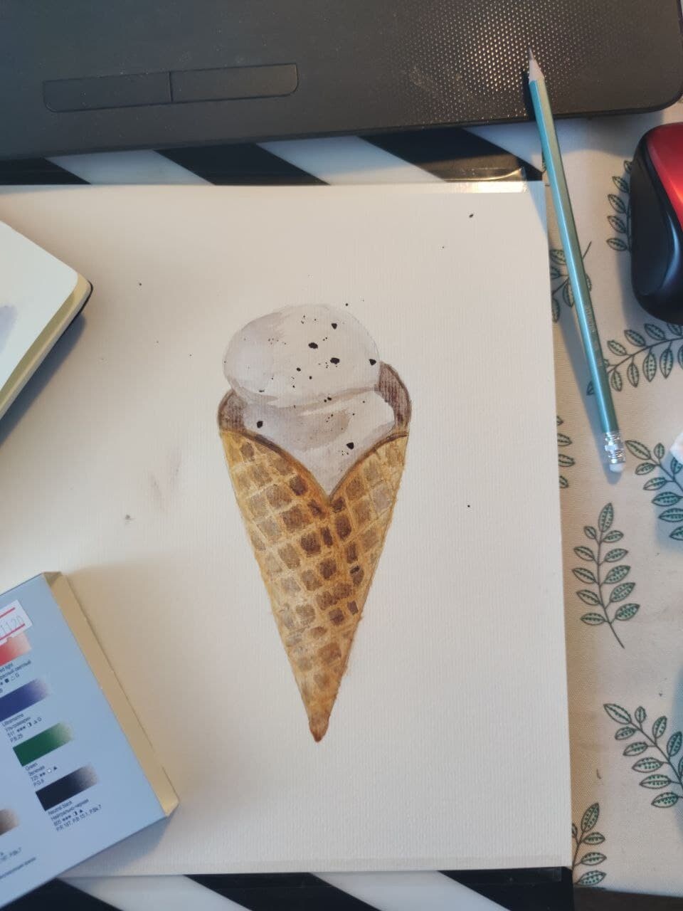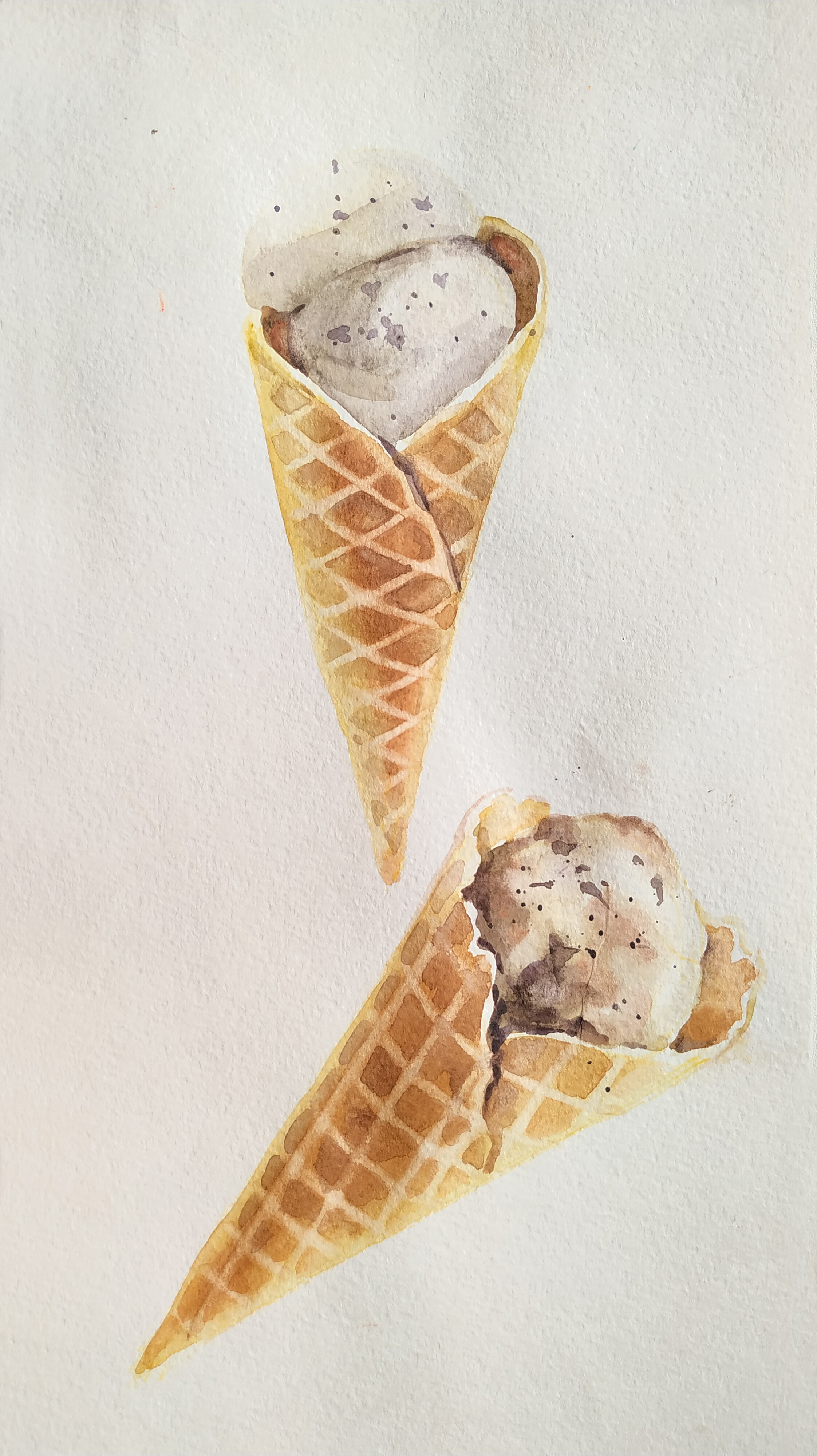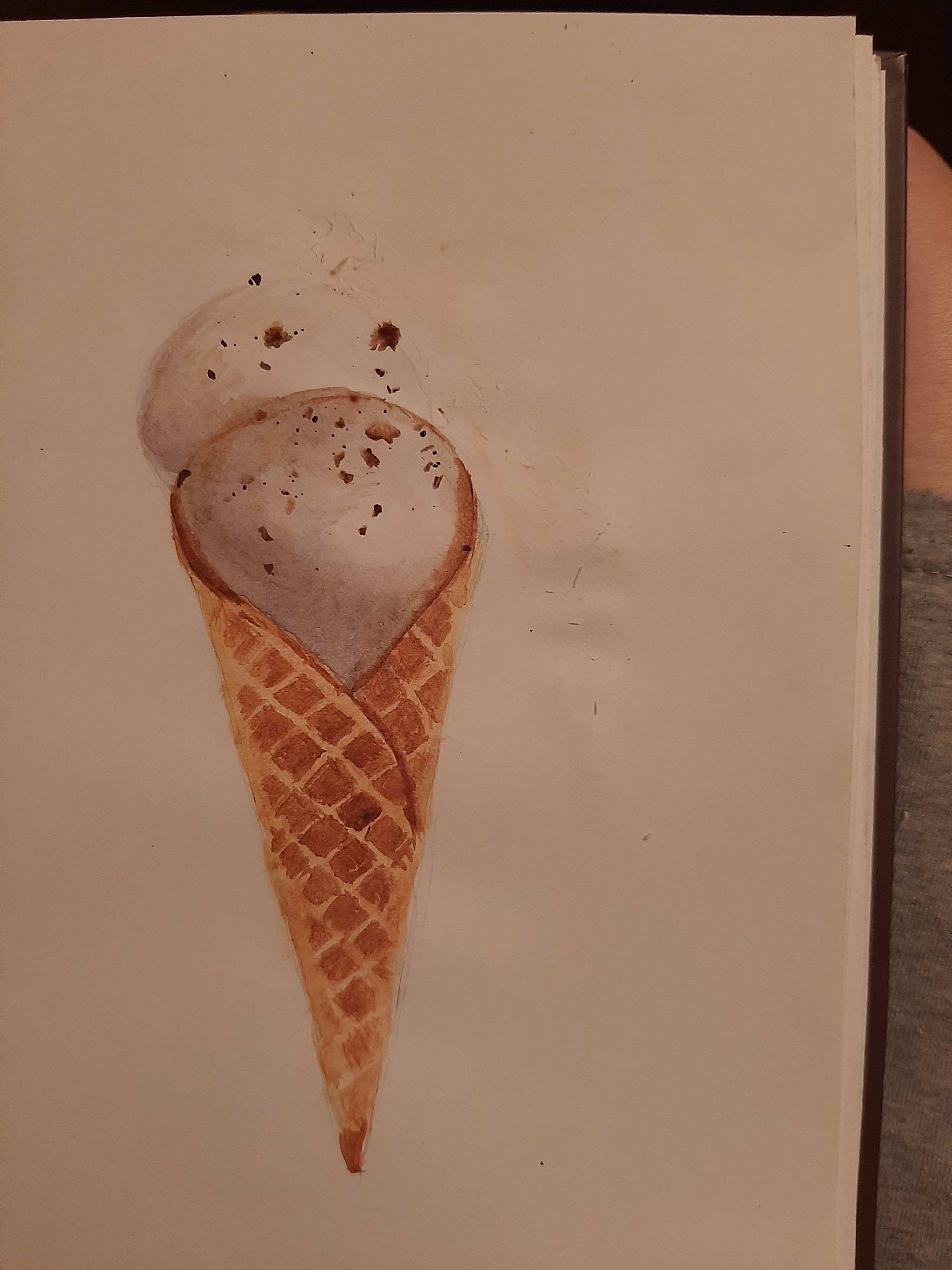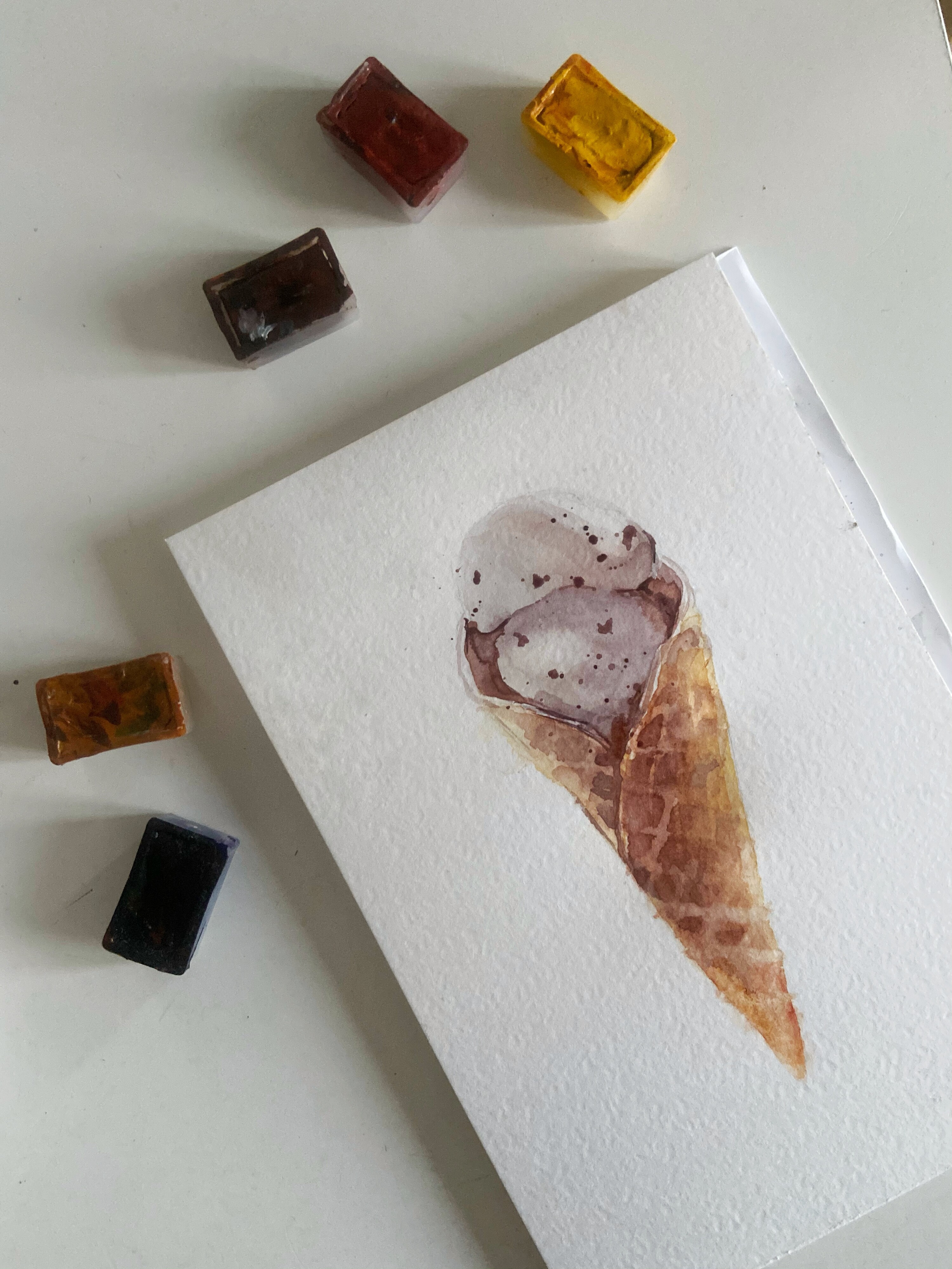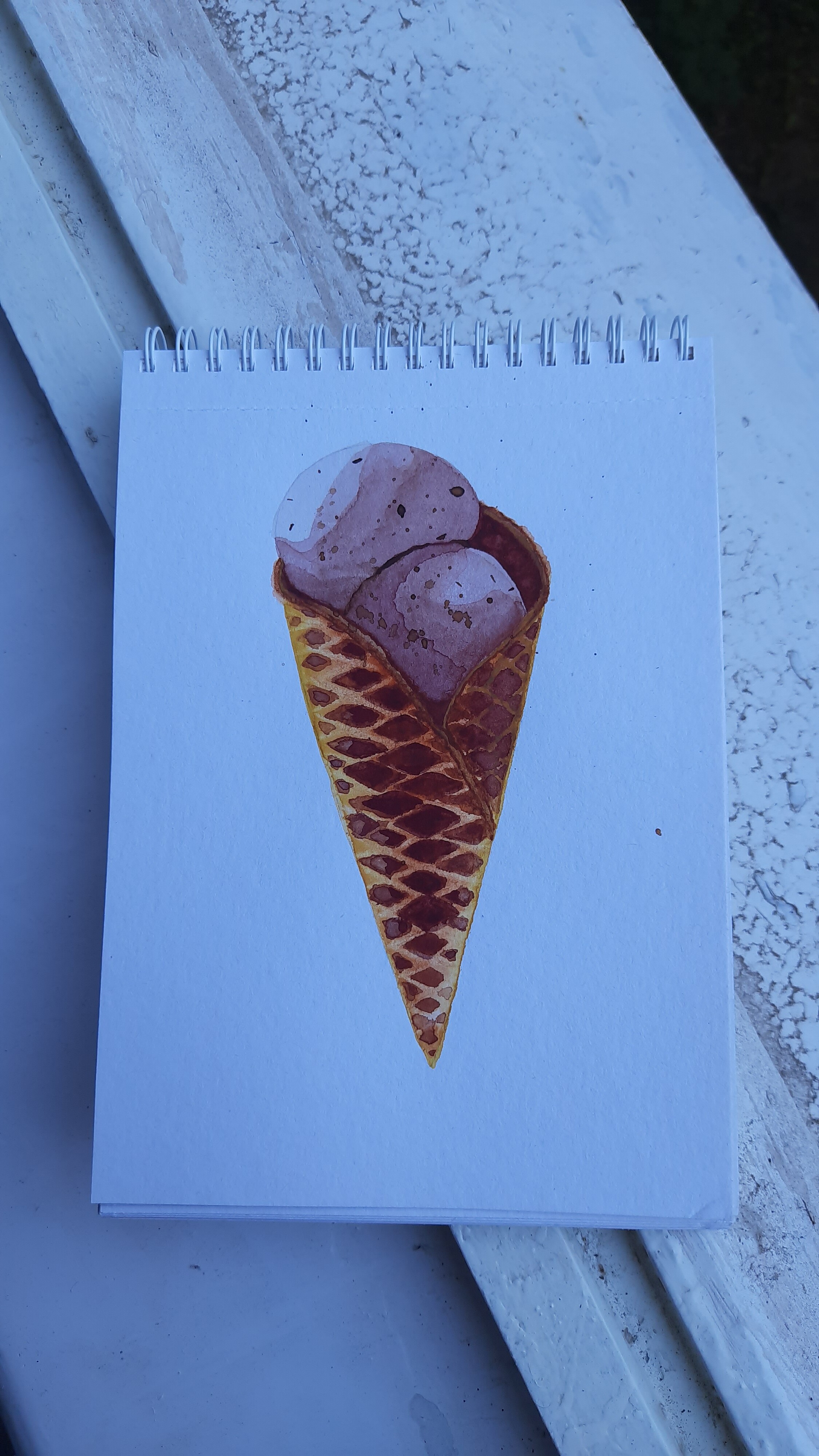 Тени мороженого подчеркиваем холодным тоном коричневого с фиолетовой. Выбираем салфеткой и чистой влажной кистью осветленные места пока слой еще мокрый.