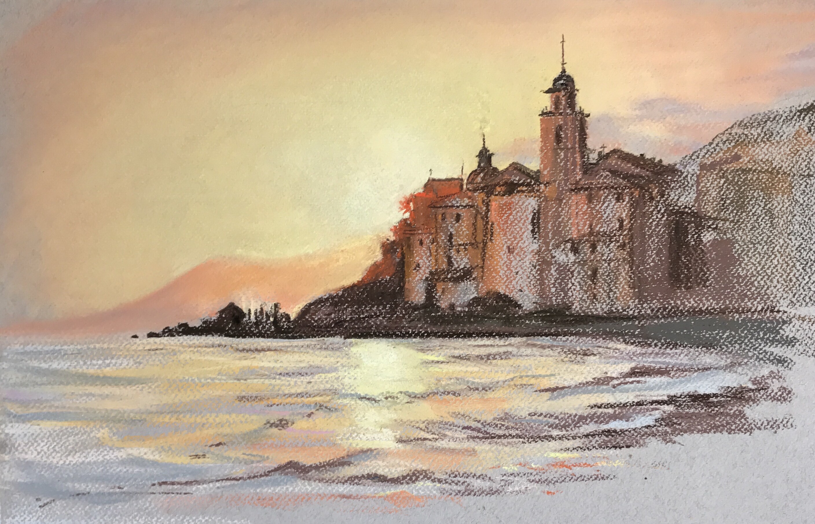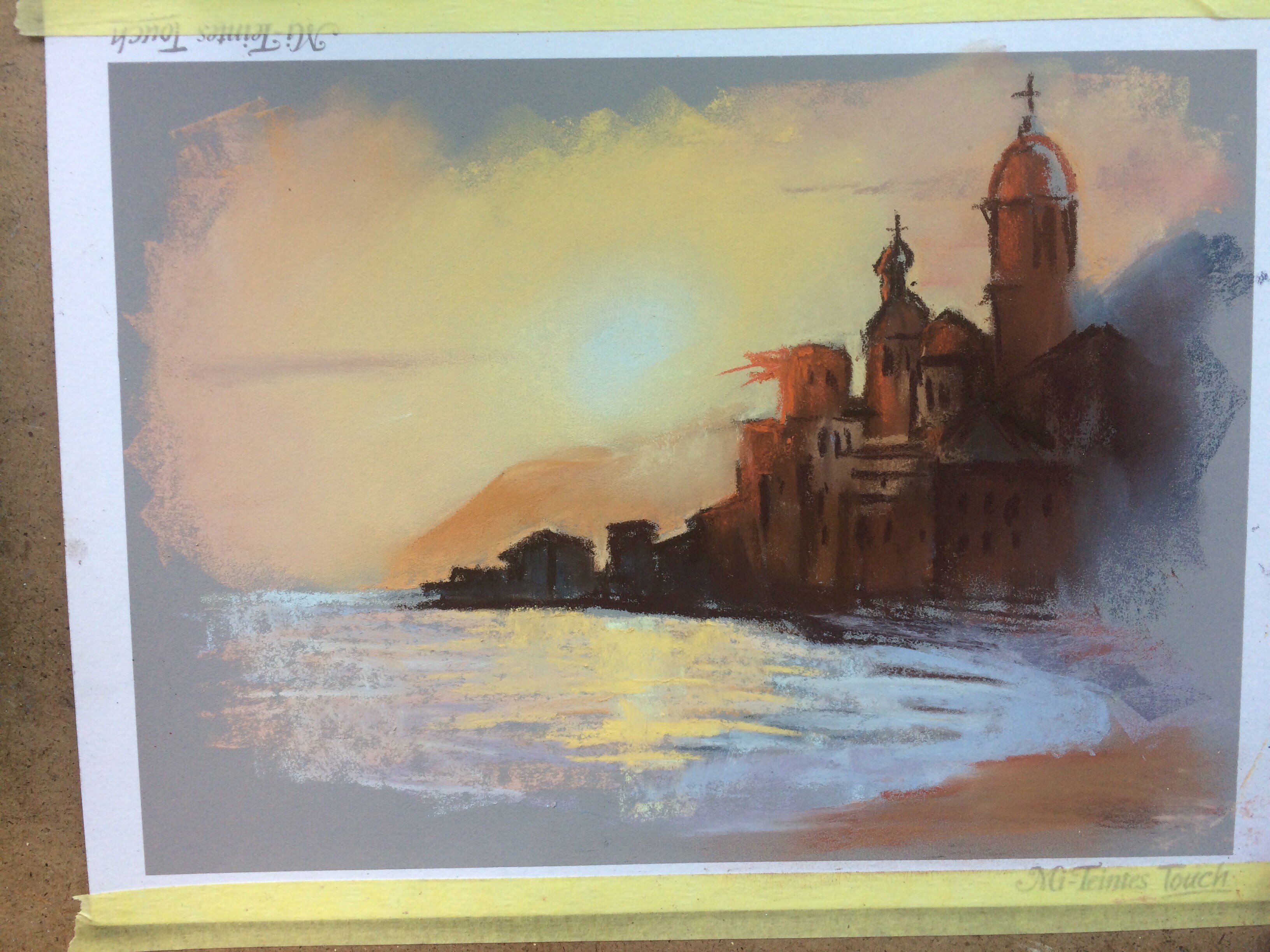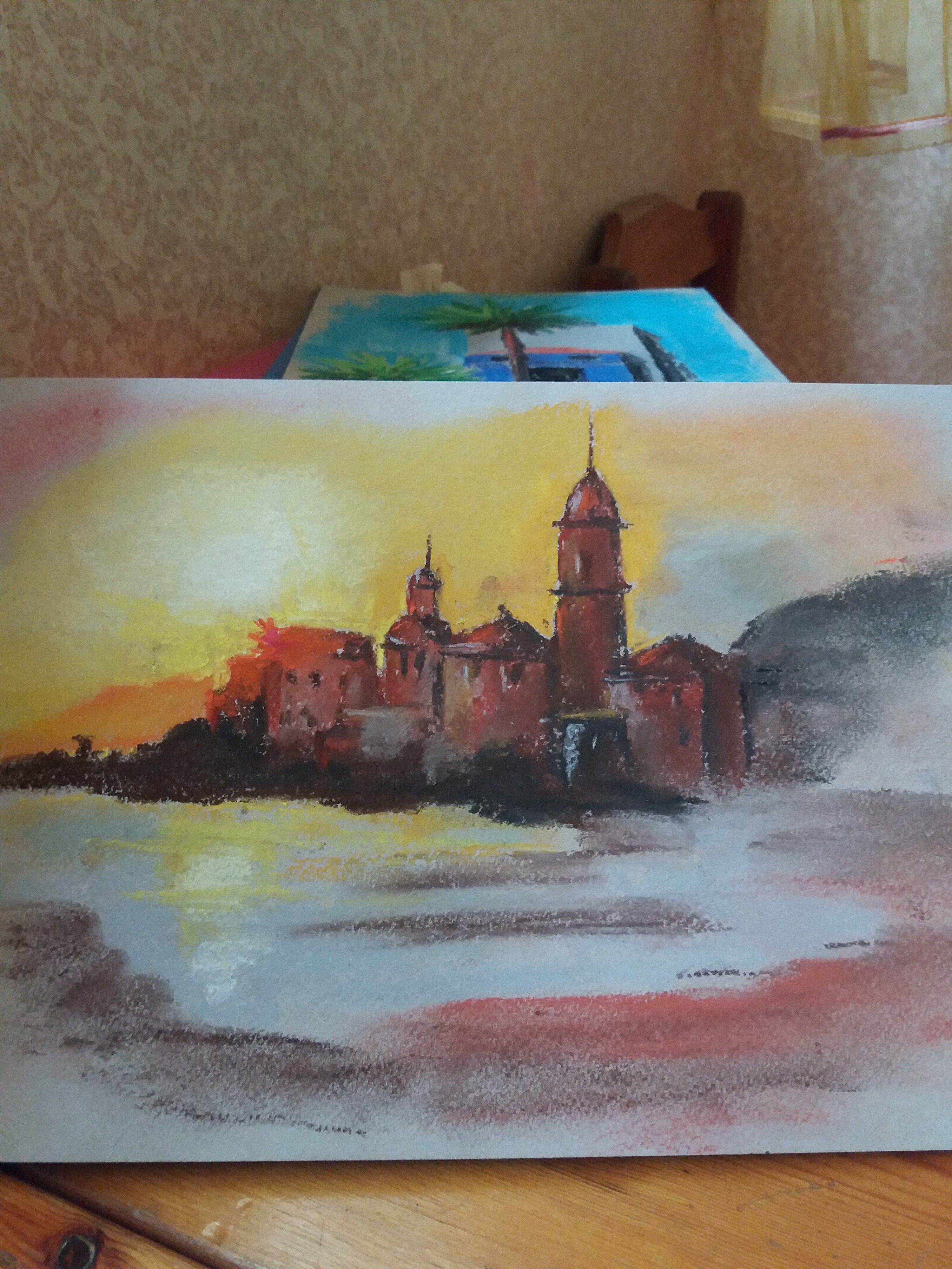Предлагаю выполнить два пастельных пейзажа по мотивам летних пленэрных путешествий. Будем учиться рисовать атмосферные пейзажи с архитектурой. Выполним два рисунка: в первом передадим колорит местности при ярком дневном свете, а на втором — отработаем пленэрные приемы и техники рисования архитектуры и силуэтов города на фоне закатного неба.