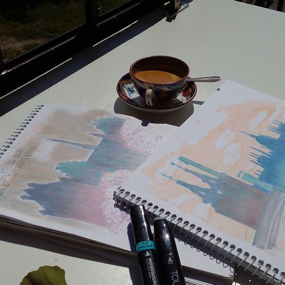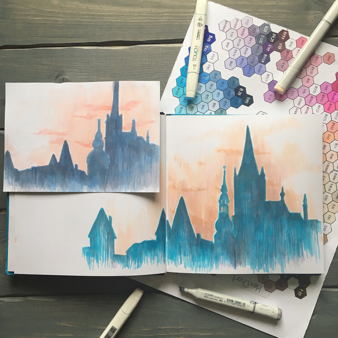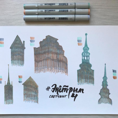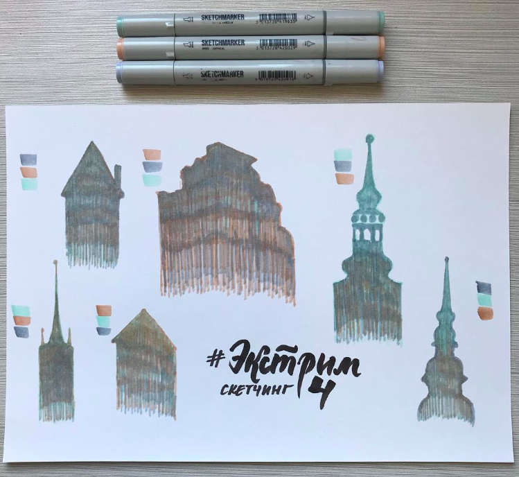 Мне нравится, что участники начинают экспериментировать и меняют цвета маркеров! Те цвета, которые были рекомендованы для изображения стен, они уводят на небо, а цвет неба переводят в цвет стен. Прикольные эффекты получаются! Для меня это означает, что все больше людей проникаются идеей настоящего скетчинга. Учатся смело использовать новые приемы, не просто следуют заданному алгоритму, а чувствуют сам дух Экстрима, который заключается в свободе творчества и эксперименте!