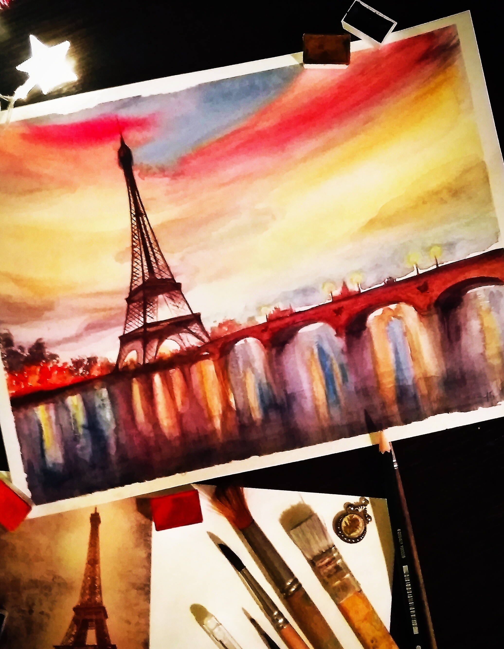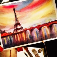 Будем рисовать яркое и смелое акварельное небо, вечерний свет, эффектные отражения фонарей в воде и, конечно, Эйфелеву башню.