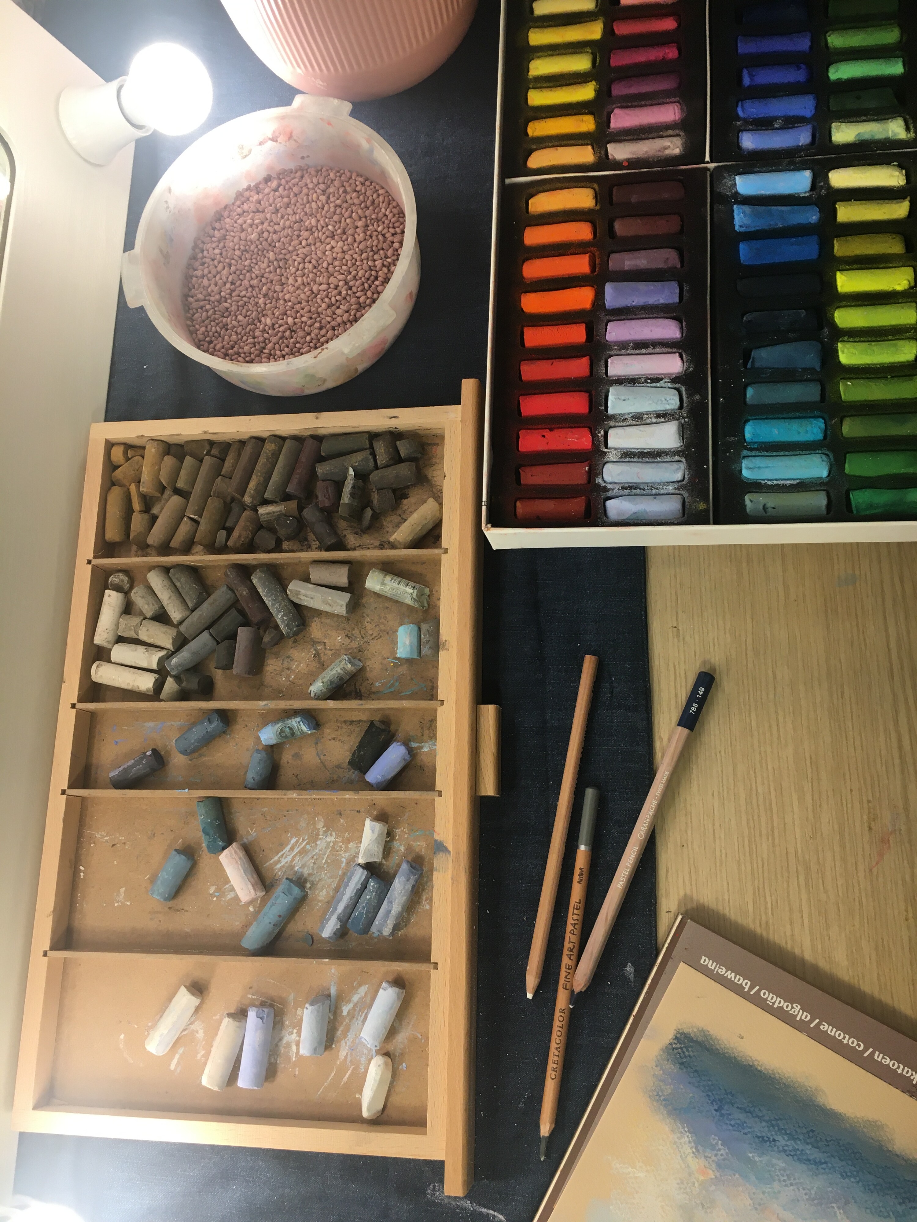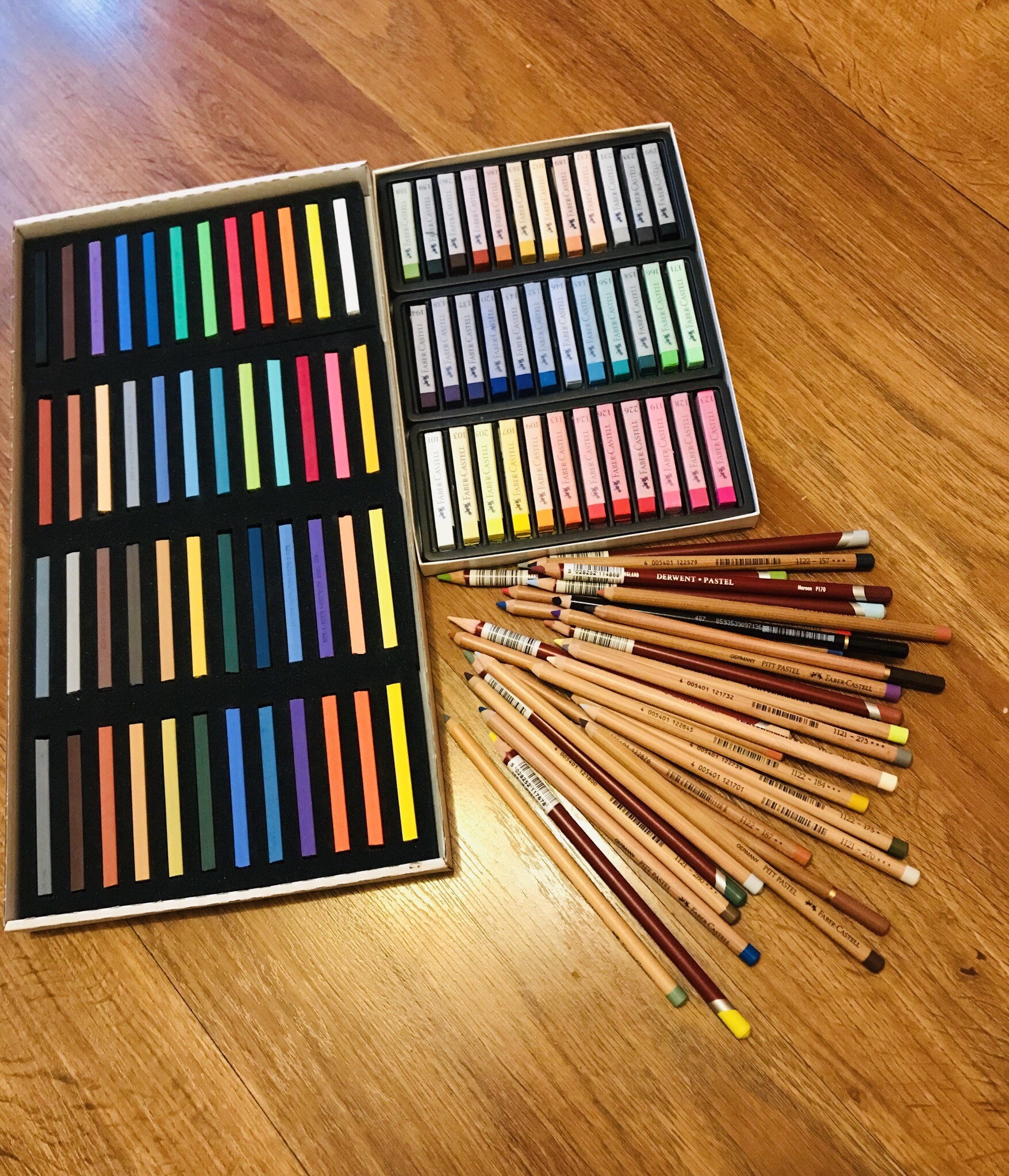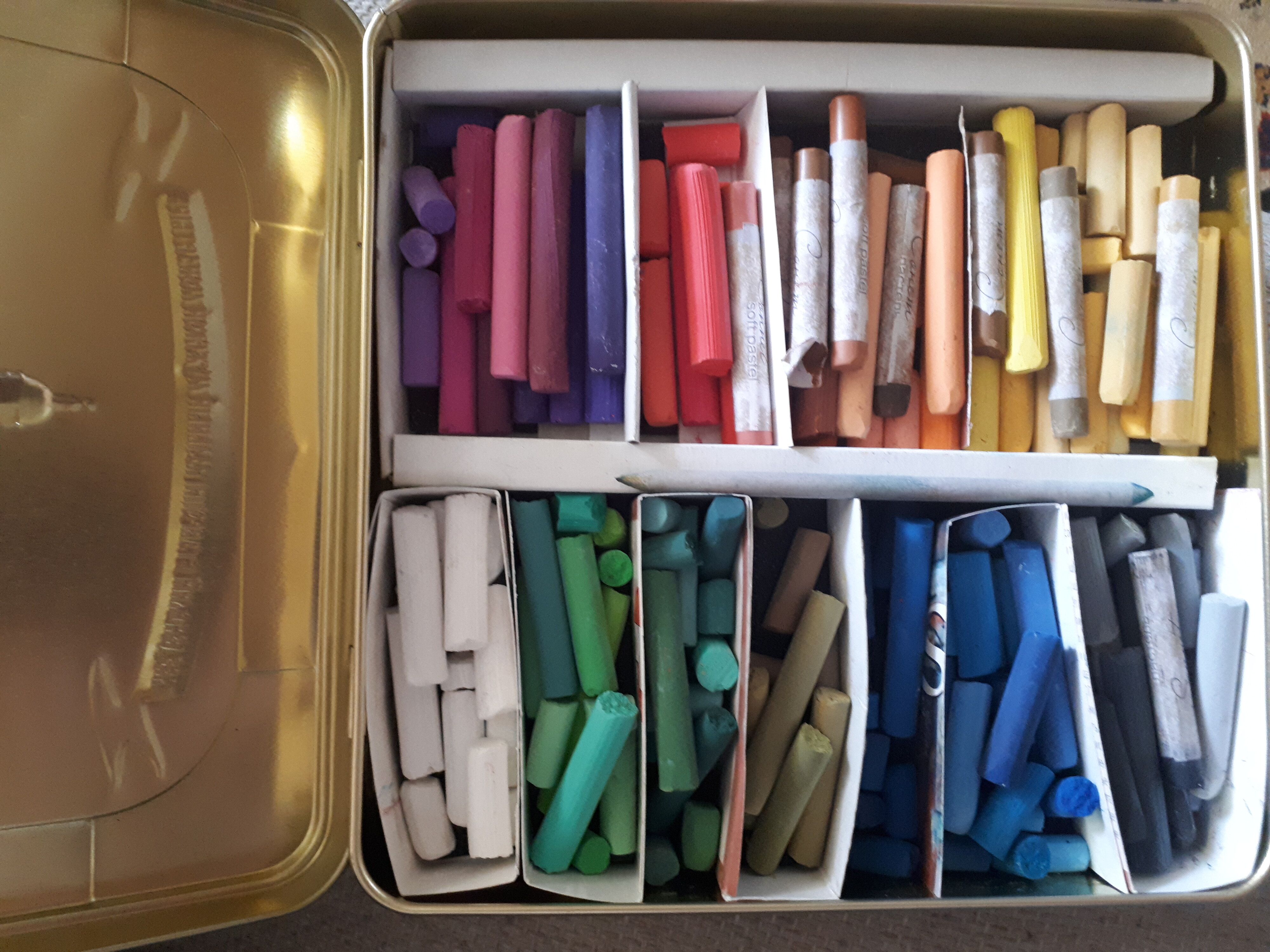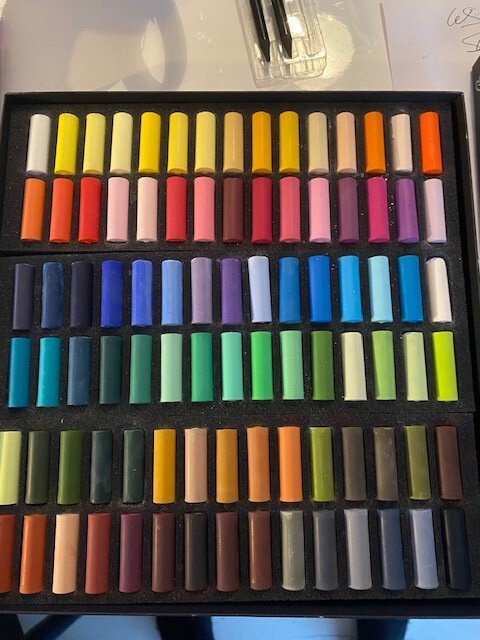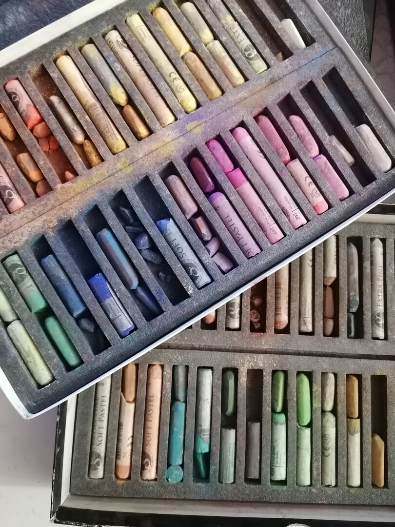 Мой фаворит сейчас — это 120 половинок Unison! С этого набора можно смело начинать своё знакомство с материалом. Палитра здесь достаточно обширная и универсальная, хотя ни в одном наборе нет идеального подбора оттенков, некоторые цвета приходится докупать поштучно, но это и хорошо! Художнику-пастелисту лучше иметь в своём арсенале мелки разных марок и твердости. Unison имеет насыщенную яркую палитру, пигмент достаточно мягкий, чтобы было легко работать с растушёвками, но и при работе ребром или на абразивной бумаге эта марка показала себя с наилучшей стороны. Пастель не крошится, расходуется достаточно экономно.