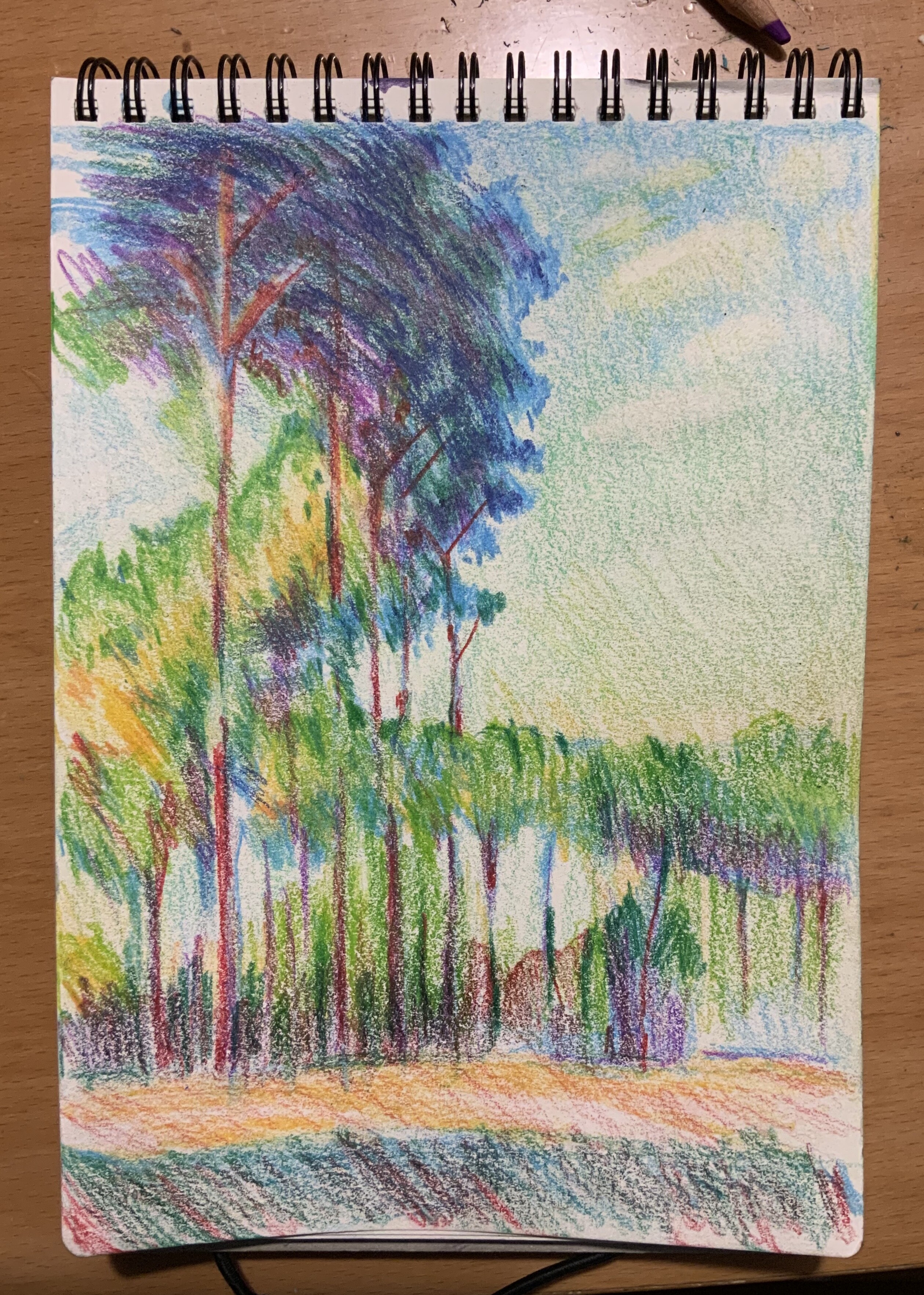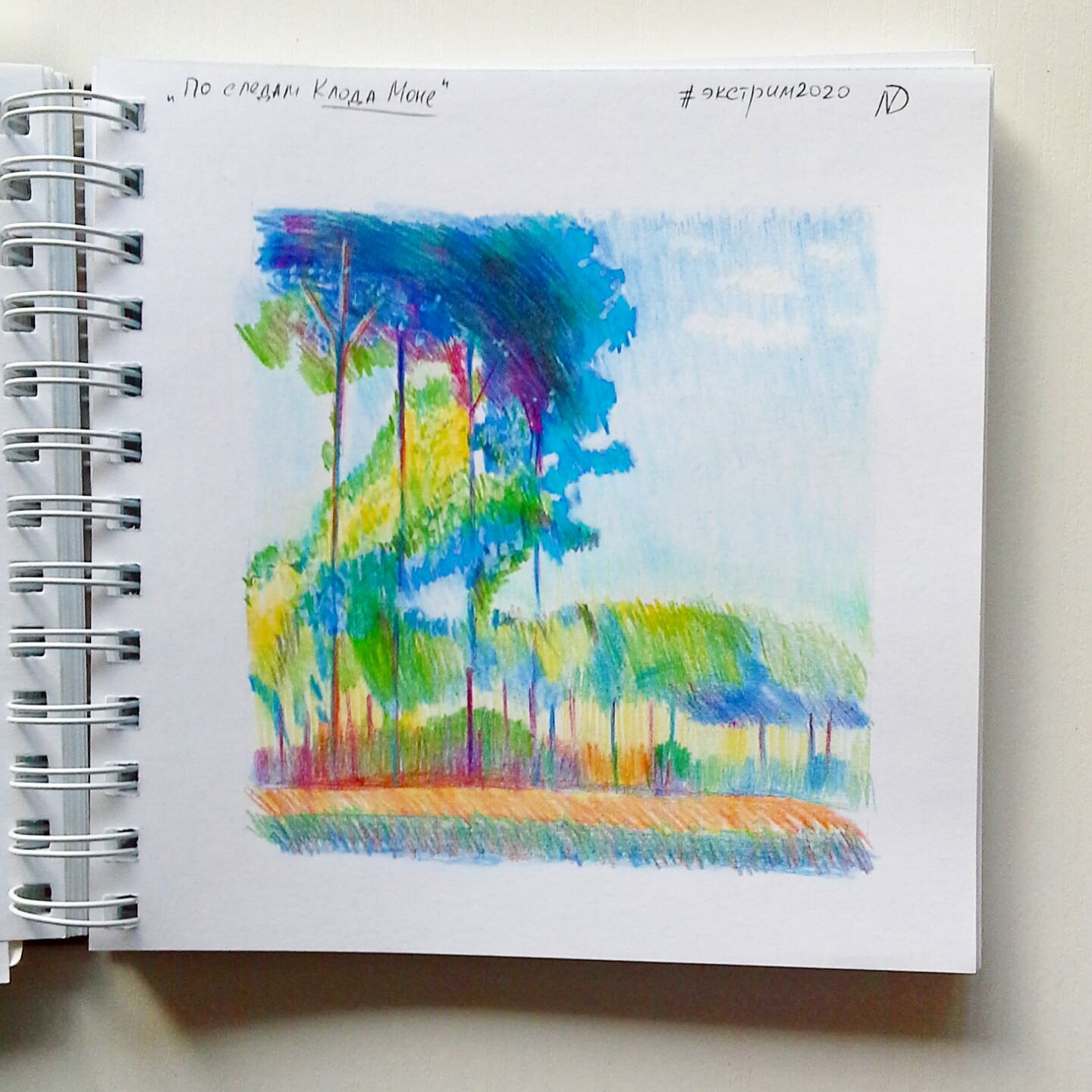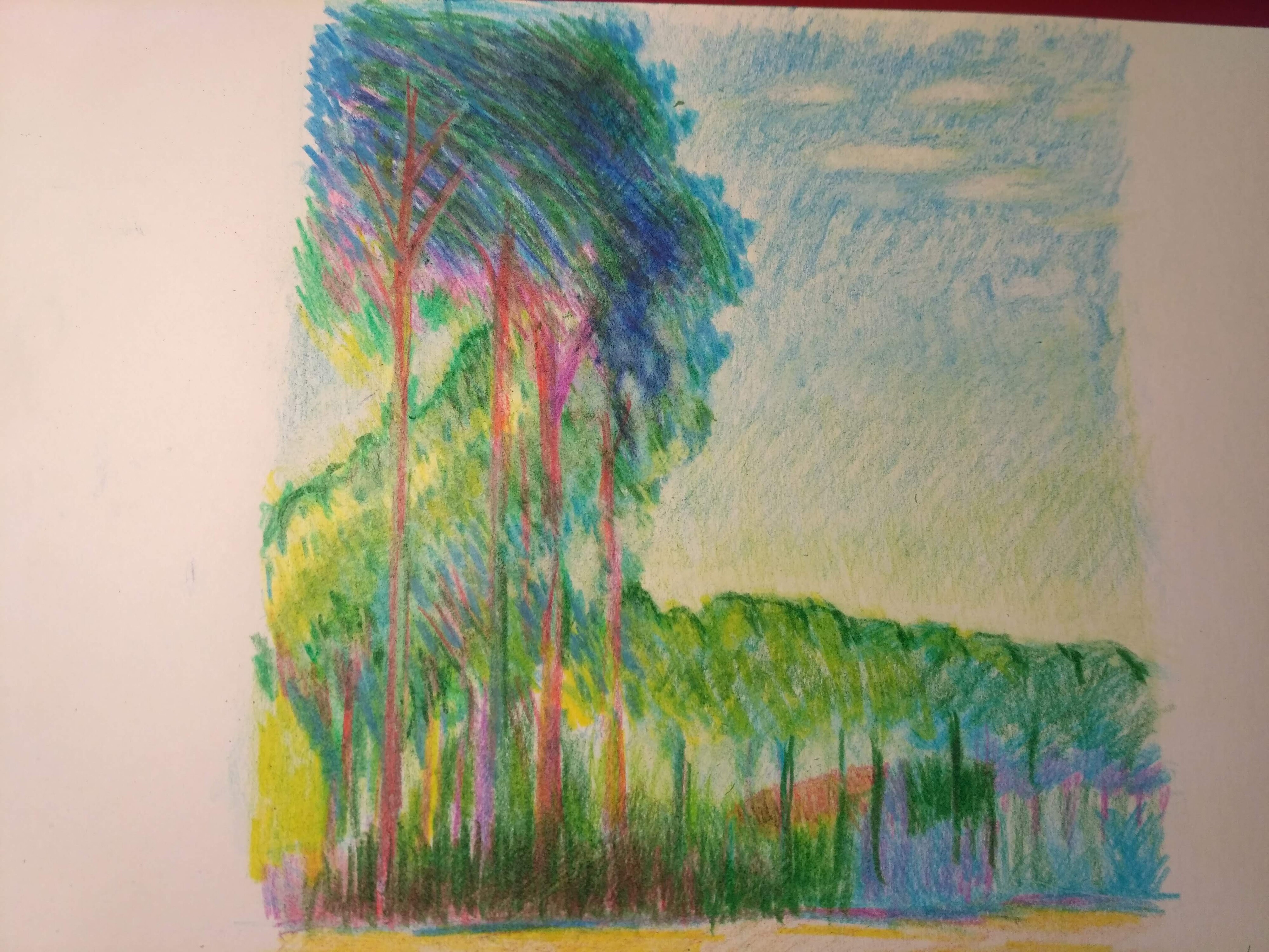Будем учиться у великих. Вдохновимся полотнами Клода Моне: он многократно рисовал один и тоже же сюжет но в разных цветовых сочетаниях, при разном освещении, с разными эмоциями. Попробуем сделать что-то подобное, но в своей манере, свежей цветовой палитре и цветными карандашами.