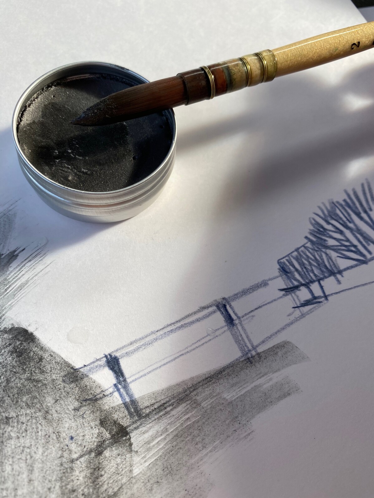 Мне понравилось совмещать технику жидкого графита с обычными простыми карандашами. Получается очень контрастно и выразительно. Обязательно возьму с собой на скетчинг и захвачу «водяную кисть».