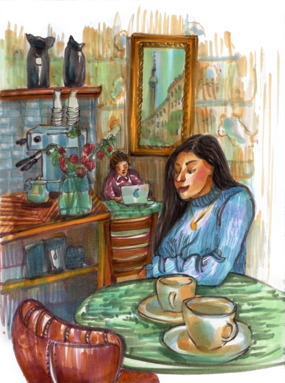 27 сентября 2020 года Лена провела акцию «Люди в городе»: пригласила всех желающих прийти в назначенное время в уютное кафе в Берлине и стать персонажами её скетчей! Быстро, ярко, маркерами — и по 10 минут на портрет каждого участника встречи. Всего на предложение откликнулись 25 человек: Лена рисовала 8 рабочих часов вместо запланированных 6.