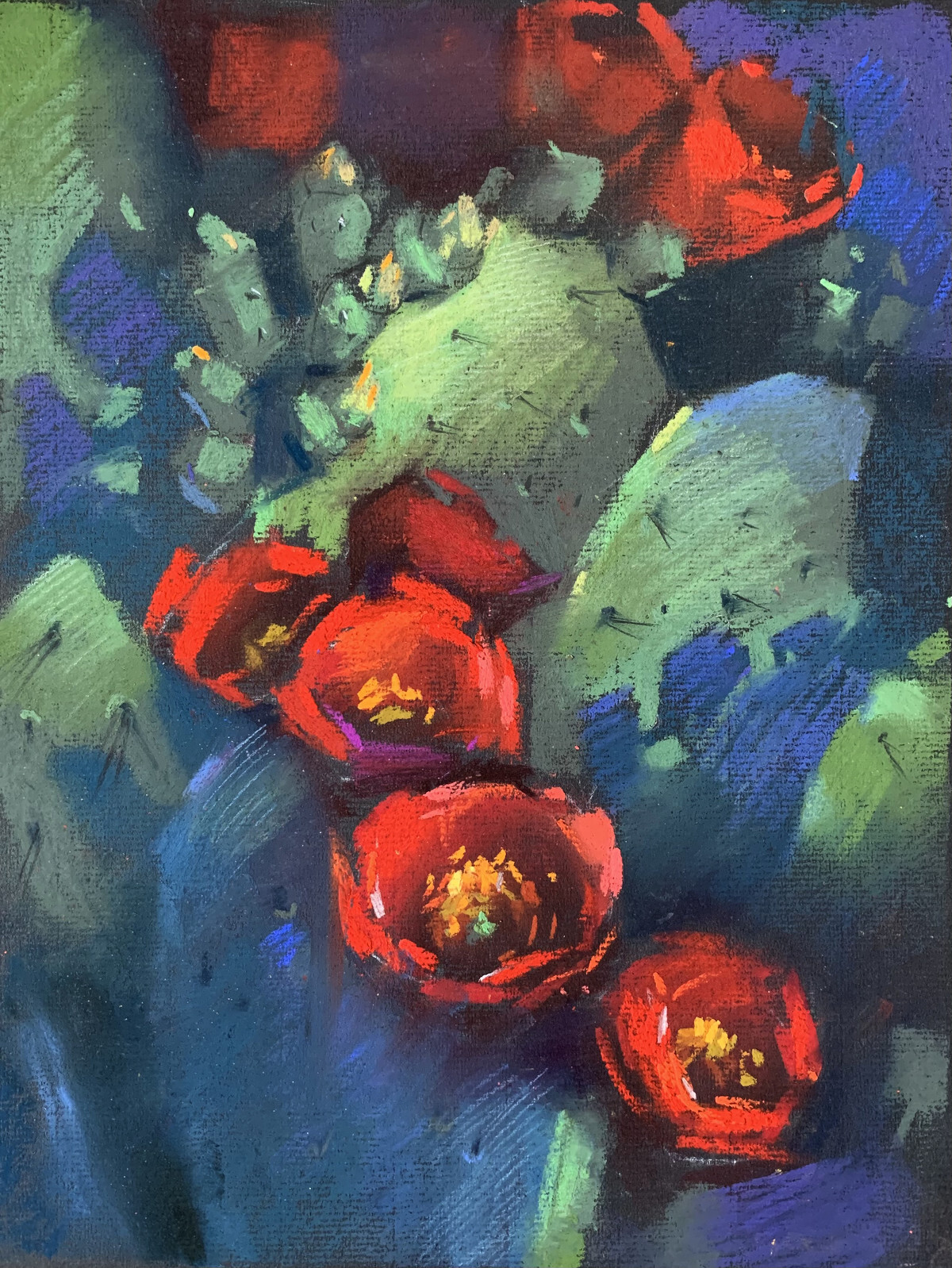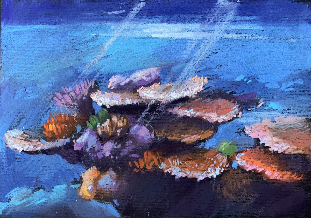 - А если вы уже уверенно рисуете пастелью и готовы осваивать новые неожиданные приемы и техники, то вам подойдет курс «Цветы пастелью 2». Тут нас ждёт более углубленное изучение различных техник пастельной живописи. Я бы сказала, что «Цветы пастелью 2» более творческий. Ведь здесь мы компонуем цветы в большие, яркие букеты, стильные натюрморты и даже пробуем вписывать их в пейзаж в закатном свете. Цветы в интерьере в контражурном освещении — также интересная новая тема для изучения. А еще мы коснемся экзотики — кактусы и кораллы украсят галерею картин.