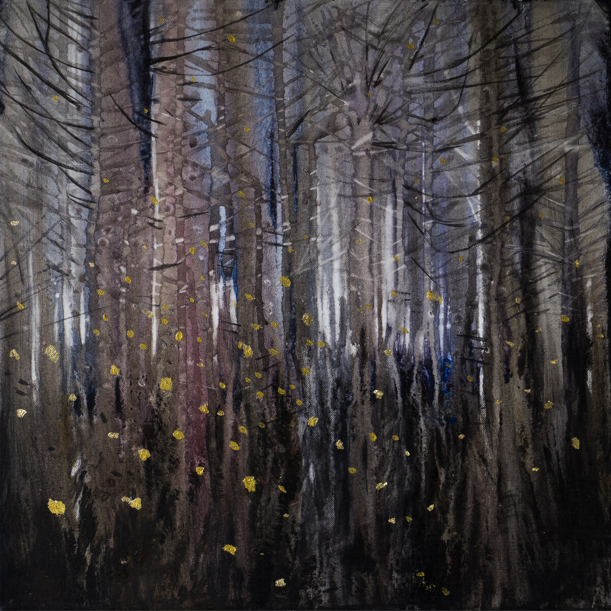 - Пишем на холсте слоями: передаём общий колорит через акрил по-мокрому, разводами передаем фактуры леса.