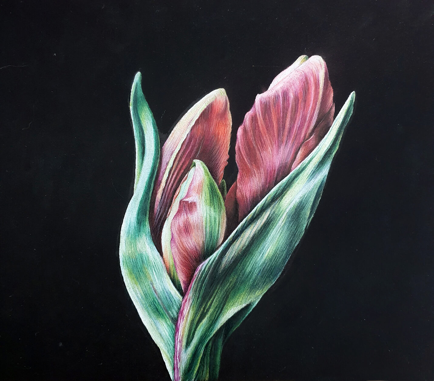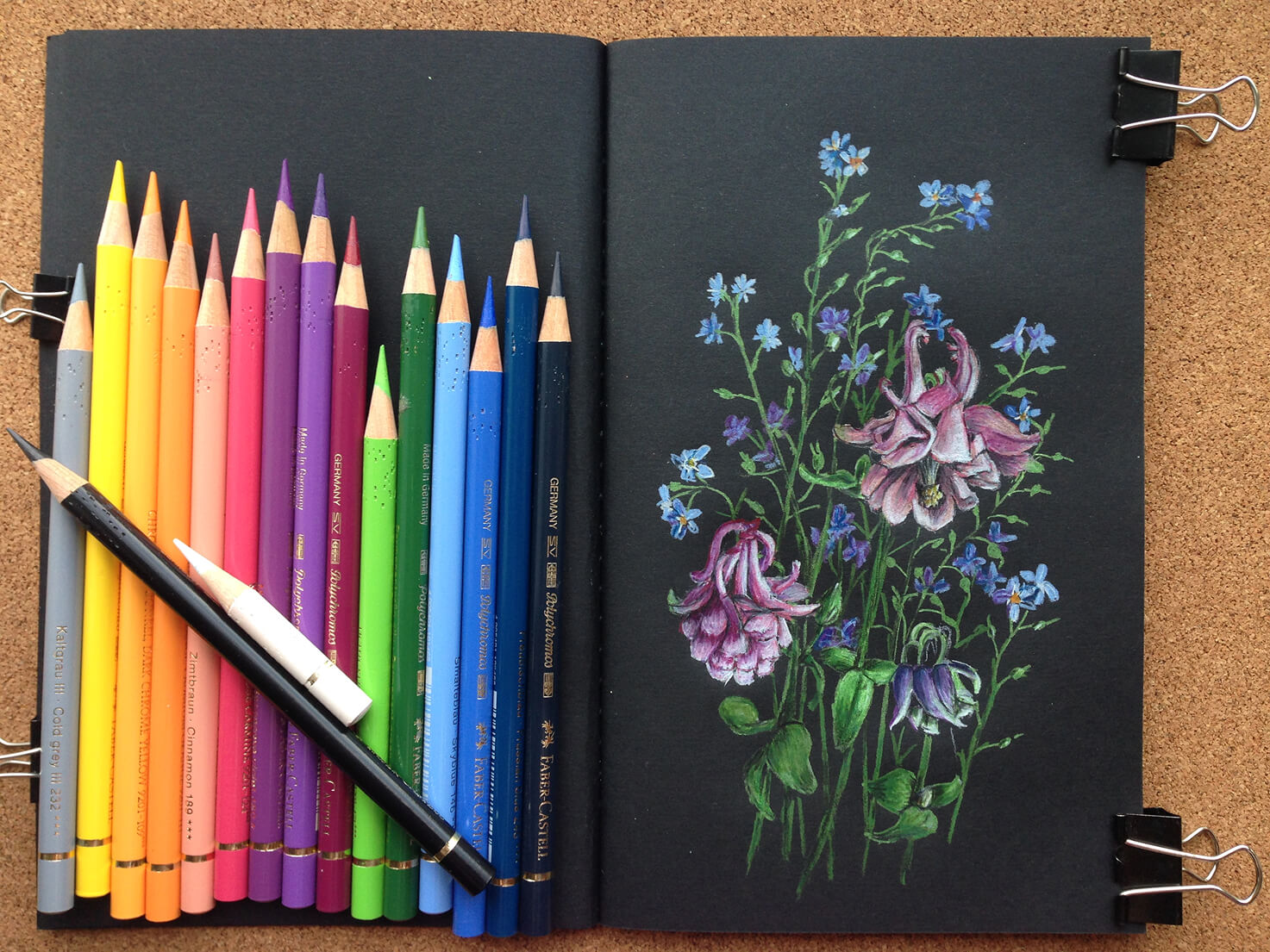 Я долго исследовала секреты яркости карандашей, искала нужные приёмы и особые эффекты. Методом проб и ошибок пришла к своей авторской технике — работе цветными карандашами на чёрной бумаге.