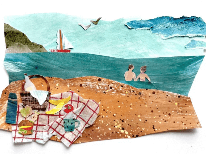 Рассматриваем ракурсы и композицию коллажного изображения, создаём летний морской пейзаж. Делаем акцент на набор для пикника: вырезаем из бумаги бутерброды, фрукты и даже холодный лимонад в запотевшей бутылке. После этого вы сможете легко создавать натюрморты в технике коллажа и аппликации.