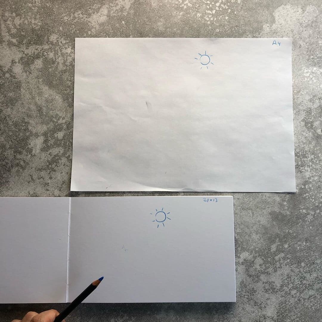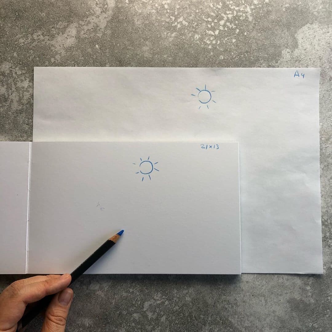 Формат скетчбука важен, чтобы работа была посильной и была нарисована красиво. Просто сравните на фото два одинаково солнышка, нарисованных на разных форматах бумаги: одно в блокноте 21×13, второе на А4.