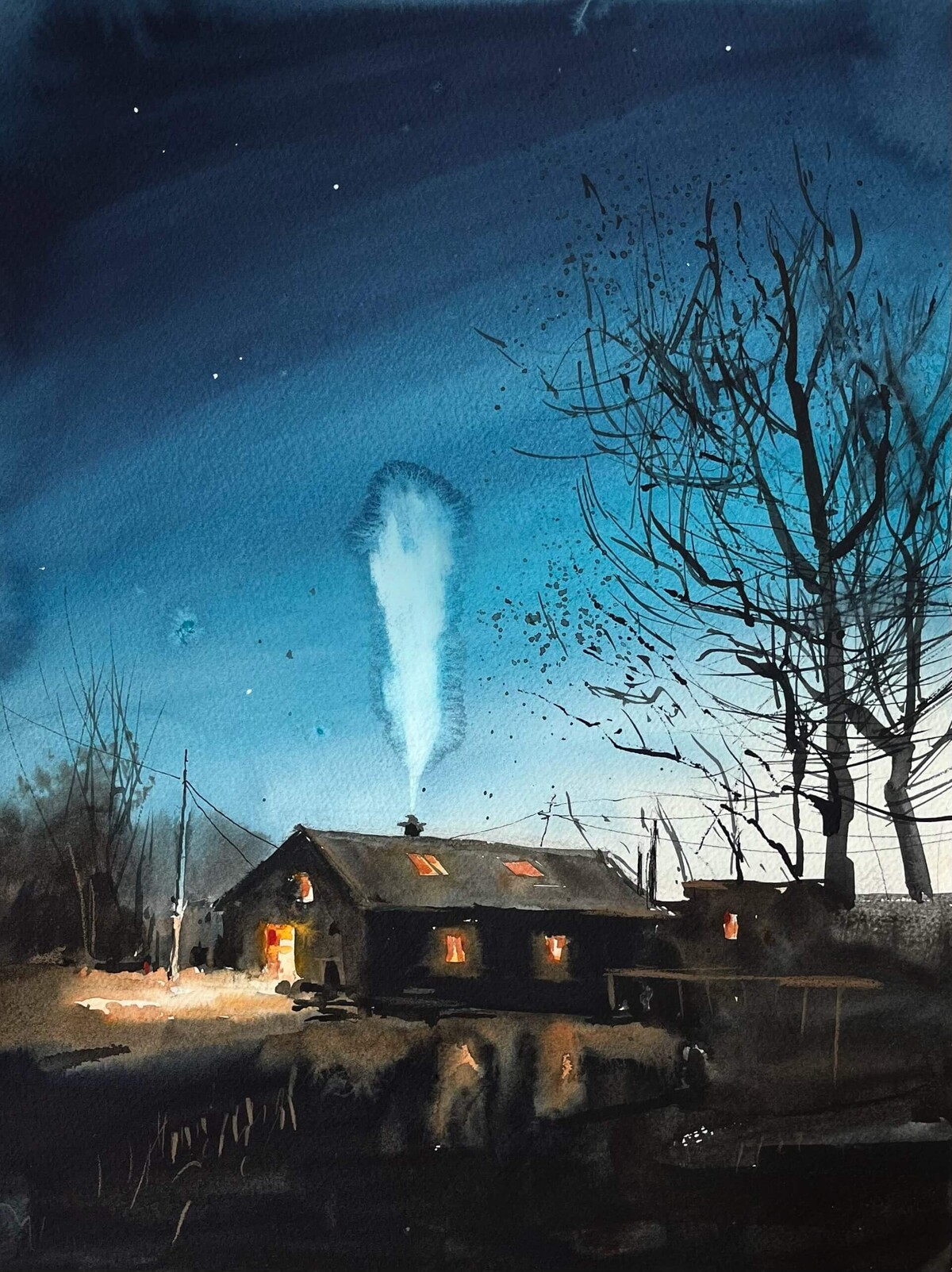 Последовательно разберём референс по слоям. Узнаем, как добиться эффекта свечения в окнах. Нарисуем размашистое легкое дерево (в том числе и обратной стороной кисти). Увидим, как работает контраст пятна и тонкой линии.