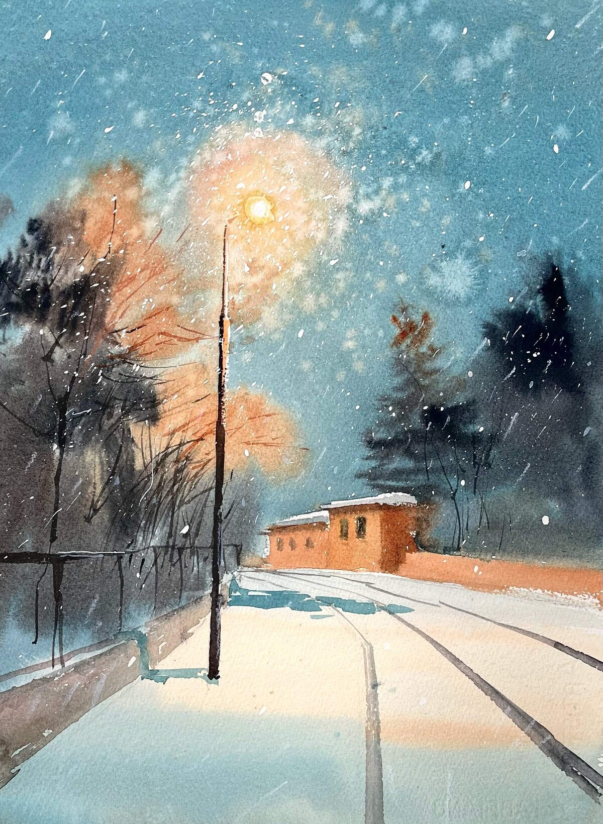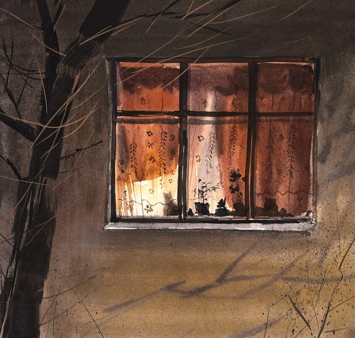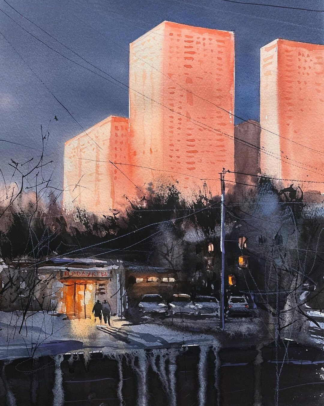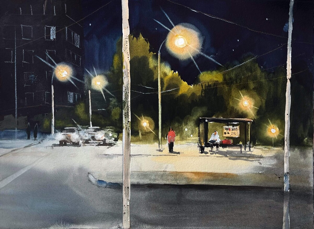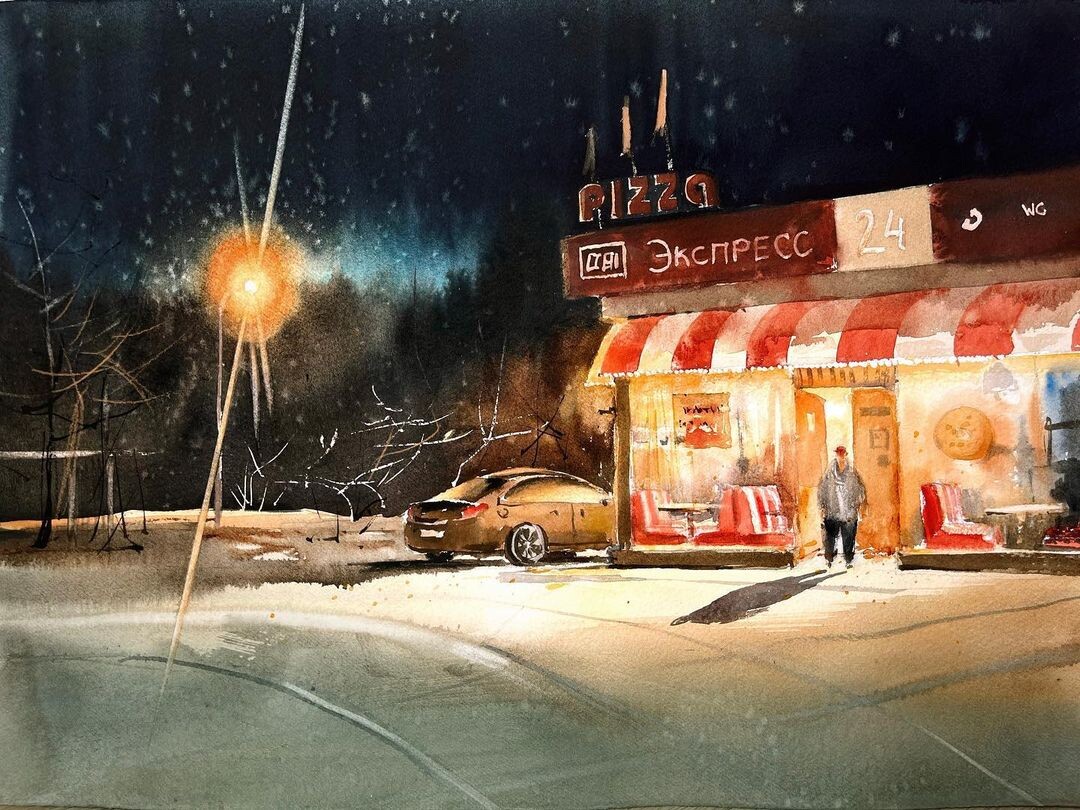Последовательно разберём референс по слоям. Узнаем, как добиться эффекта свечения в окнах. Нарисуем размашистое легкое дерево (в том числе и обратной стороной кисти). Увидим, как работает контраст пятна и тонкой линии.