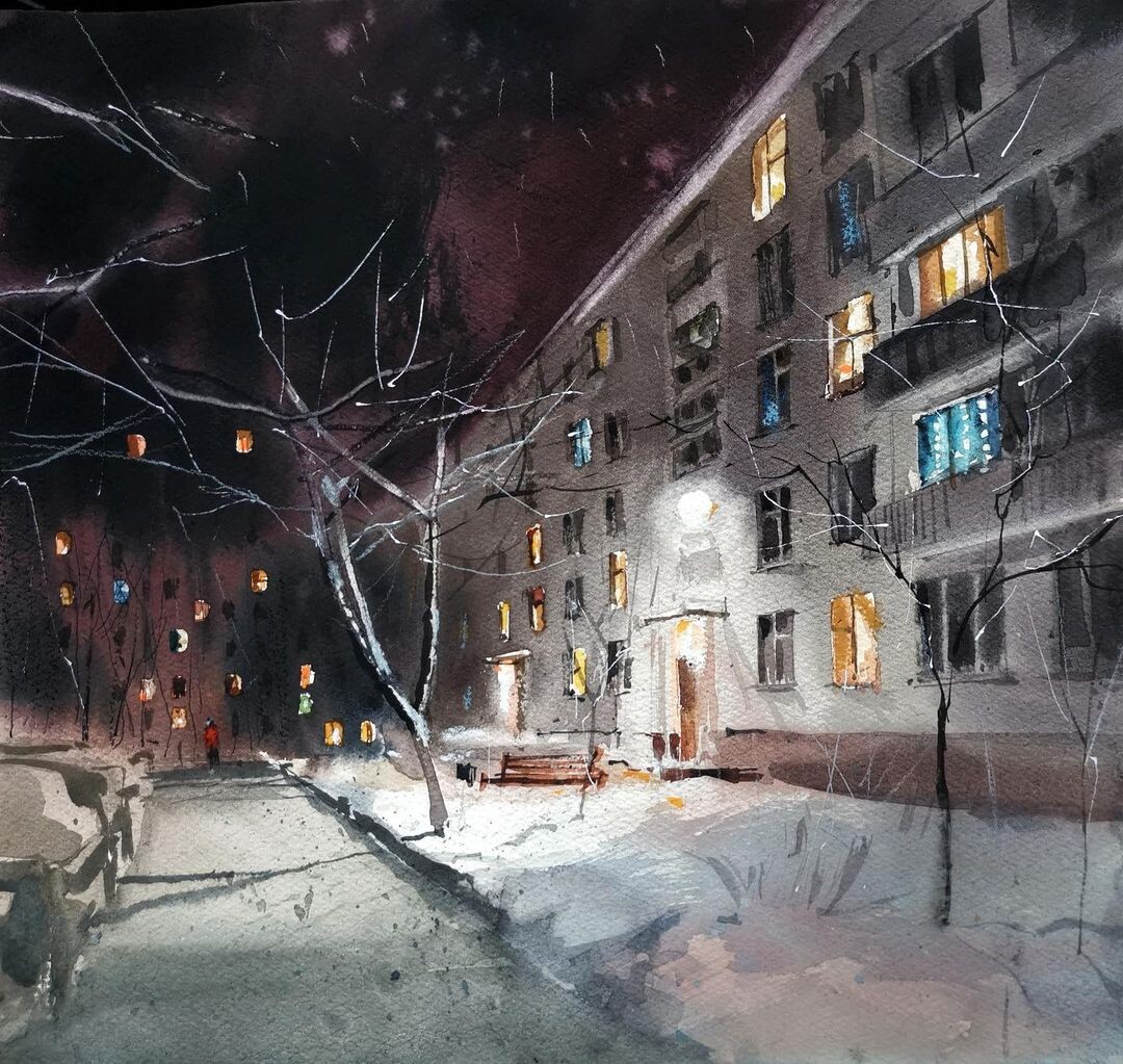 «В тёмное время особенно хочется света! Однажды эта тема органично вошла в моё творчество с приходом осени и зимы. Контрастные яркие лучи фонаря в антураже тёмных дворов, тёплый свет из окон, отражение вечерних улиц и эстетика родных панельных домов в закате.