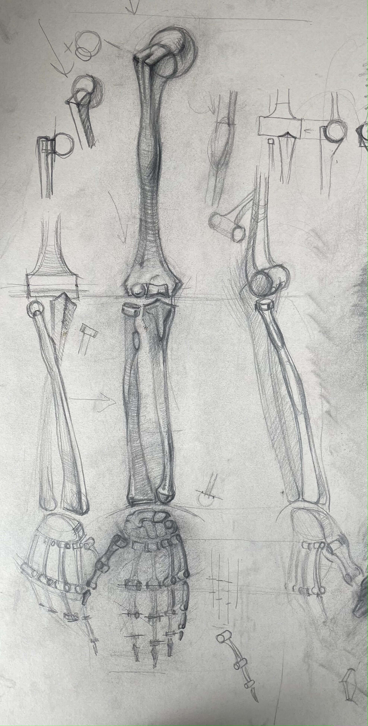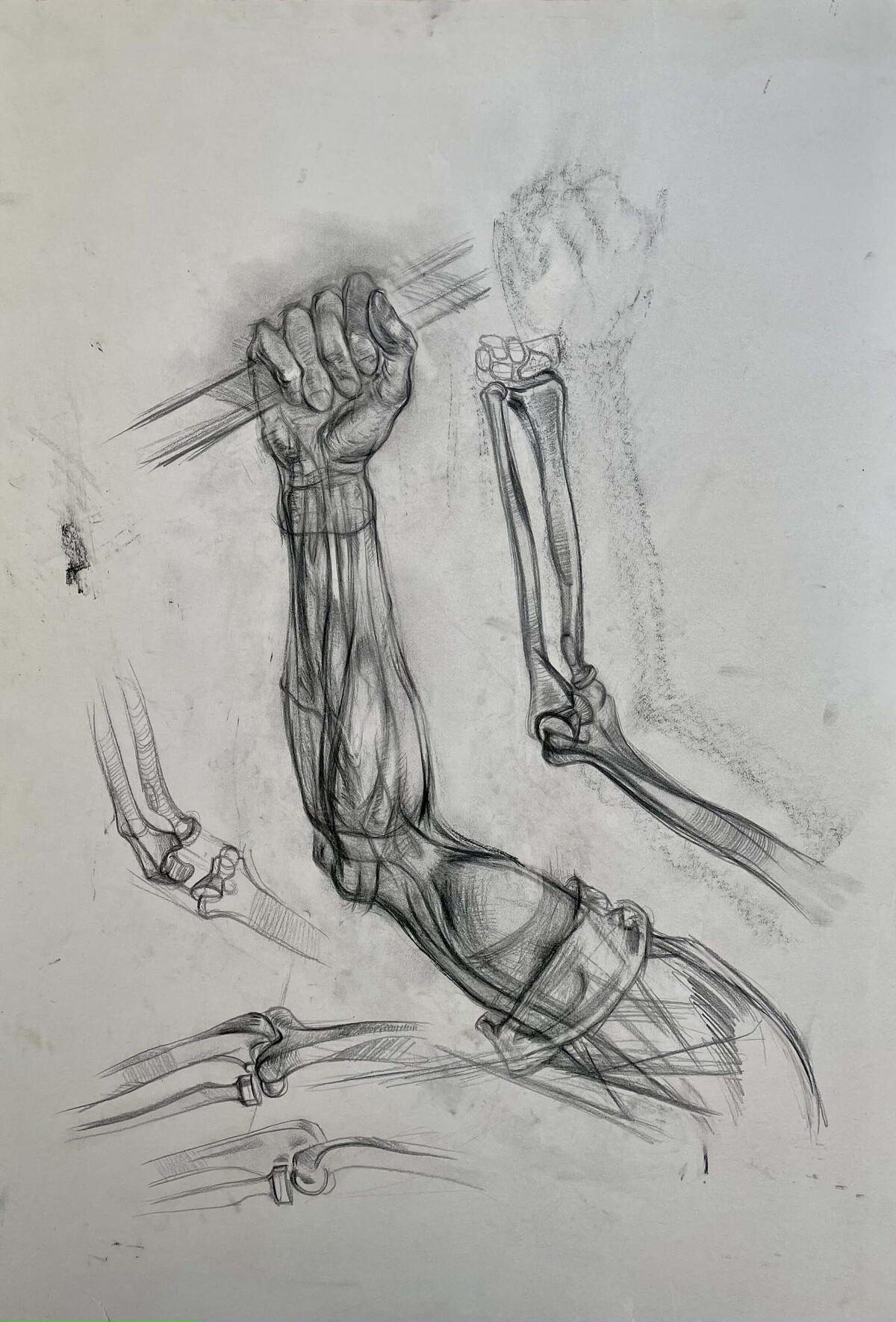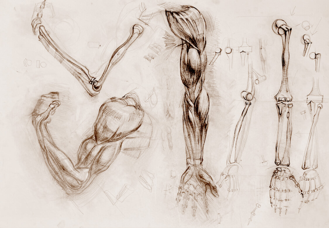 Вы нарисуете многокомпозиционный лист с зарисовкам от костей и мышц до рук в разных разворотах. Такие сложные по компоновке листы рисуют профессиональные художники при работе с эскизами (например, А. Иванов делал множество эскизов анатомии для «Явления Христа народу»). В художественных вузах студенты так компонуют свои рисунки для более детального и удобного изучения анатомии и натуры.