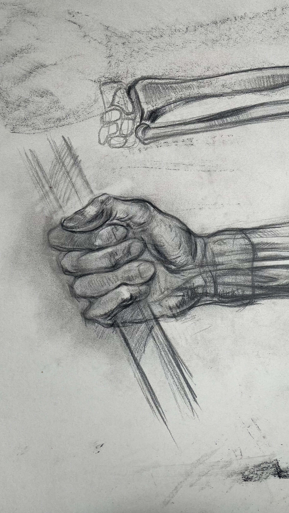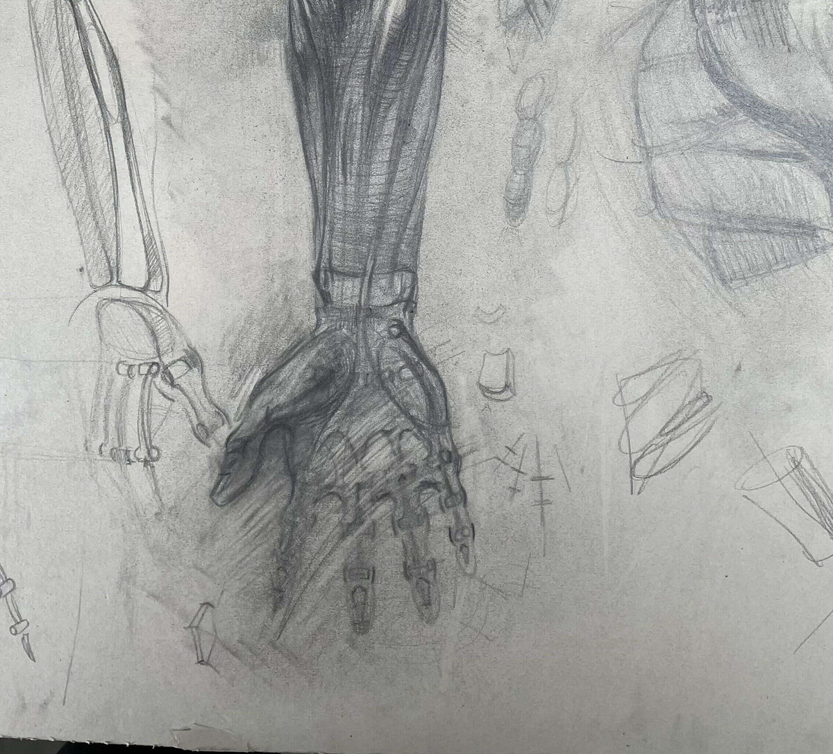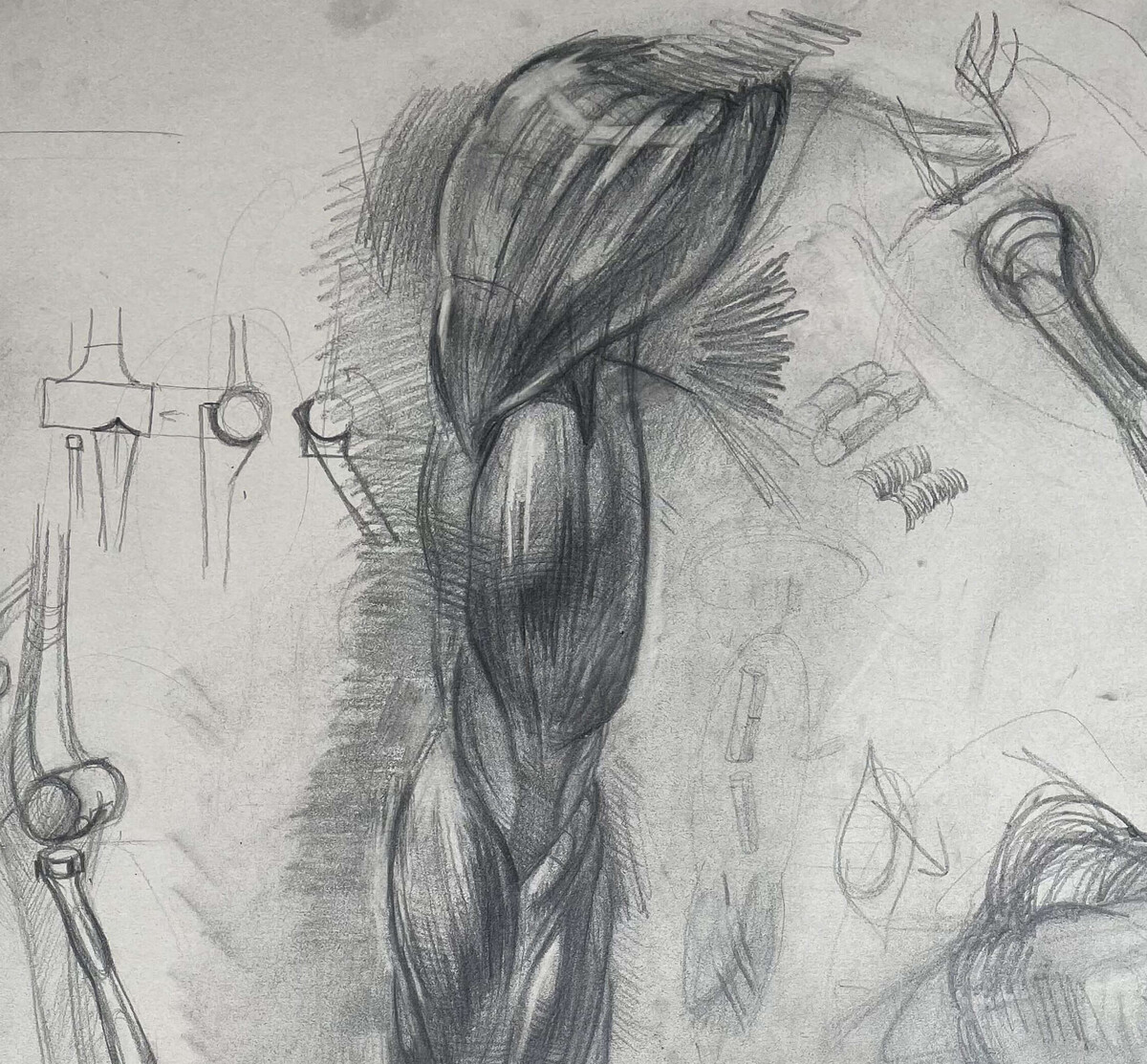 Вы нарисуете многокомпозиционный лист с зарисовкам от костей и мышц до рук в разных разворотах. Такие сложные по компоновке листы рисуют профессиональные художники при работе с эскизами (например, А. Иванов делал множество эскизов анатомии для «Явления Христа народу»). В художественных вузах студенты так компонуют свои рисунки для более детального и удобного изучения анатомии и натуры.