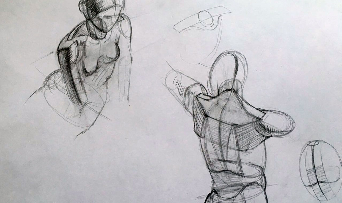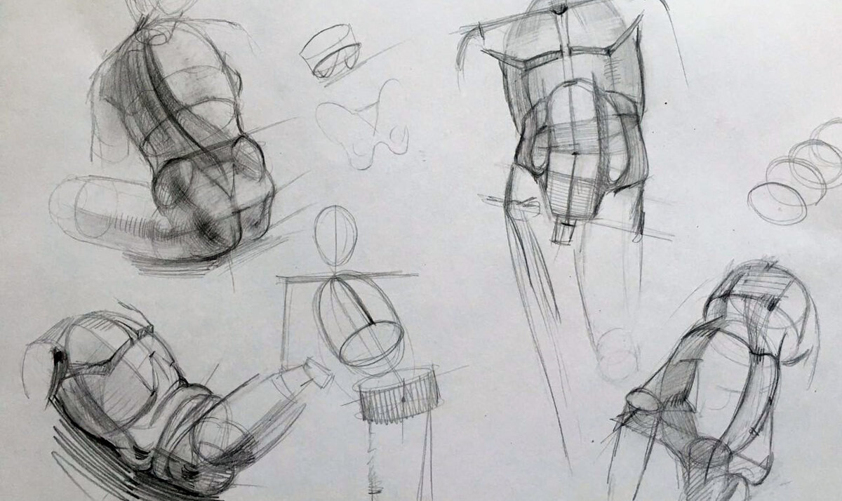 Погружаемся в анатомию через геометрические фигуры. Художник должен понимать геометрию всех элементов и видеть из каких составляющих складываются торс, голова, кисти и другие части тела. На курсе «Геометрия и перспектива» учимся работать с геометрическими фигурами, а затем представлять человека в виде конструктора, состоящего из цилиндров, шаров и конусов.
