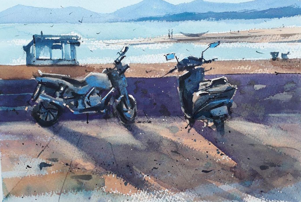 Рисуем незатейливый быт жаркой страны: хижины на побережье океана, помпезную архитектуру Варанаси, заливные рисовые поля и даже самый популярный современный вид транспорта — мотоциклы!
