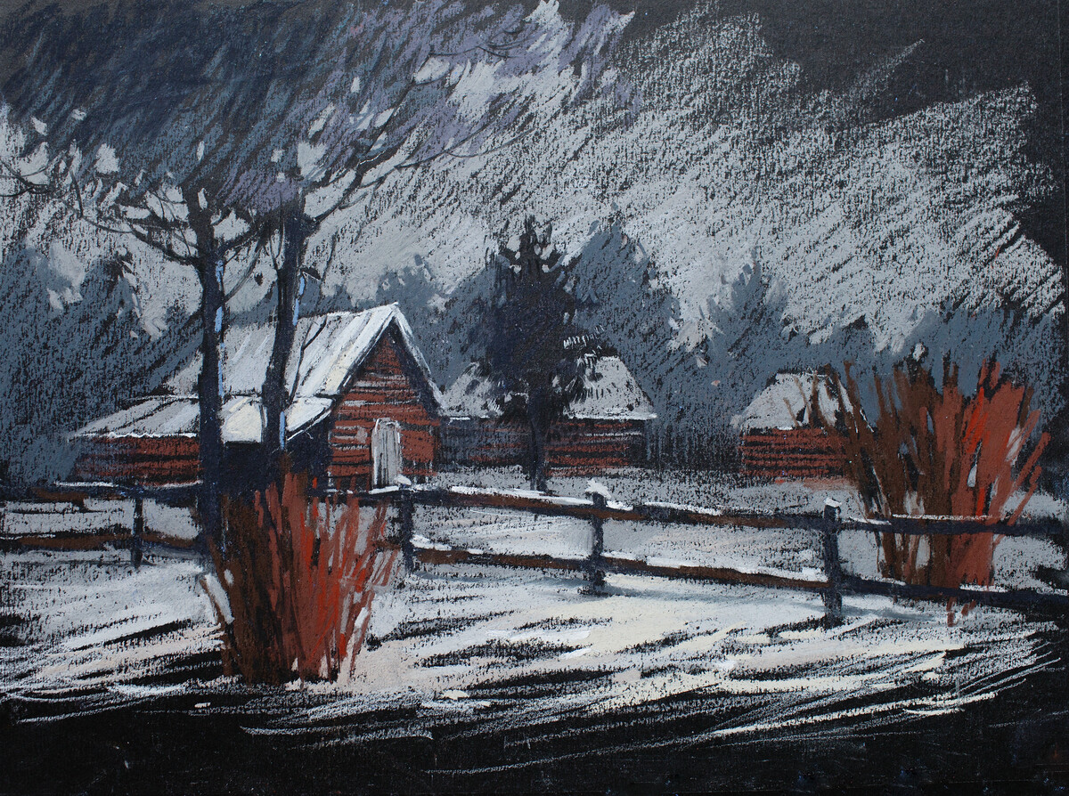 - Рисуем Подмосковье зимой — изображаем Шахматово через сдержанную гамму. Работаем на черной бумаге с минимальным добавлением цвета.