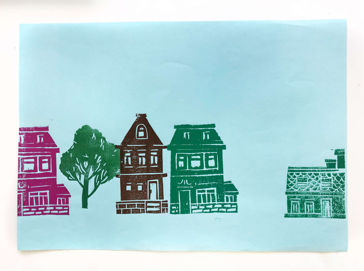 Курс Анны Цымбал — адаптация линогравюры под домашние условия. Вам не нужно покупать дополнительное оборудование. Вы сможете спокойно отпечатать линогравюры на кухонном столе с помощью скалки, например.