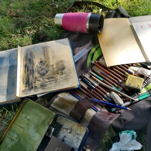 Мы будем работать сухими графическими материалами: углём, соусом, белым карандашом, пастелью. Добавим акценты с помощью коллажа и при желании попробуем тушь. Этот набор даёт богатую фактуру и позволяет передать атмосферу города — от резкой графичности до мягких тональных переходов.