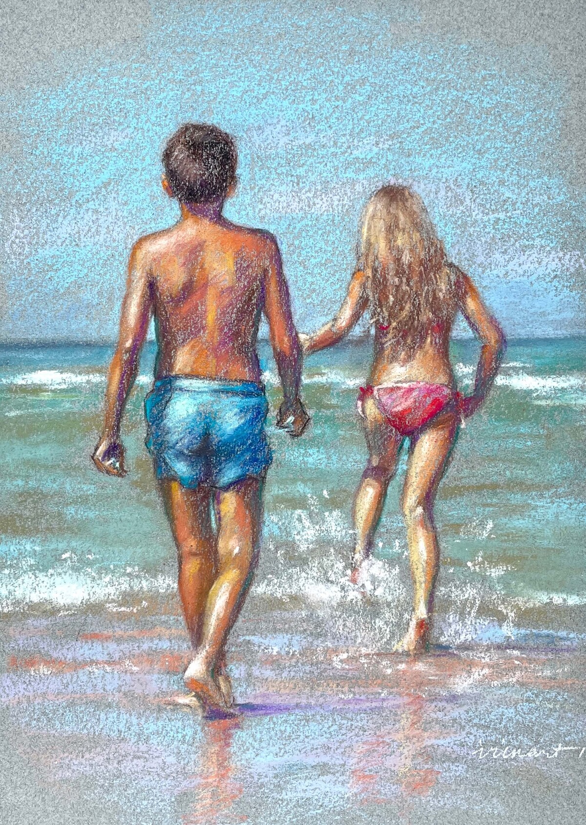 Изображаем детские фигуры в динамике в ракурсе сзади. Тренируем навык рисования пропорций тела человека. Передаем яркое и контрастное солнечное освещение, брызги волн и мокрый песок.