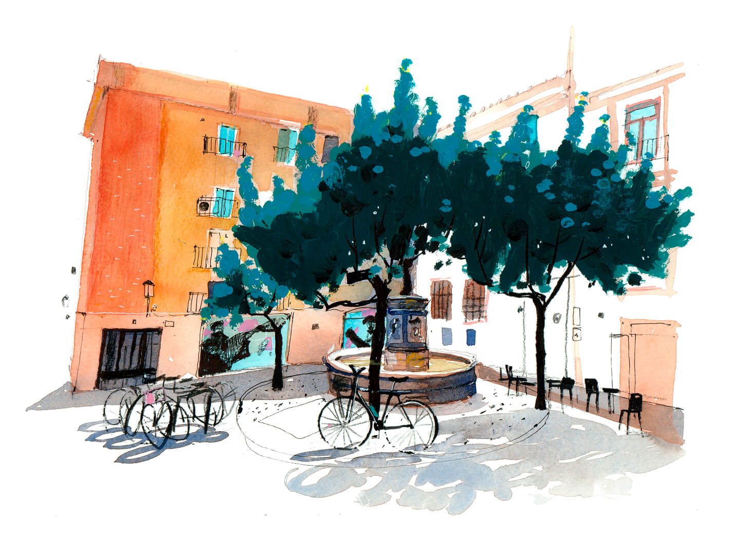 Анастасия Мамошина (Nastia Youkki) — художник, иллюстратор и урбан-скетчер, живёт и работает в Валенсии, Испания. Создаёт атмосферные городские пейзажи в смешанной технике, сочетая акварель, акрил и коллаж. Её стиль — это поэзия улиц, свет, тёплая ирония и тишина, в которой хочется остановиться и рассмотреть детали.