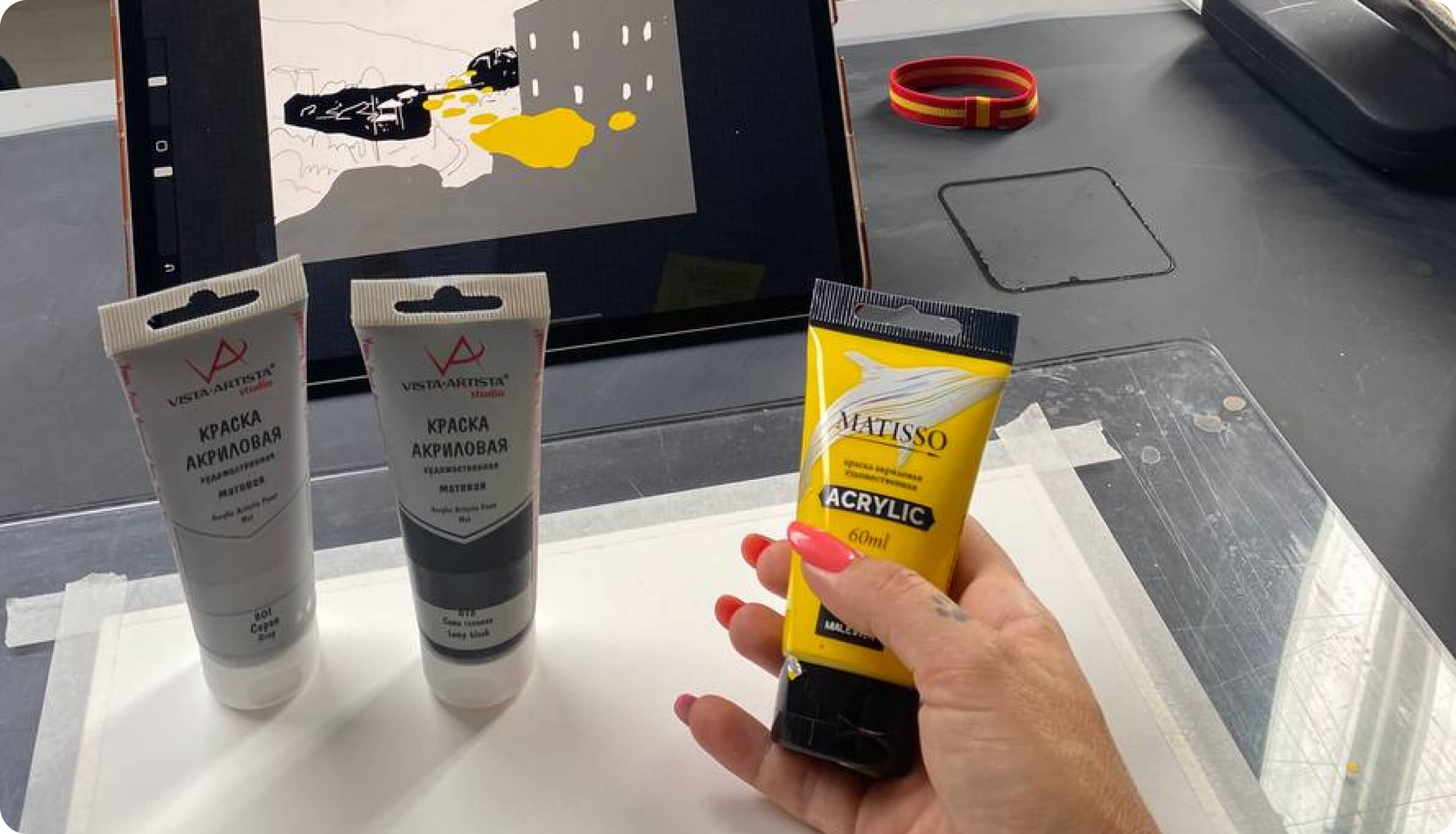 - Акрил матовый (белый, чёрный, голубой, бирюзовый, оранжевый, фиолетовый) или акриловый грунт «Гессо»