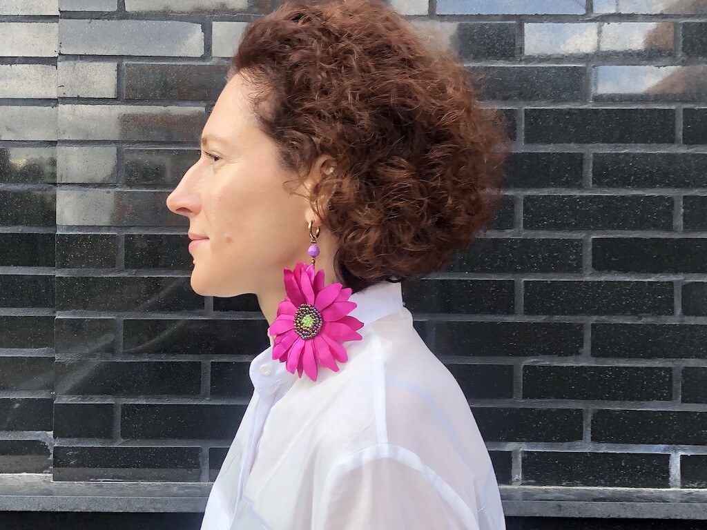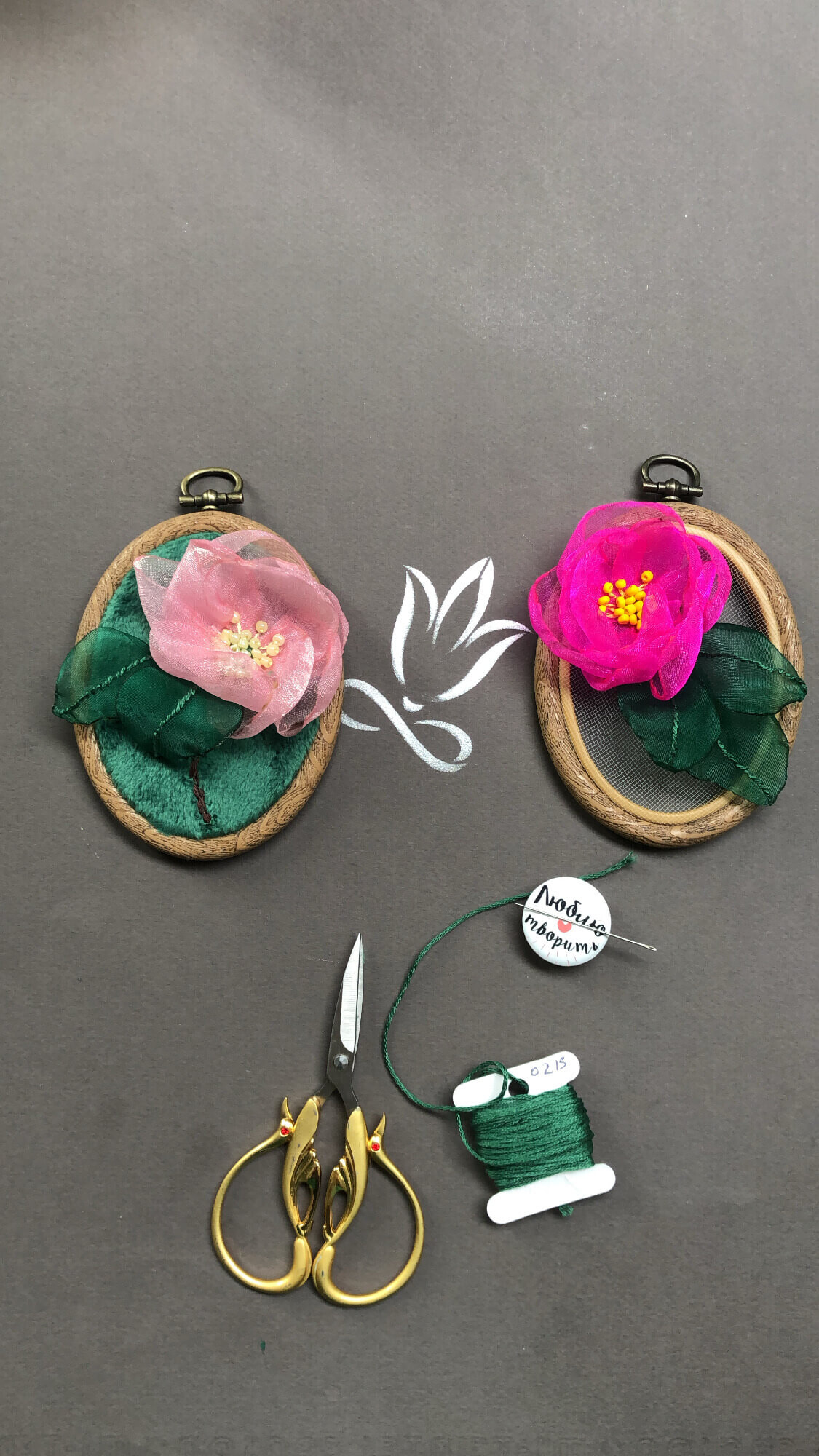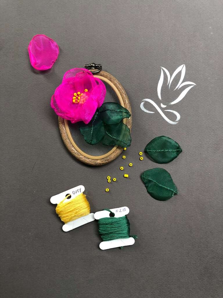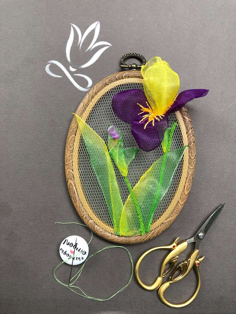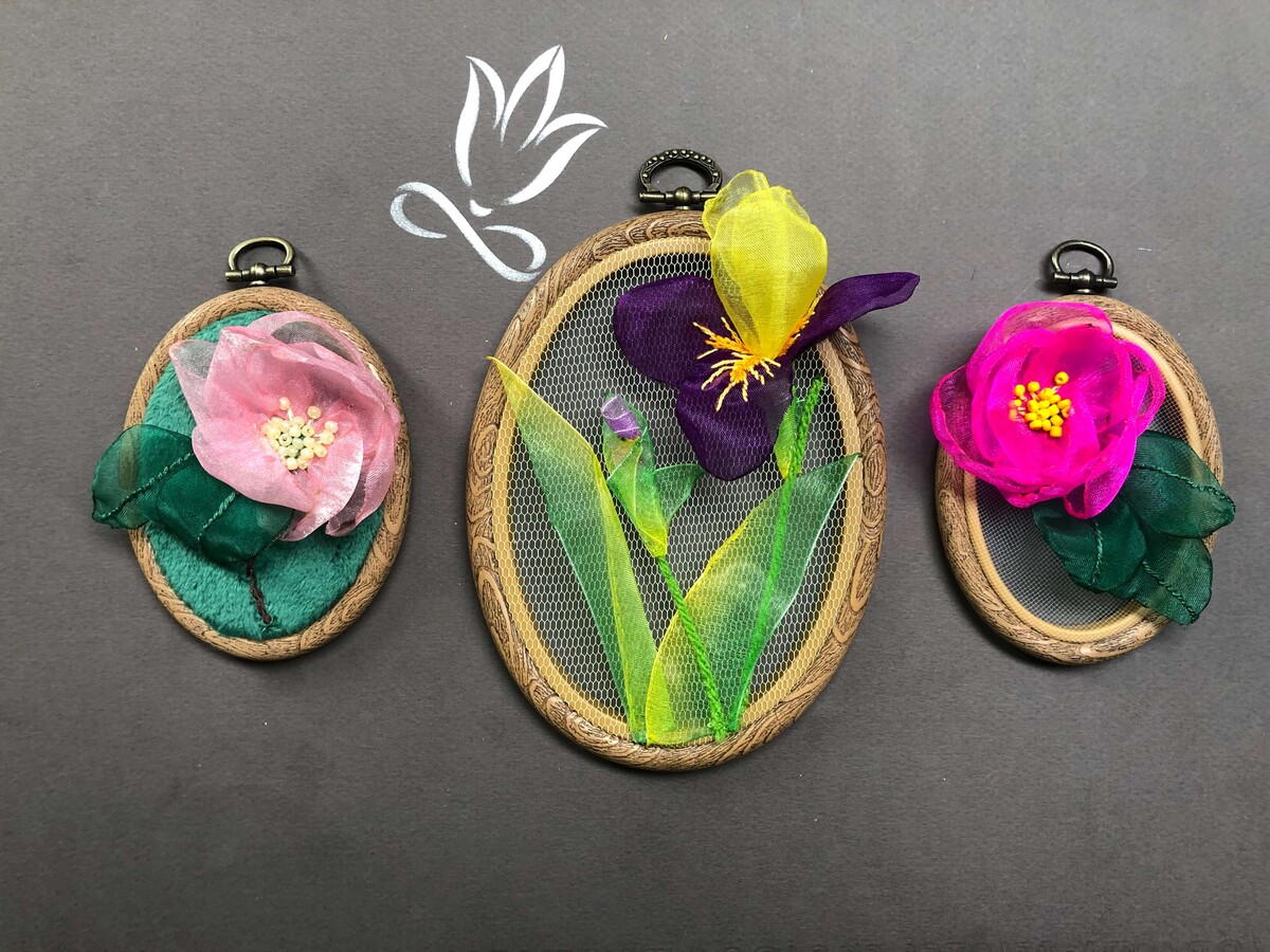 Всё началось с того, что мне захотелось создать образ сада у себя дома, и для этого я выбрала фатин с лёгкими лентами из органзы. Получилось панно, но для курса я адаптировала технику, чтобы создавать не только их, но и броши с серьгами. Конечно, можно использовать эти идеи для создания других вещей, но в курсе мы работаем именно с этими изделиями».
