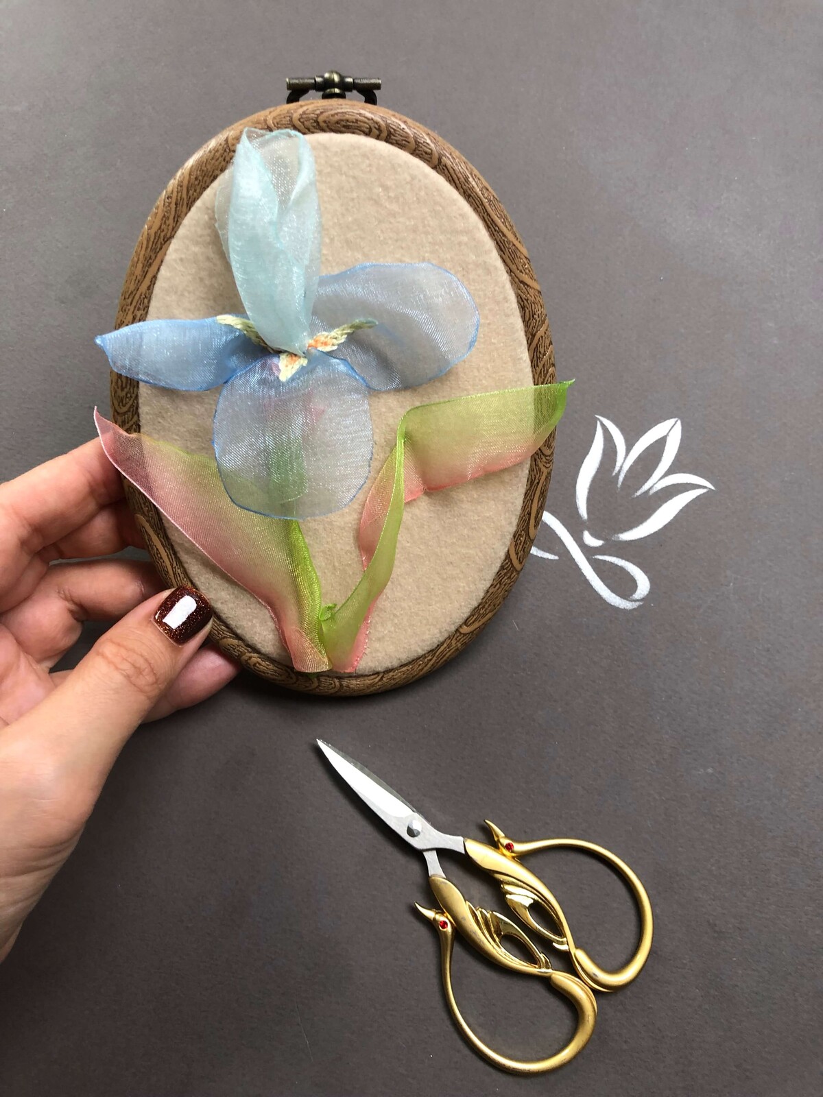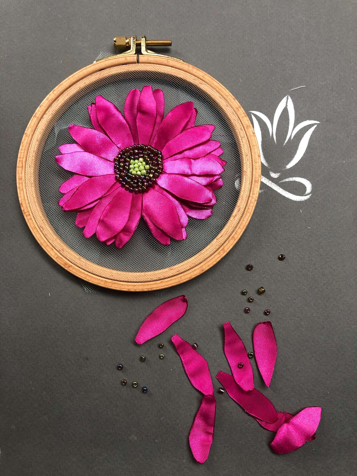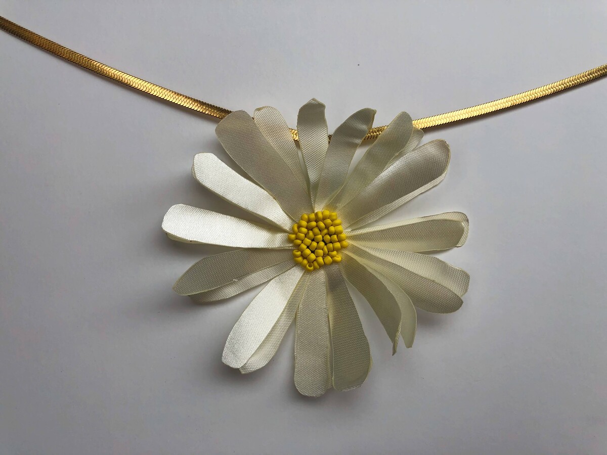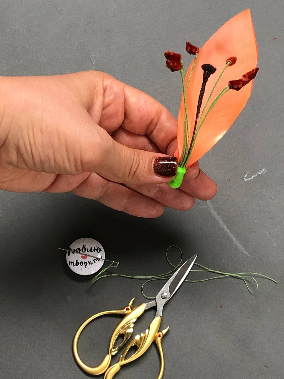 Всё началось с того, что мне захотелось создать образ сада у себя дома, и для этого я выбрала фатин с лёгкими лентами из органзы. Получилось панно, но для курса я адаптировала технику, чтобы создавать не только их, но и броши с серьгами. Конечно, можно использовать эти идеи для создания других вещей, но в курсе мы работаем именно с этими изделиями».