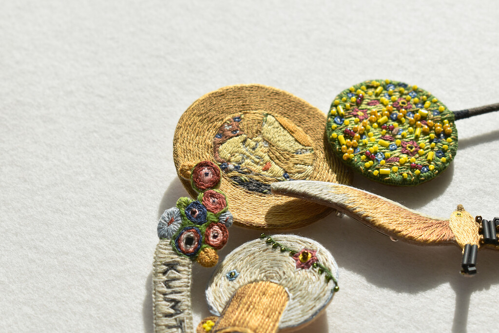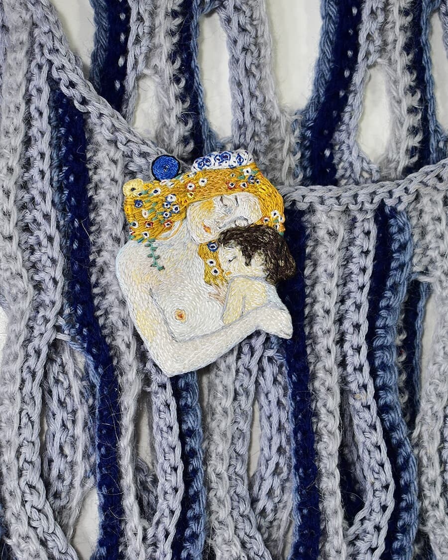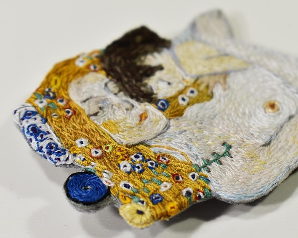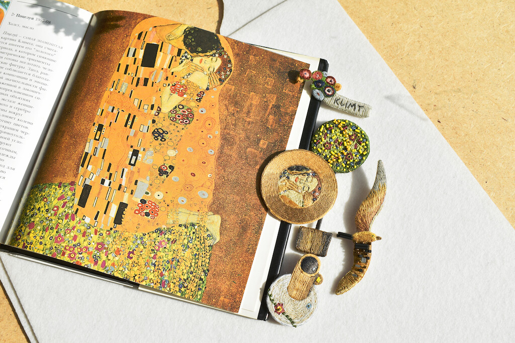 В основу брошей нашего курса я взяла картину Густава Климта „Поцелуй“. Мне захотелось добавить в неё птиц, растений, интерьерных деталей. Подобрав нити по гамме, я создала эти новые объекты и поместила их на картину.