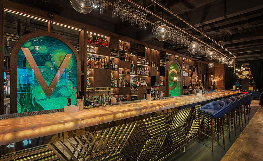 I VAN GOGH — рестобар и арт-пространство с нестандартным форматом: в названии игра слов, эксцентричные оттенки в дизайне, и авторский подход к меню и барной карте.