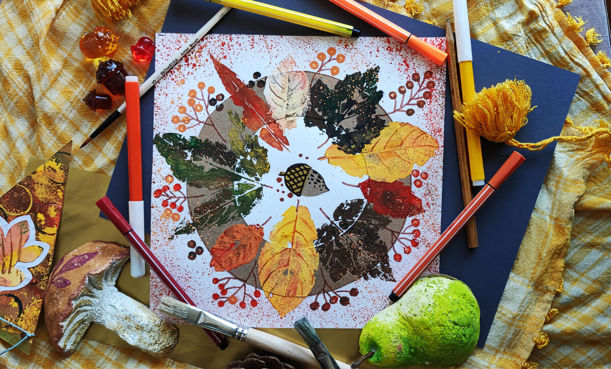 - Делаем осенний венок из опавших листьев и красок в технике монотипия