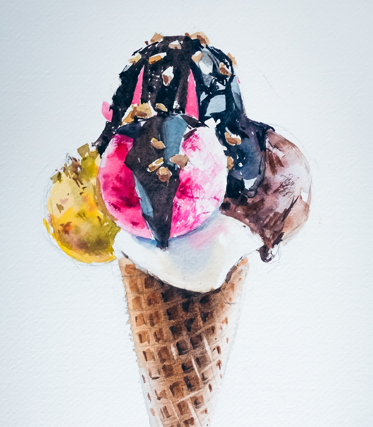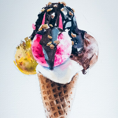 На онлайн-занятиях мы учимся изображать сладкую глазурь, тягучий шоколад и невесомое безе, а также текстуру подтаявшего мороженого и фактуру вафельного стаканчика.