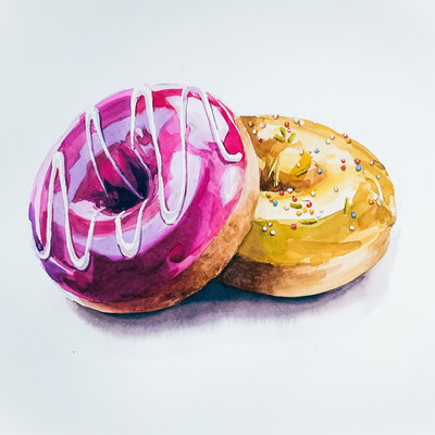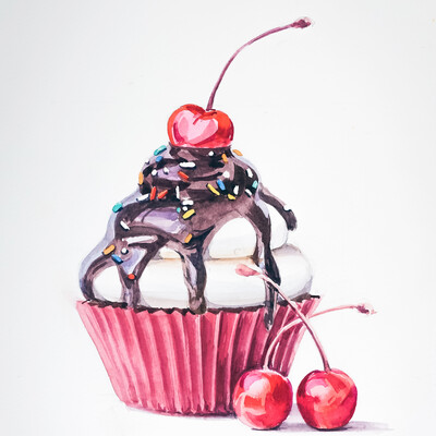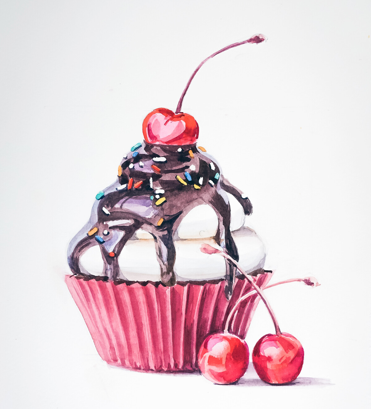 Друзья, мини-курс «Вкусные сладости» — это несколько онлайн-уроков моего авторства, в которых мы учимся рисовать акварелью аппетитные десерты.