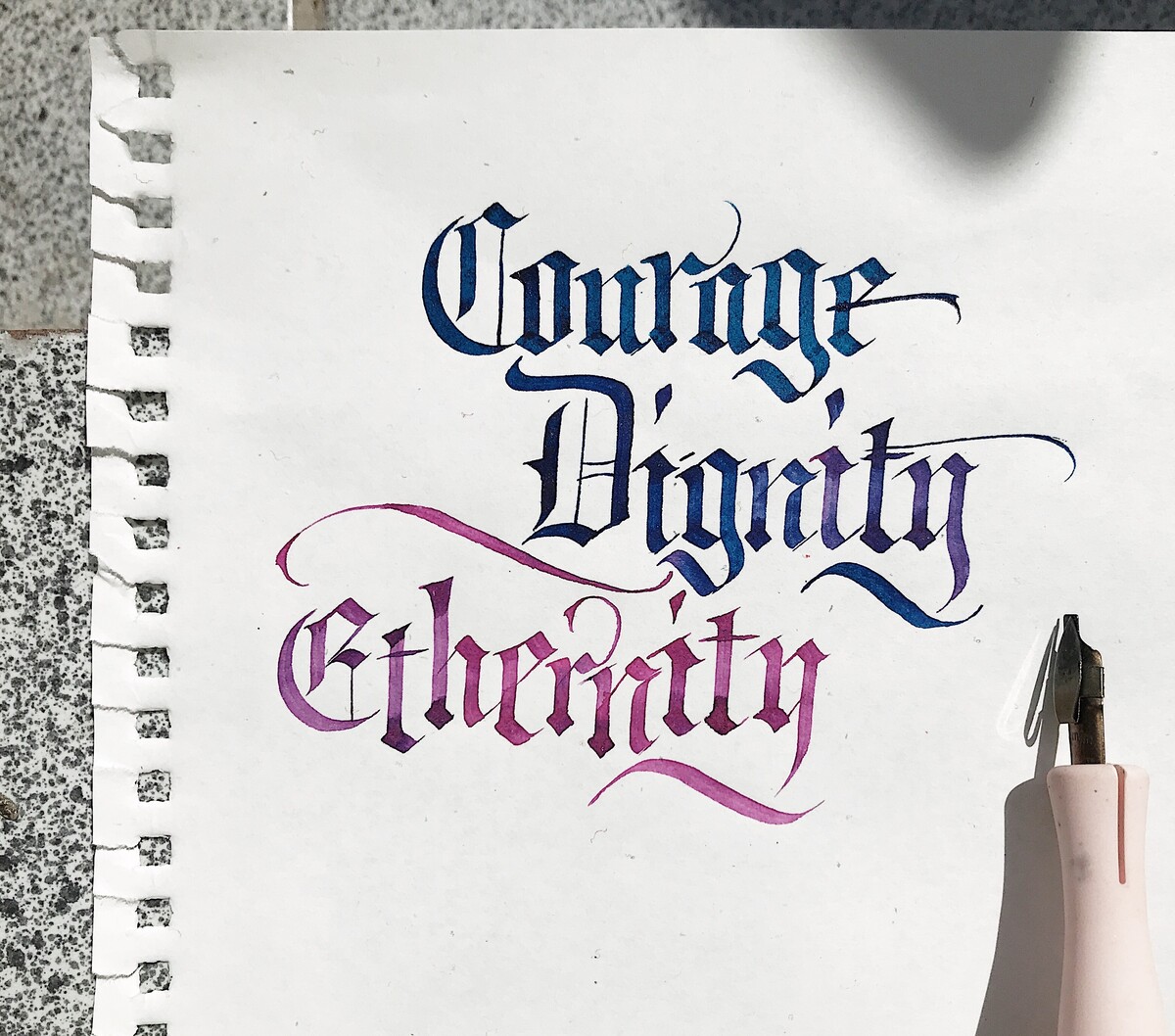 Трепетное начало дня: напишем первое слово почерком Textura Quadrata! Дальше — интереснее: будем составлять композиции из нескольких слов на листе.