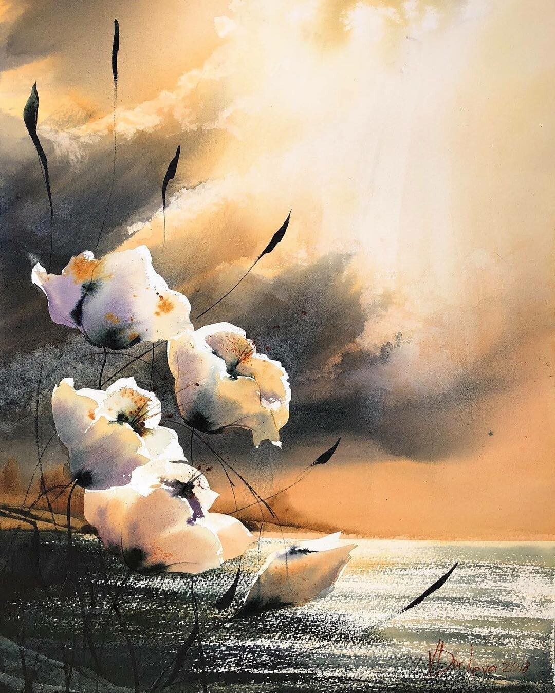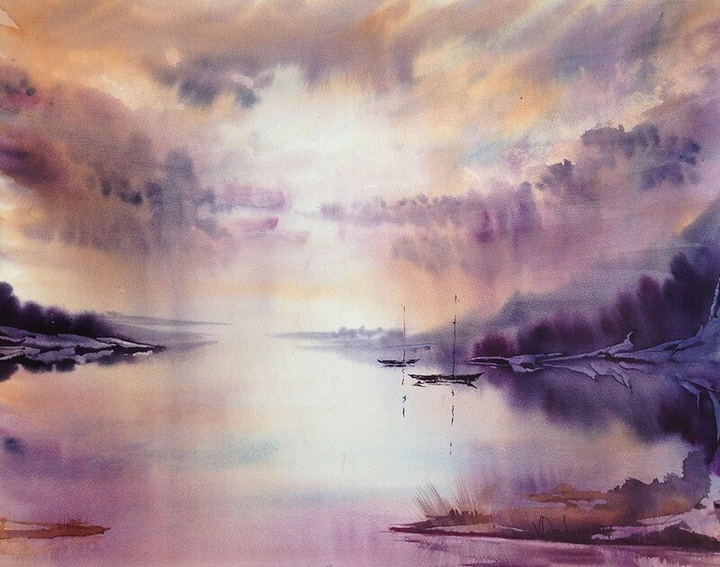 Вдохновенно пишет акварелью природные сюжеты: закаты, рассветы, воду, цветы.