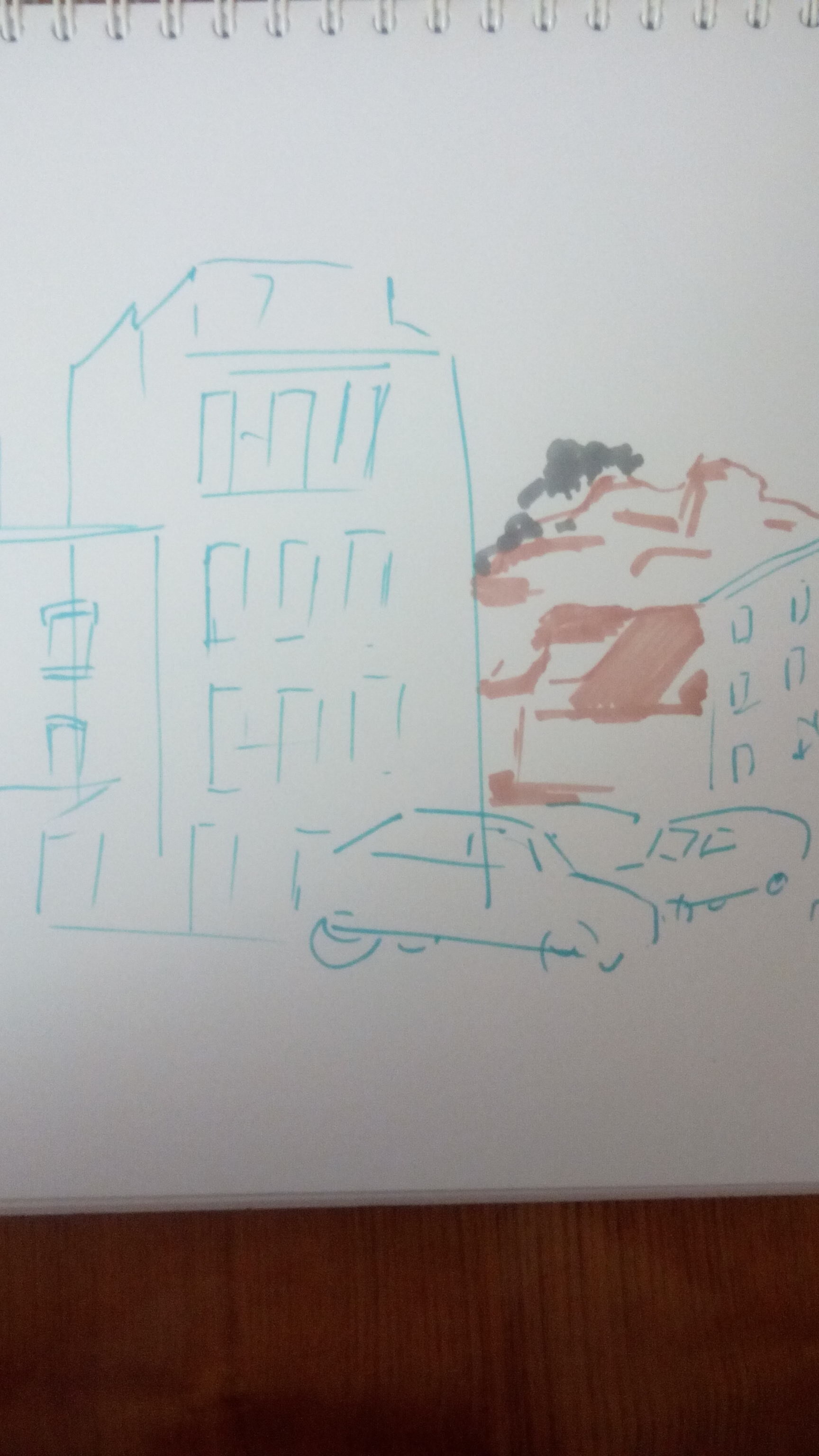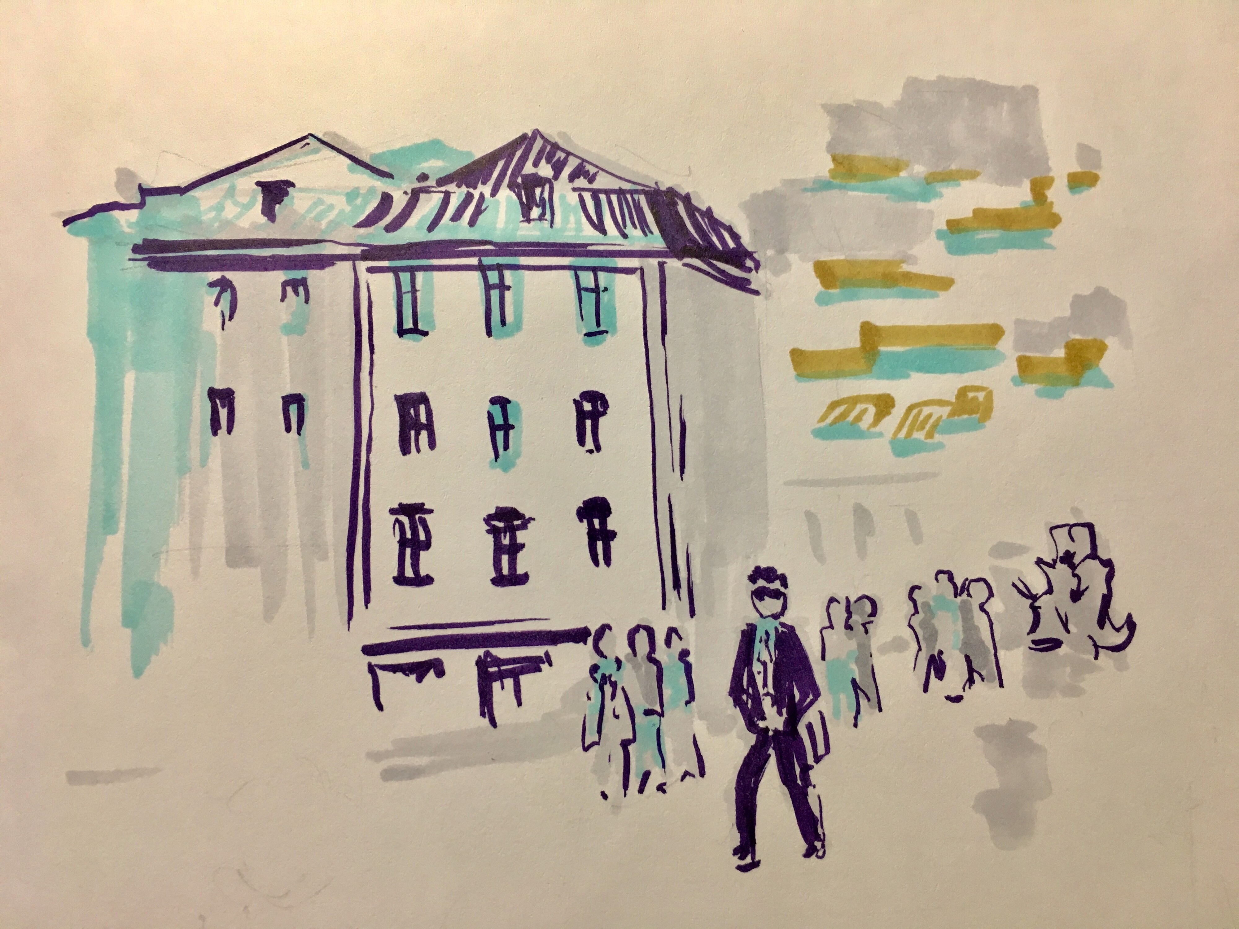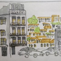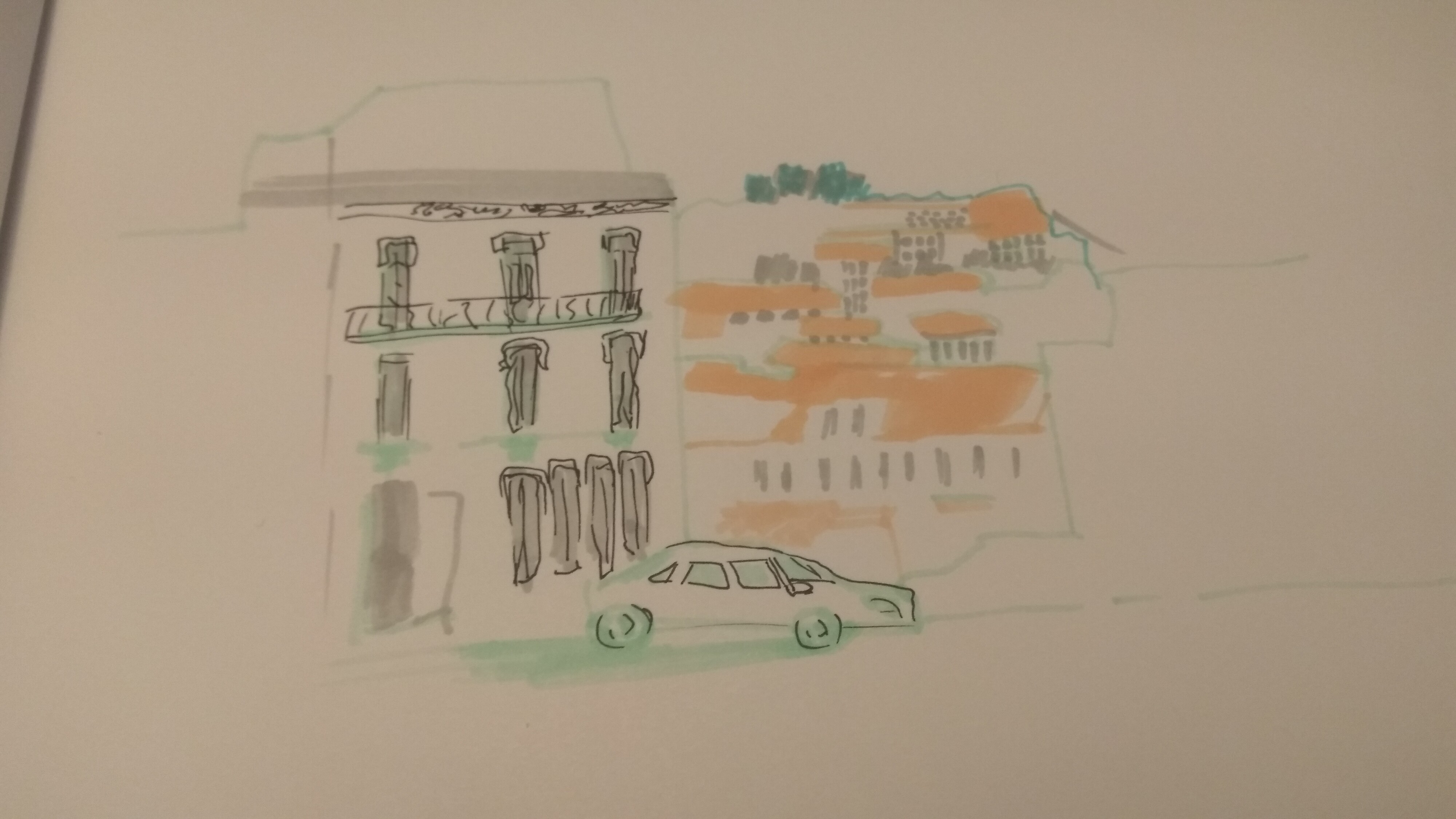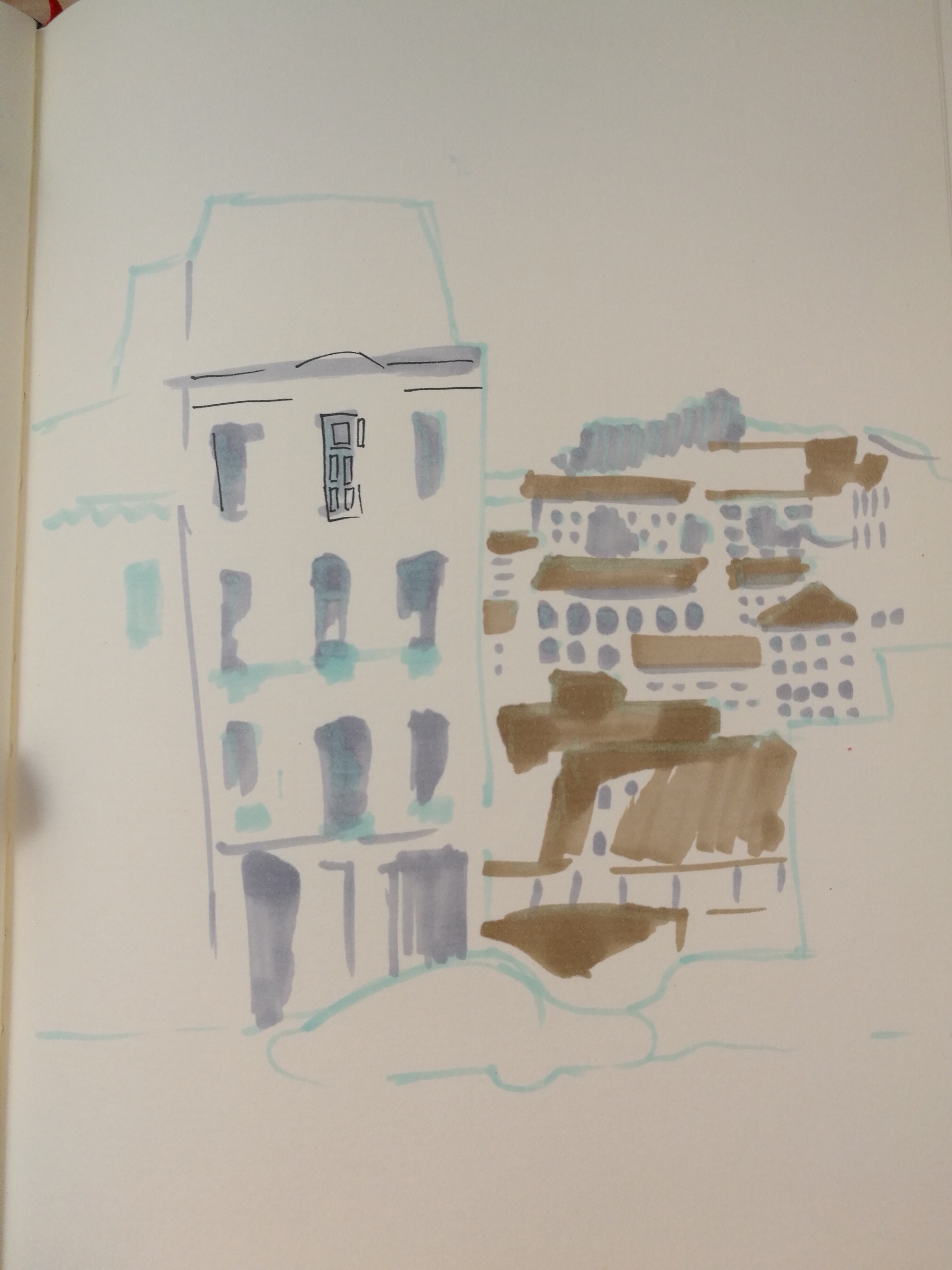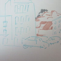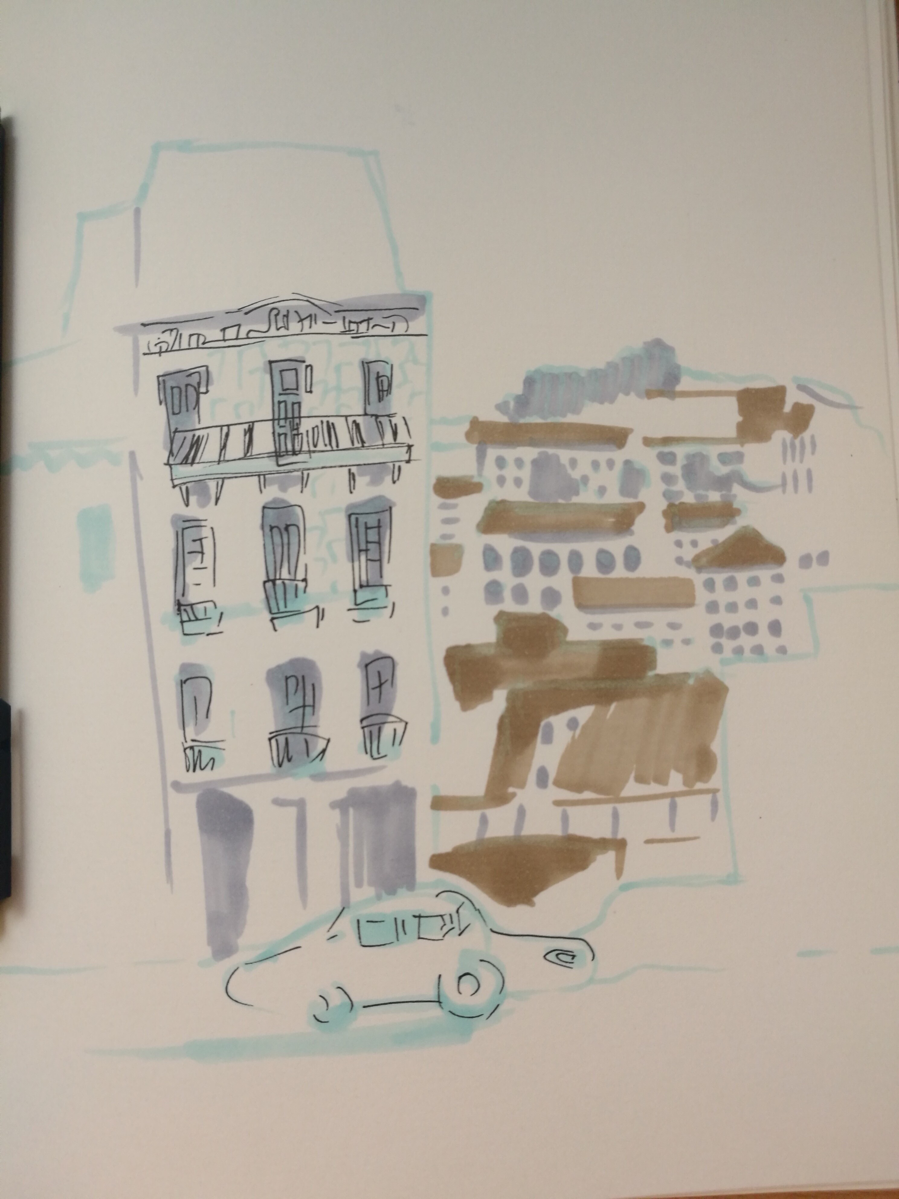Учимся видеть группы домов, машин, пешеходов и пробуем передать на бумаге характер города ограниченным количеством маркеров.