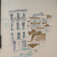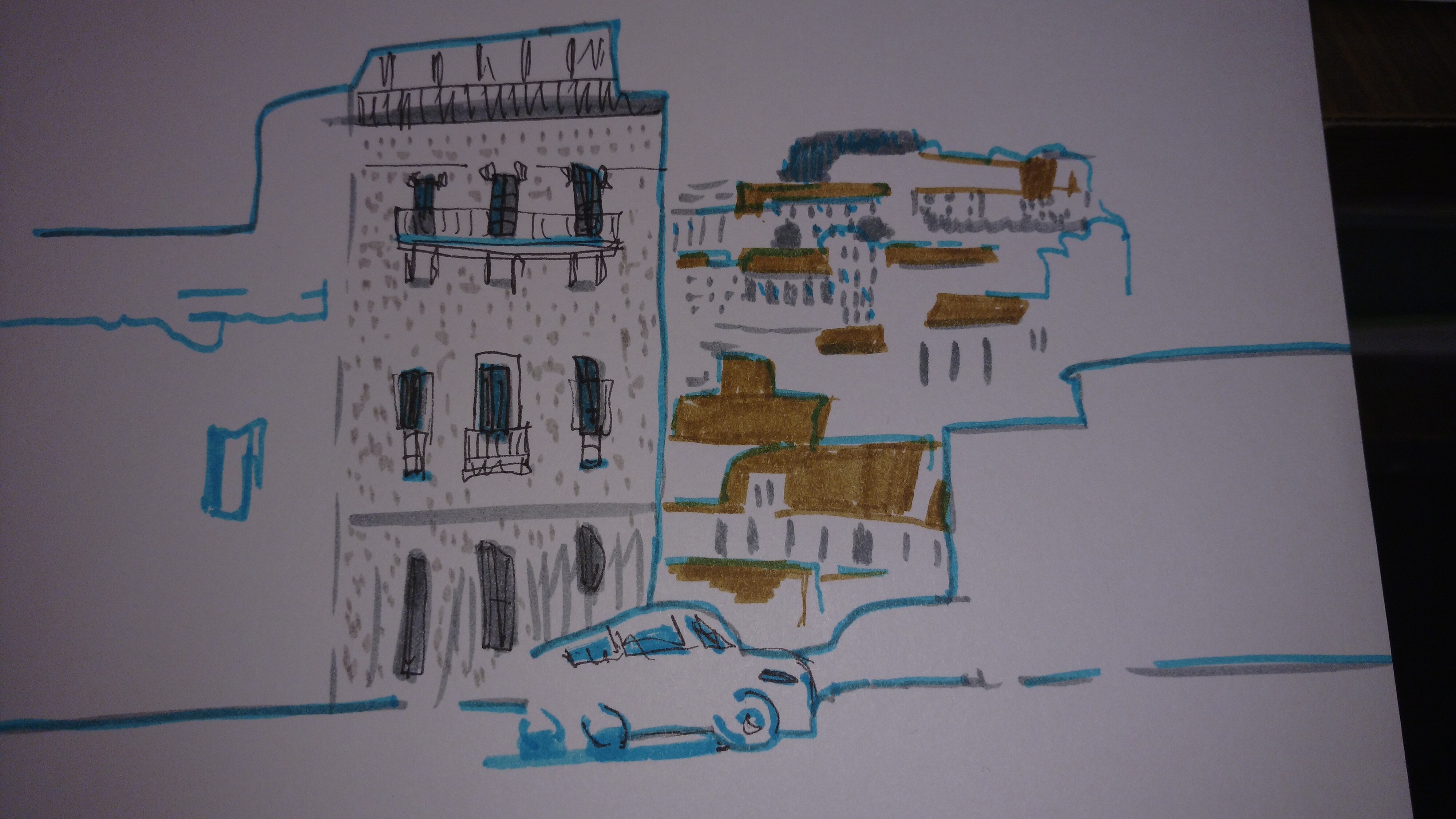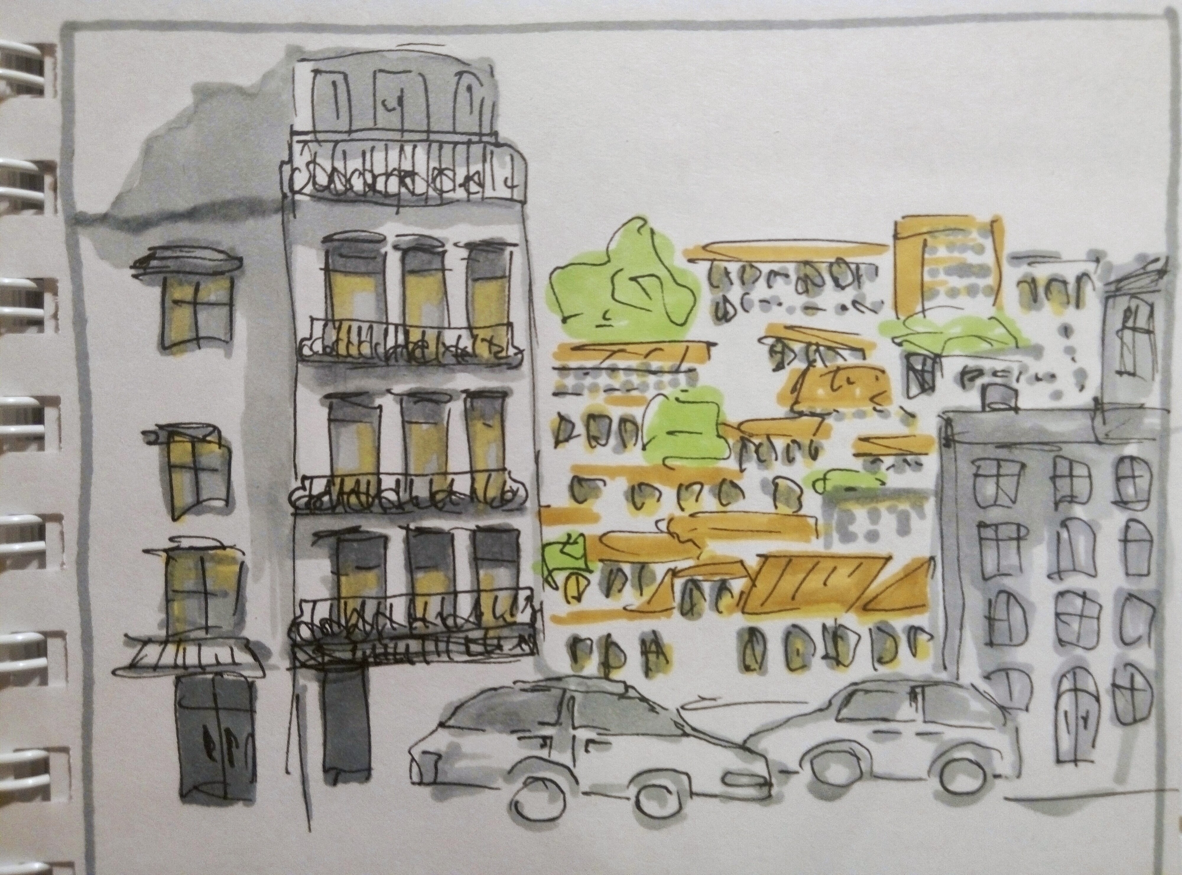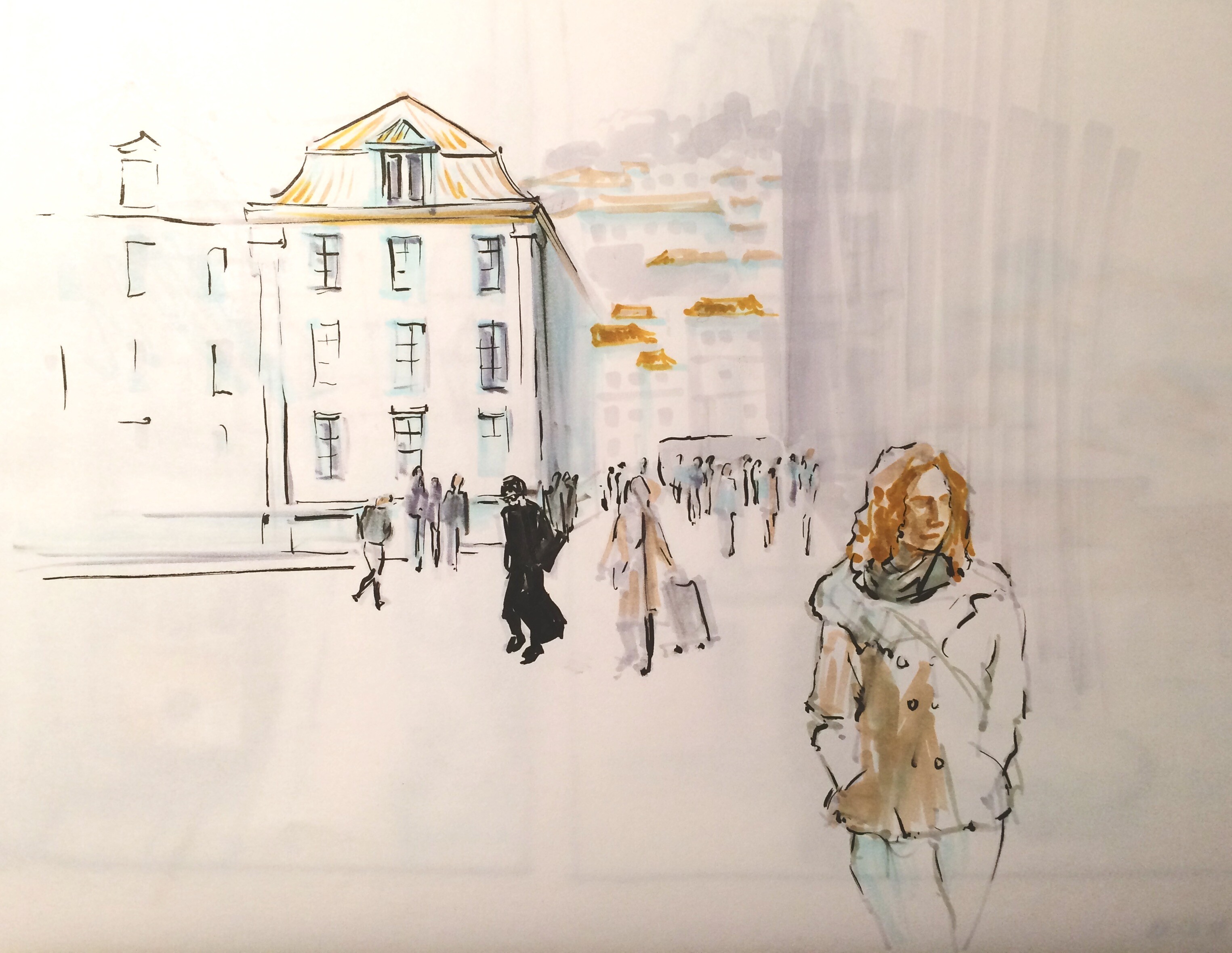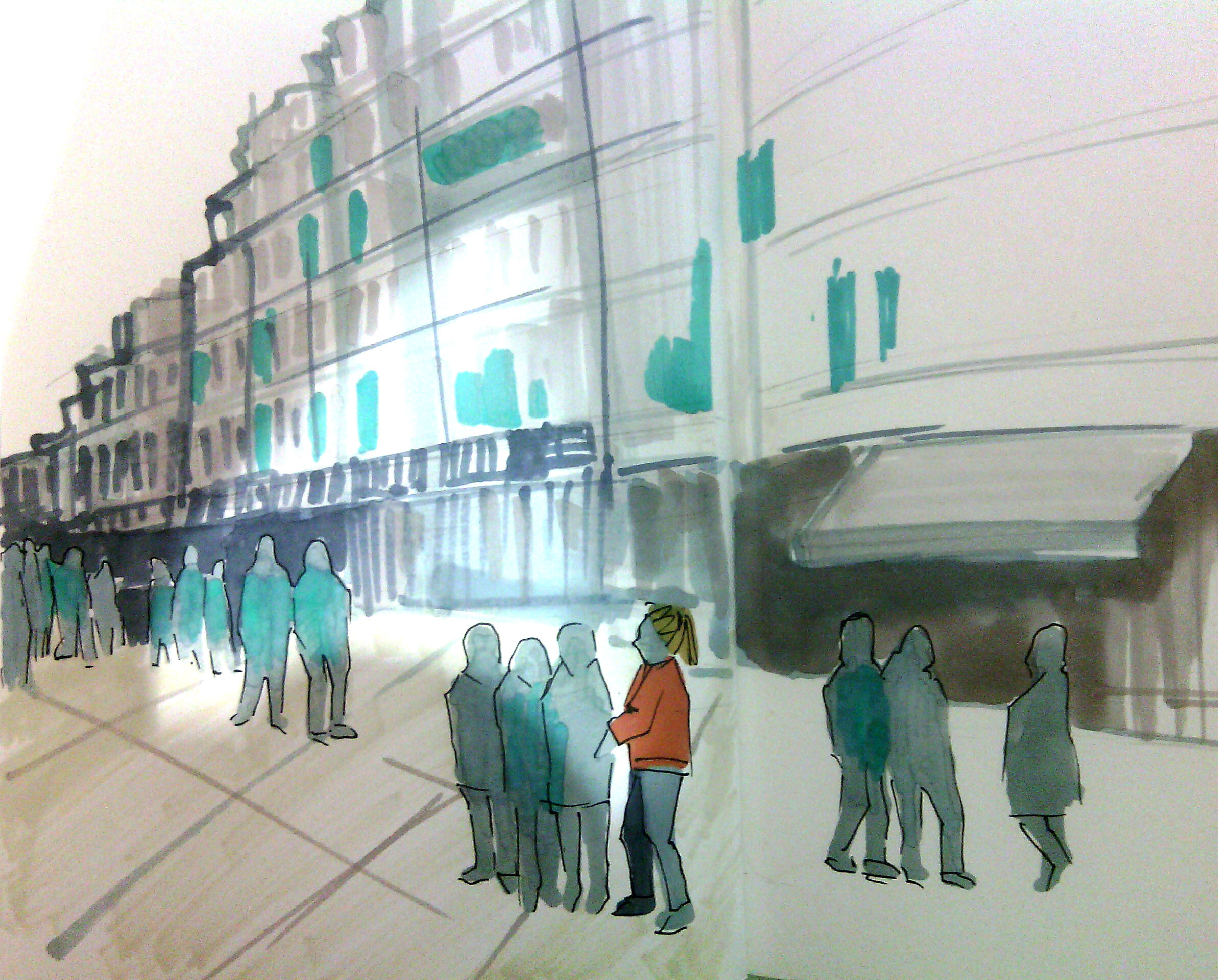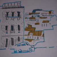 Учимся видеть группы домов, машин, пешеходов и пробуем передать на бумаге характер города ограниченным количеством маркеров.