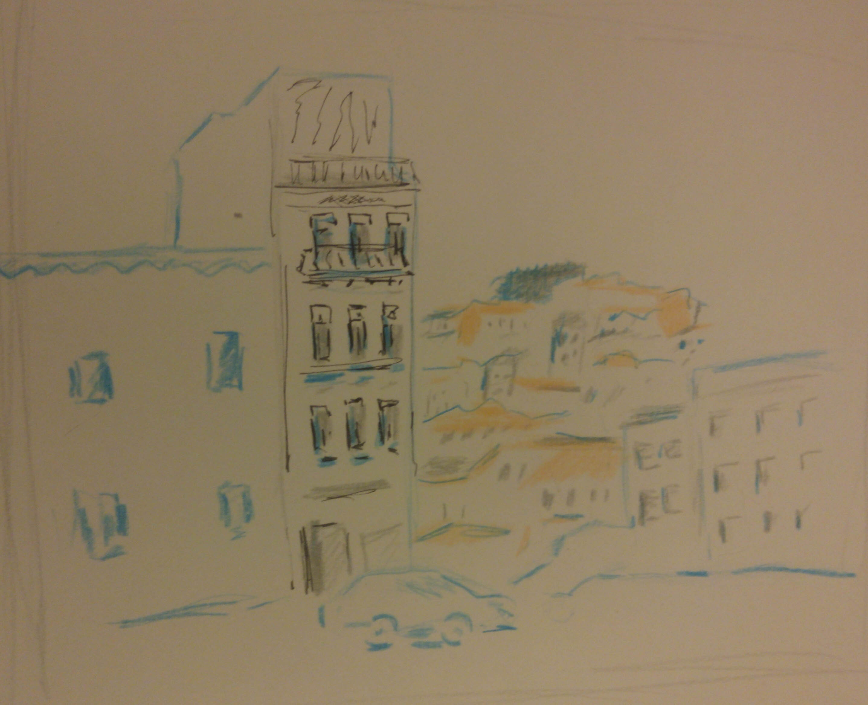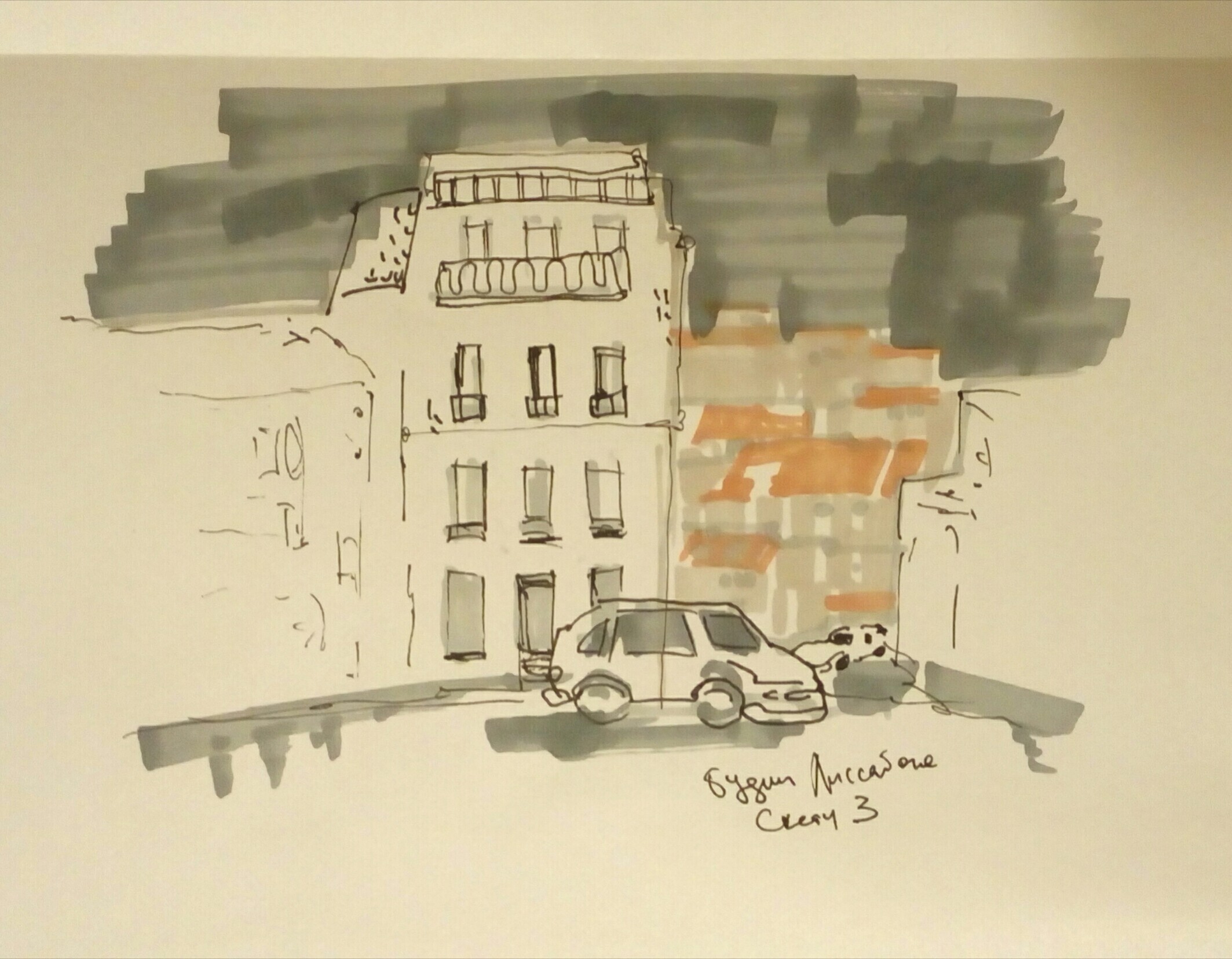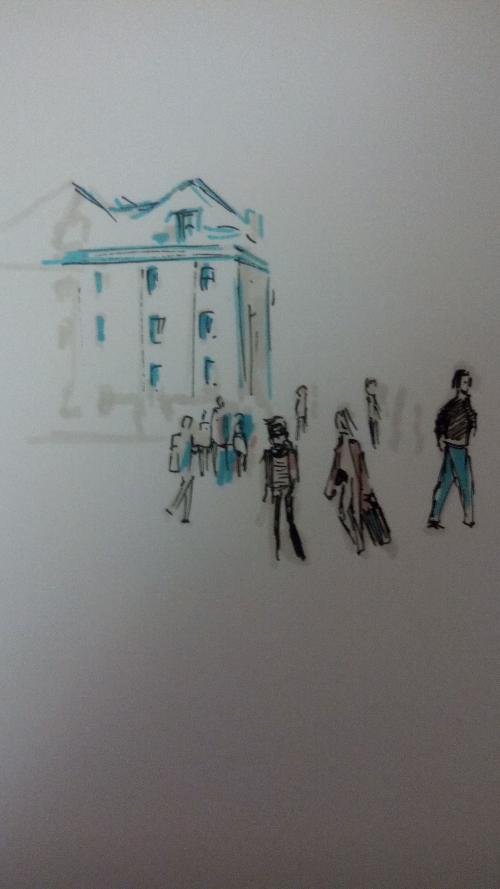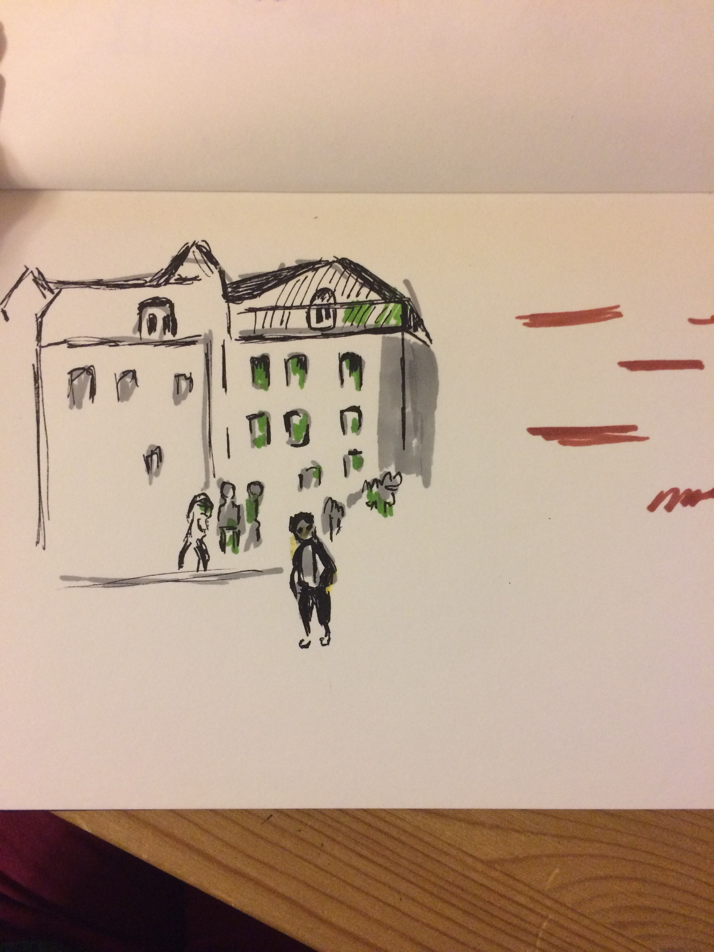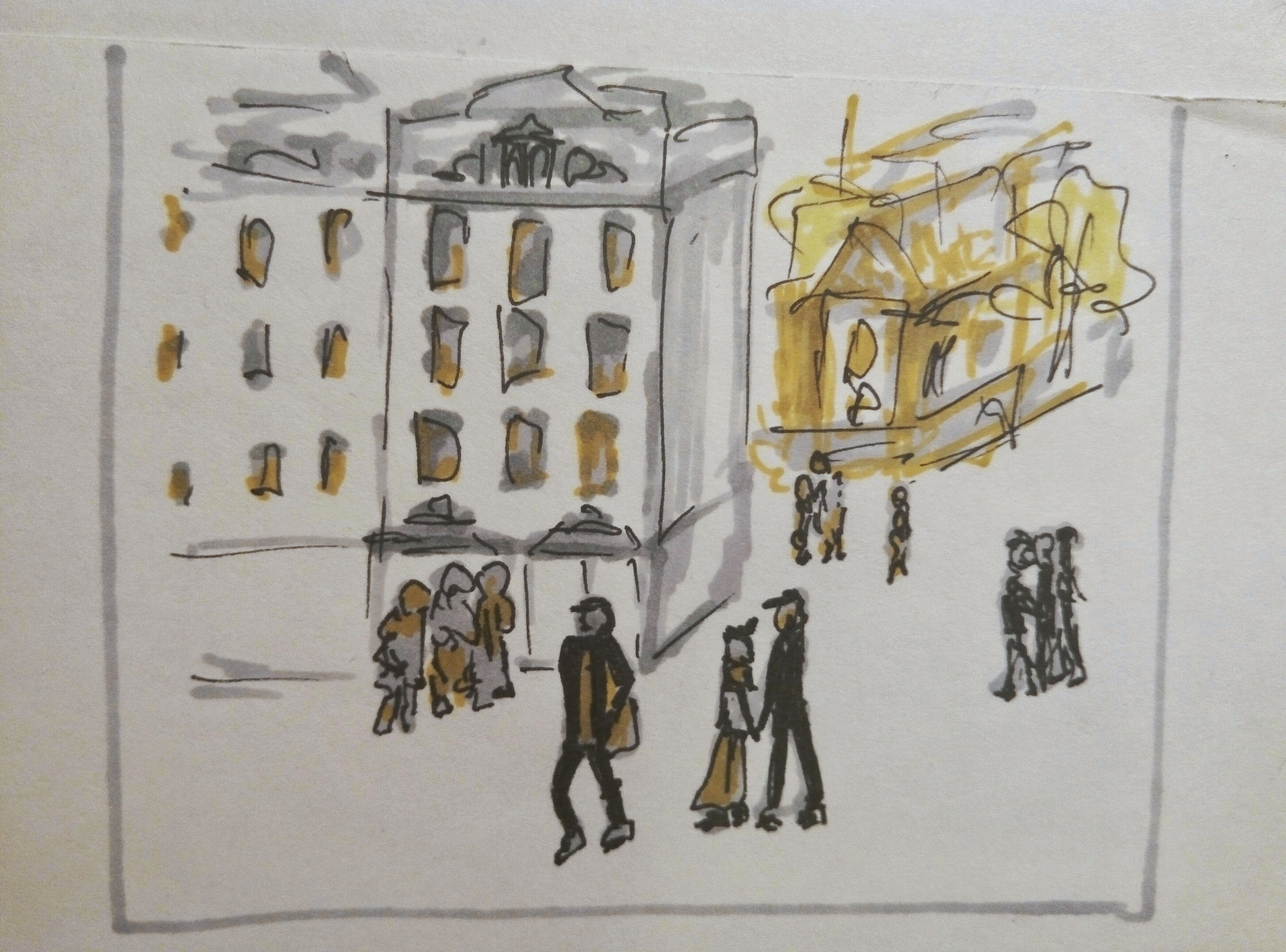 Учимся видеть группы домов, машин, пешеходов и пробуем передать на бумаге характер города ограниченным количеством маркеров.