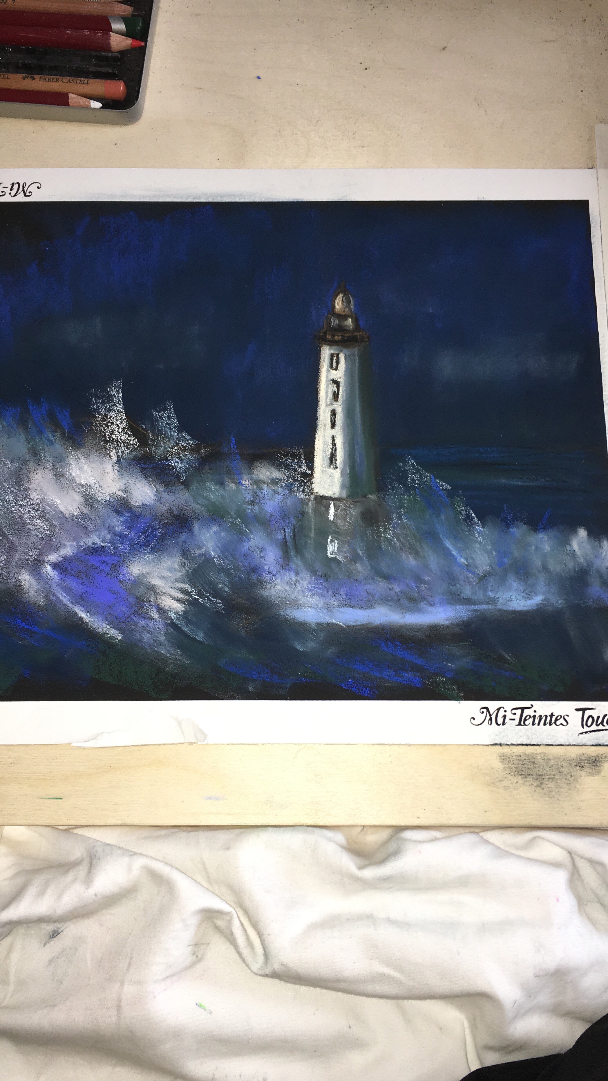 Темные оттенки, обычно, редкость для стандартных наборов. Нам понадобятся темно-зеленые, темно-синие, темные серо-синие, темные серо-фиолетовые. У Rembrandt они идут с индексом 2, попадаются в наборах Mungyo, много у Schmincke. Достаточно пары мелков. Иначе придется смешивать с черным.