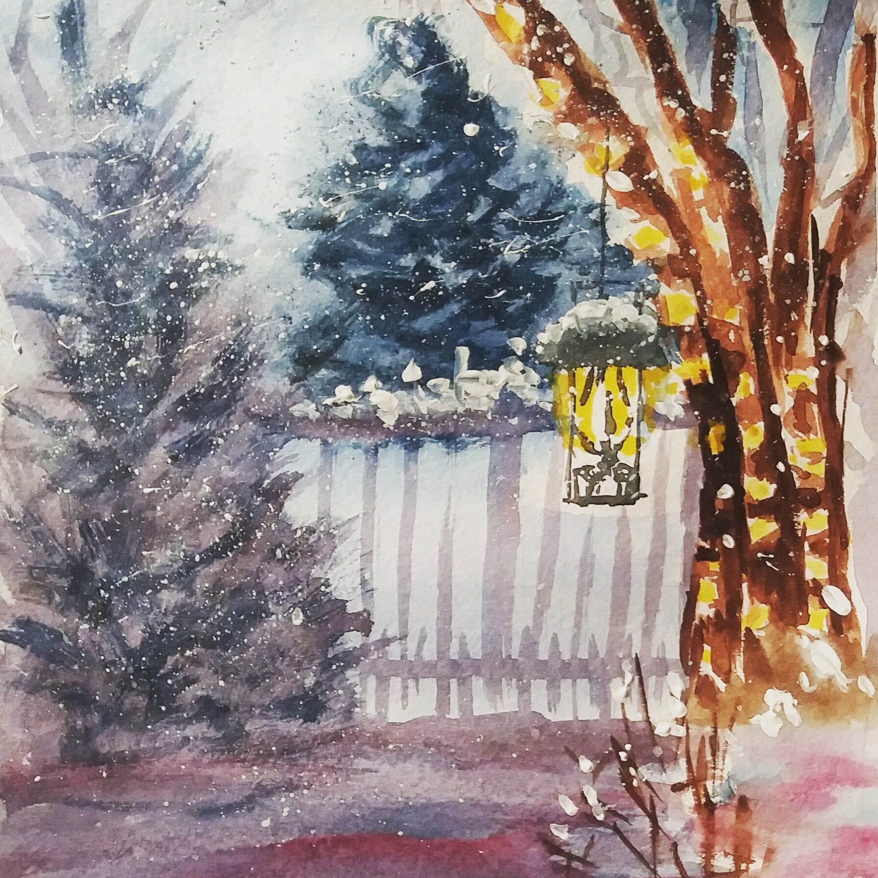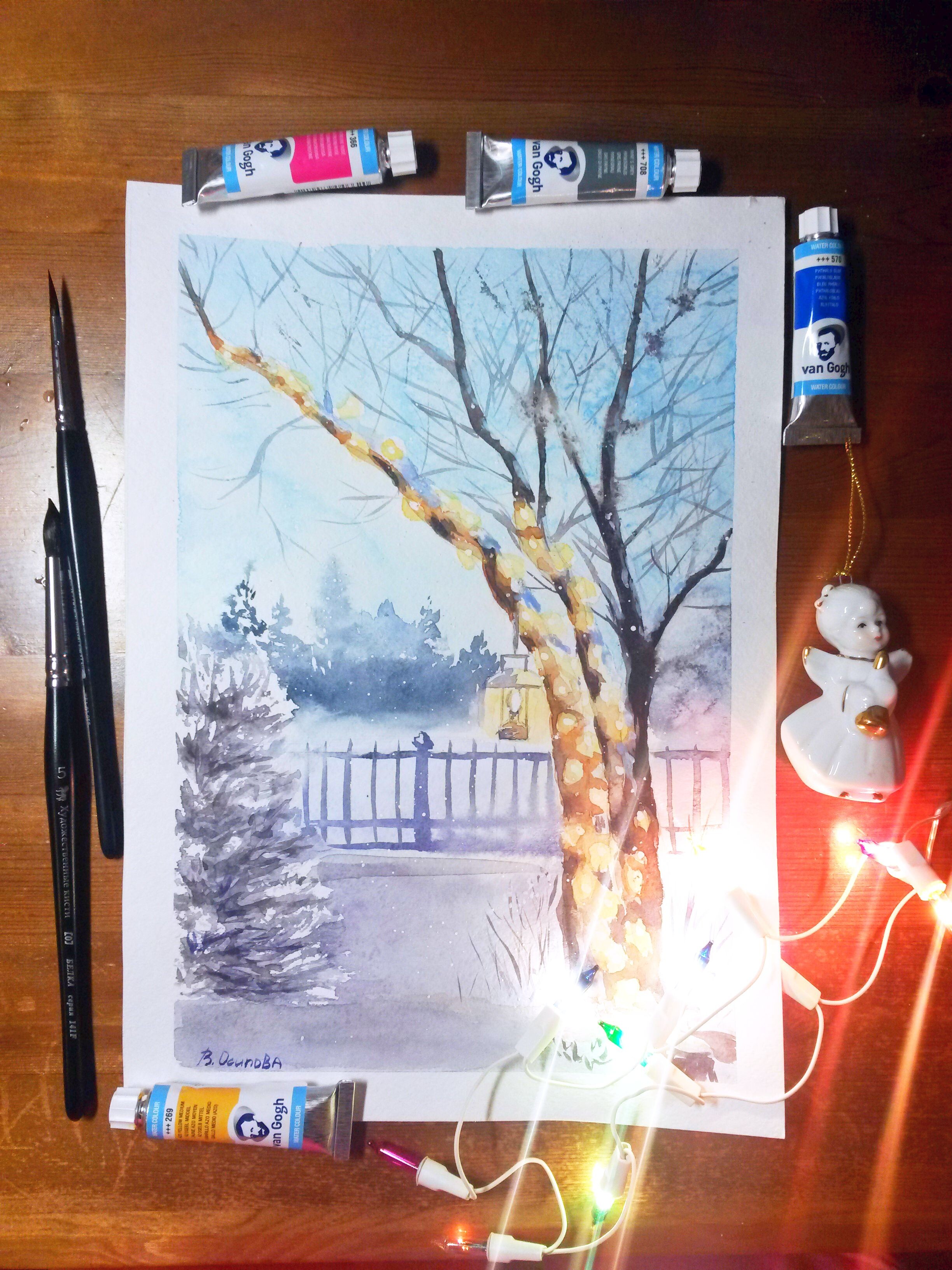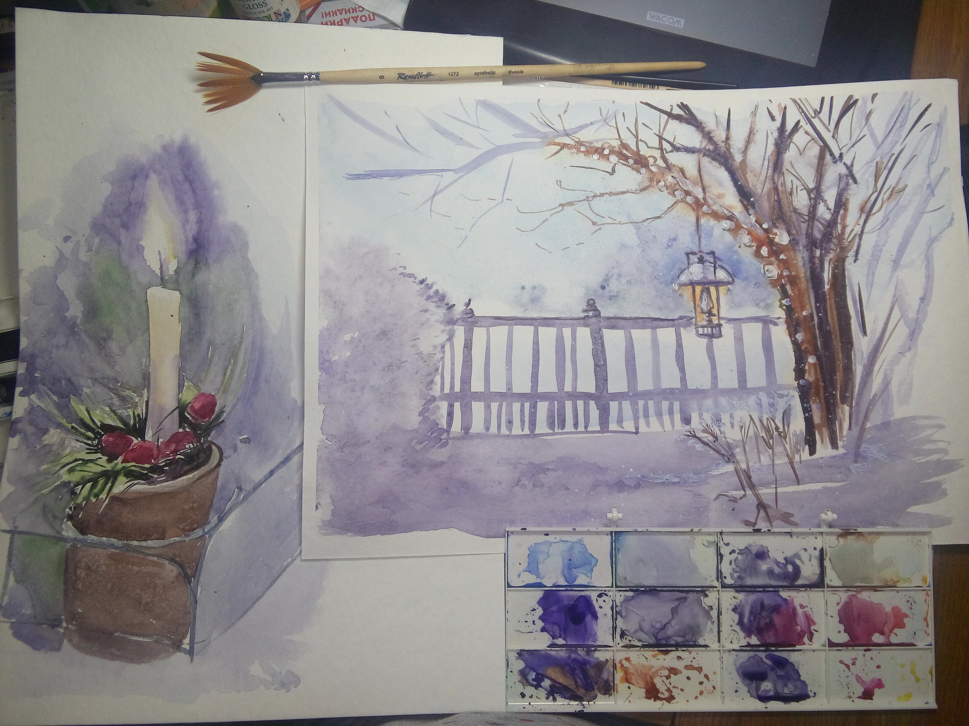 Мы будем рисовать романтичный заснеженный пейзаж. Научимся передавать красками все оттенки снега, освоим необычную технику изображения искрящихся снежинок и попытаемся уловить и запечатлеть на бумаге рождественское настроение.